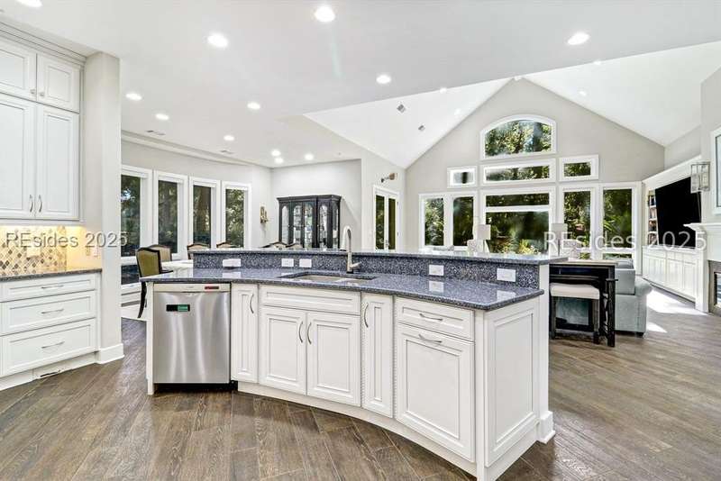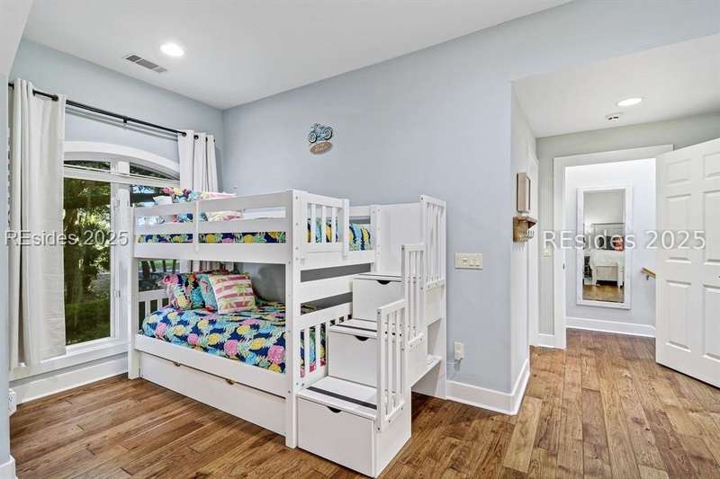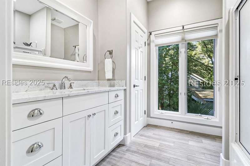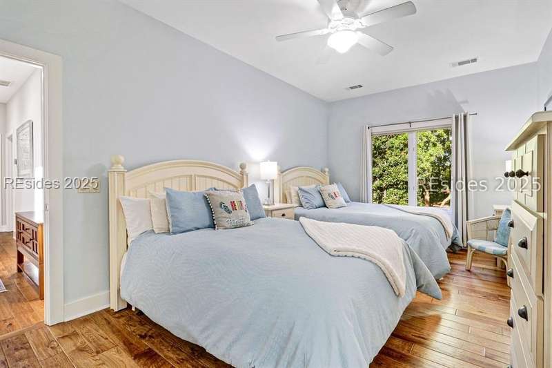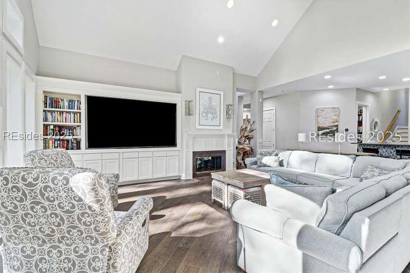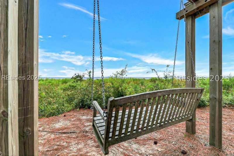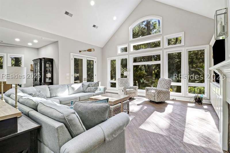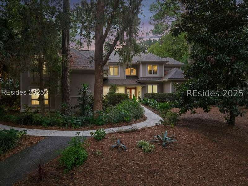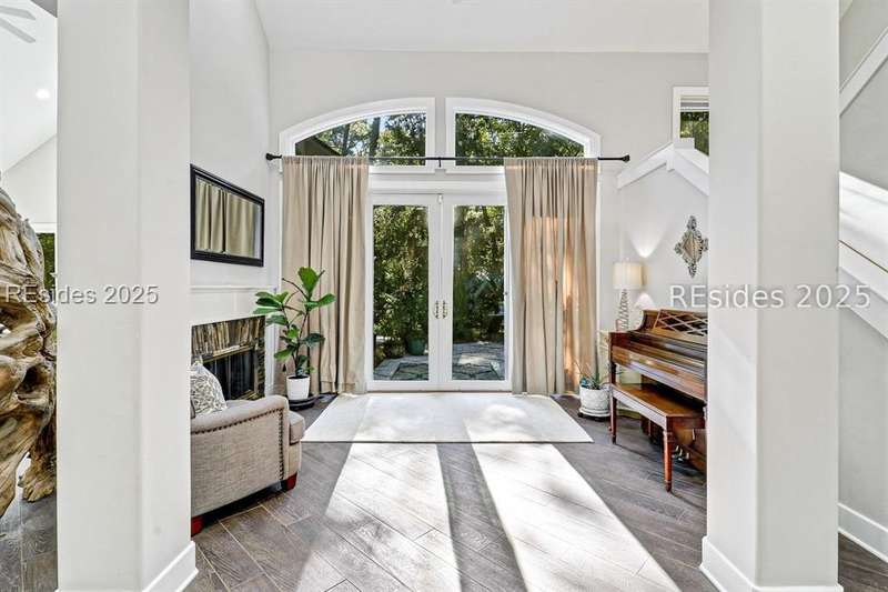 Only 300 yards from the sand, this Port Royal home ensures the Beach is part of your everyday life. The custom floor plan pairs coastal ease with modern design, set on an oversized (.86 acre) corner lot w a golf view. Inside, soaring ceilings and an open inviting layout create a light-filled gathering space with fireplace, dining, kitchen, beverage bar, and walk-in pantry. A welcoming front room with fireplace, primary suite, office, guest room & laundry complete the main level. Upstairs, a split design offers three more guest suites, including a bunk room retreat perfect for family & friends. Outdoors, enjoy lush gardens, open & covered patios designed by master gardeners. Living in Port Royal means access to private beach access, a beach house, lap pool, fire pits, leisure trails, pickleball, tennis, playground, community gardens, and 24-hour security in Hilton Heads only private oceanfront community with no short-term rentals. A warm & social setting.