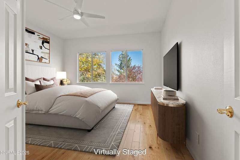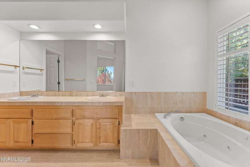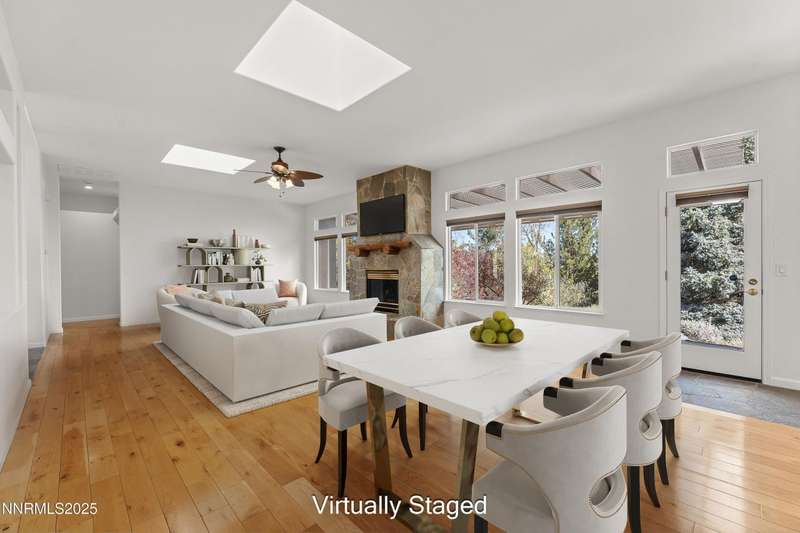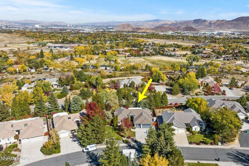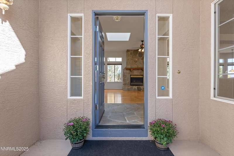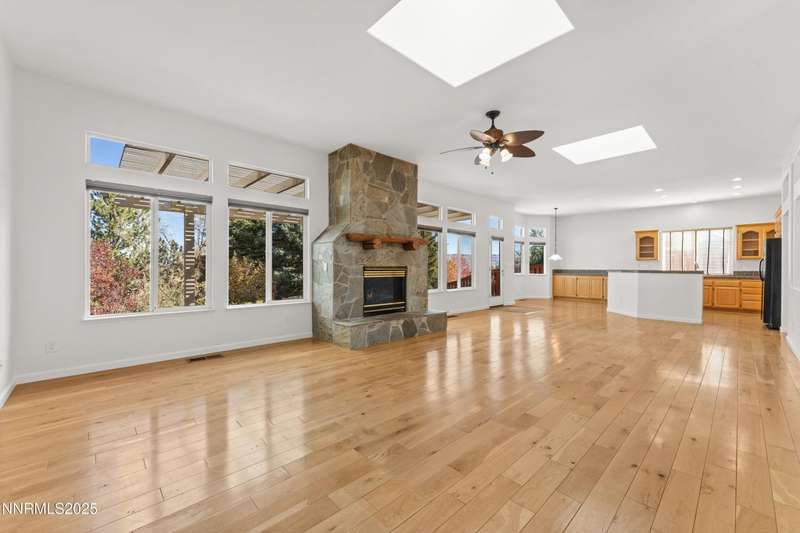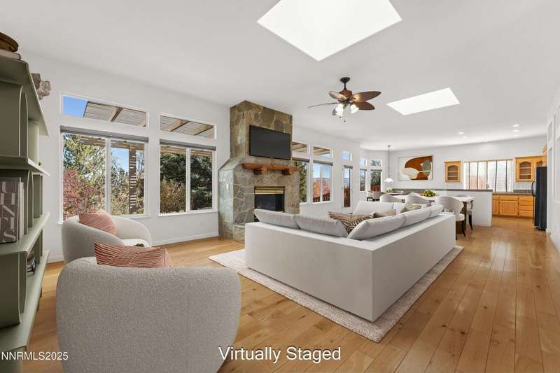 Single-level home Southwest Vistas Pergola-covered patio Low-maintenance backyard with turf Set in a desirable South Reno community, this single-story home offers 2,276 sq ft of bright, open living on a 0.35-acre parcel with an attached 3-car garage. The home includes four bedrooms and two-and-a-half baths, all on one level for accessible, comfortable living. The well-designed floor plan centers around a spacious great room with 9-ft ceilings, hard wood flooring, and a custom stone fireplace with a log mantel. The open dining area connects seamlessly to the kitchen, which features granite-tile counters, double ovens, abundant cabinetry, and a bay-window breakfast nook overlooking the backyard. Recent updates include new interior and exterior paint, updated LED lighting throughout, new electrical plugs and covers, and new bedroom carpet. Hunter Douglas pleated shades, and skylights enhance the natural light. A large laundry room with a sink, countertop and additional cabinets for storage add convenience. Outdoors, enjoy a private, low-maintenance yard with turf and a pergola-covered patio, perfect for relaxing or entertaining. Steps from the back yard lead directly to the neighborhood walking path and open space. The Stucco construction with a concrete-tile roof provides lasting durability. Conveniently located near shopping, dining, and recreation: approximately 2 miles to Raley's and Starbucks on Wedge Parkway, 3 miles to The Summit Reno, and easy access to Damonte Ranch Parkway, Mount Rose Highway, and area trail networks. Move-in ready and beautifully maintained home.