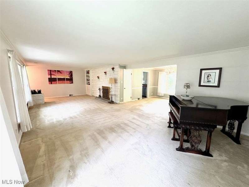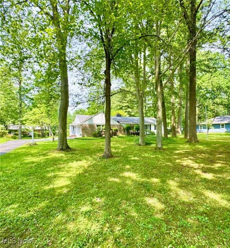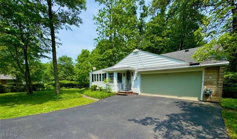 Lovely ranch in the desirable Worton Park neighborhood of Mayfield Village. On a deep front lawn with mature trees, the home is nestled and set back from the street. Recently painted clapboard and stone exterior leads to a covered front door. Tiled foyer opens to large living room with fireplace and expansive windows across the front of the home. Dining room is open to the living room and features a big window overlooking the beautiful rear lawn. Eat-in kitchen with stainless appliances features white cabinetry, good pantry space and sliding doors for access to the yard. Vintage blue tiled full bath with tiled shower is located in the short hallway that leads to the home office (could also function as third bedroom) with private entrance and inviting bay window. This could also serve as a private in-law suite. Off the office is a spacious sunroom/family room with loads of natural light from the large windows and an integrated laundry space. Down the hallway off the dining room are two generous bedrooms with hardwood flooring and a marble tiled full bath with tub/shower combo. Enjoy the gorgeous back yard with great shade tree coverage and a charming shed - ideal for relaxing or hosting gatherings. This home has been responsibly maintained including exterior painting of the home in September of 2022 and painting and reroofing of the shed in 2024 . Convenient access to freeways, restaurants, shopping, grocery, community center, parks, schools and more. Make this gem your home today!