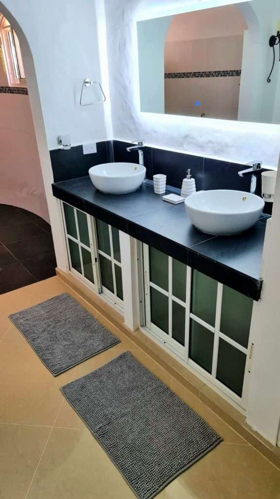 The 6 bedroom, 4 bathroom vacation rental villa in Sosua showcases two modern villas located in a tropical and private setting. The main villa features 4 spacious bedrooms, 3 bathrooms and the guest house features 2 bedrooms, 1 bathroom. The main Villa has an indoor open living area for entertaining large groups featuring cathedral ceilings, a breakfast bar, a chic dining area, and a brand new kitchen.