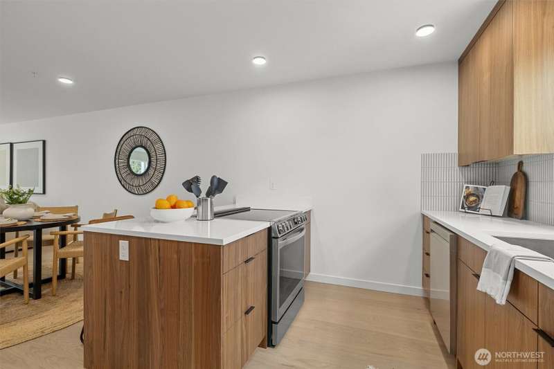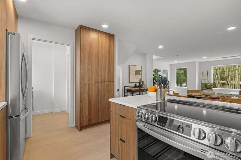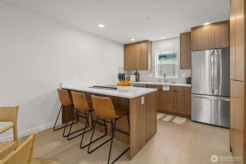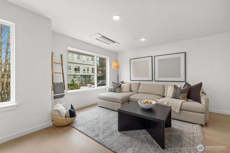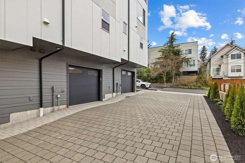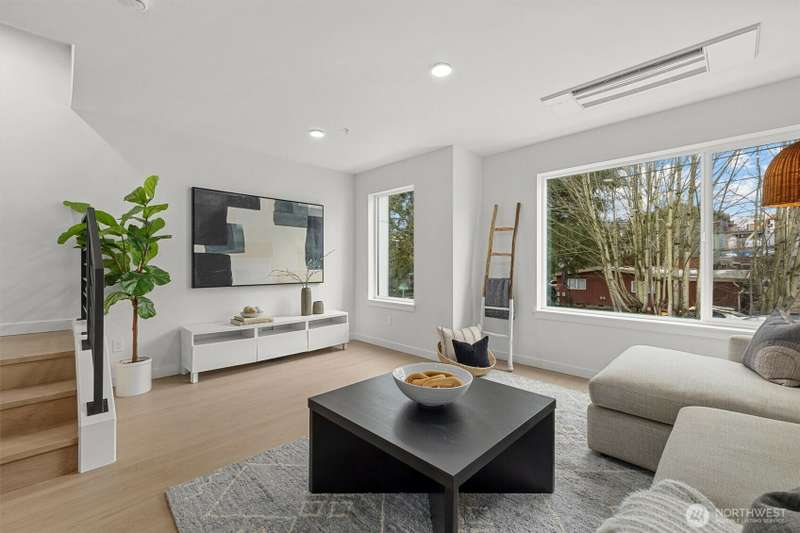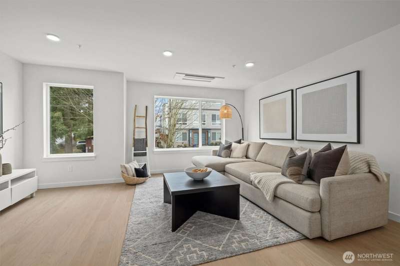 New Modern Quality built Townhome with large garage on quite street in convenient Northgate. Easy access to stores, Restaurants, Coffee & I-5, Spacious & light living & dining room with wide plank Hardwood floors, Lots of tall windows facing west, High ceilings, Custom steel handrails with hardwood stairs, Large Gourmet kitchen with Island, Quartz counters & undermount sink, Stainless steal High end appliances , Lower floor with guest bedroom, Top floor with Master bedroom & bath, 3/4 tile shower & large walk-in closet, Mini splits for heating & cooling, Roof deck with nice MTN & territorial views.