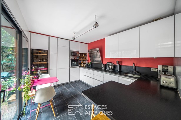 An entrance hall opens onto a living room characterized by large, wide bay windows offering a view and direct access to the tree-lined terrace. A 36 m2 living room with clean lines, reminiscent of an industrial loft, adjoins a fully equipped modern kitchen.
