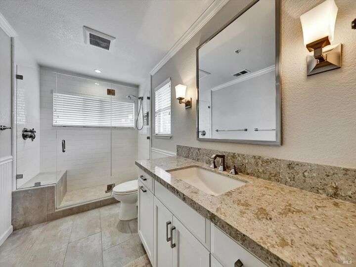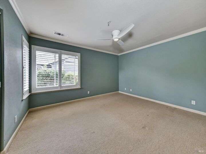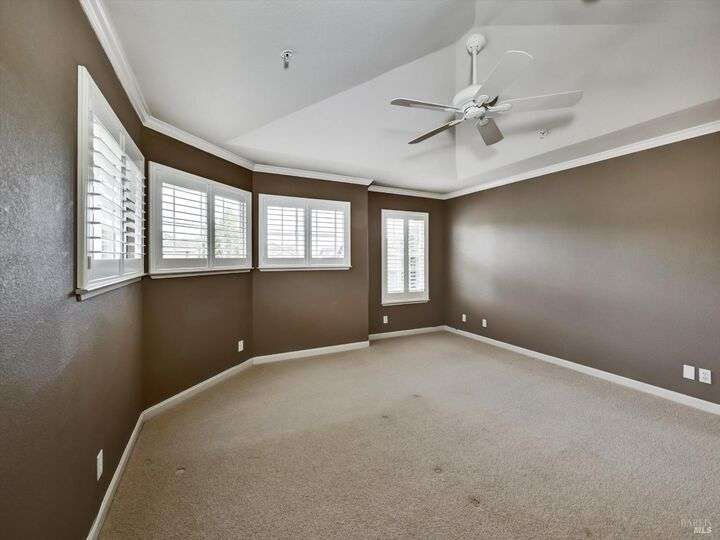 A wonderful, spacious, stylish, contemporary and comfortable home with 3 bedrooms, 2.5 bathrooms, a living room and a family room - both with fireplaces - in the Baypoint Lagoons-Spinnaker Point, a Hidden Gem of Marin County. The spacious living area features high ceilings and hardwood floors on the first floor with formal dining, Plantation shutters and crown molding add to the charm. A detached house with a wraparound, low maintenance fenced yard. The upgraded kitchen offers marble counters and stainless appliances, including a gas range and oven, and a built-in microwave. Central heat and air conditioning. Updated 2-car garage, fresh paint and epoxy with lots of shelving for your storage. All bedrooms are upstairs, carpeted, including a vaulted-ceiling primary suite with two walk-in closets with custom shelving and dividers, and a gorgeous spa-like bathroom, double sink and a spacious stall shower. Ceiling fans in every room, with a washer and dryer closet upstairs. The secondary bath is also beautifully remodeled. Fresh paint in the entire house. Enjoy a great community pool with a view of the lagoons; tennis courts. No pets. A very walkable 3-mile path around neighborhood. Tenant pays for utilities. Proximity of Highway 101 and I-580 with access to the entire SF Bay Area.