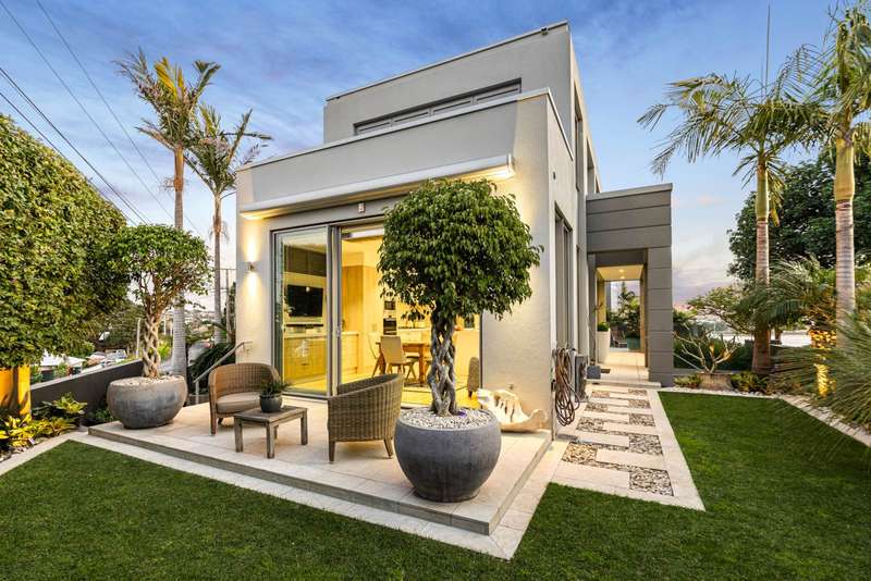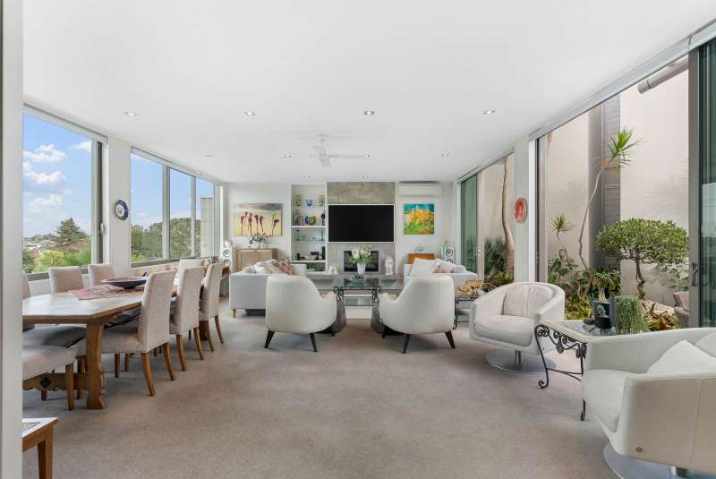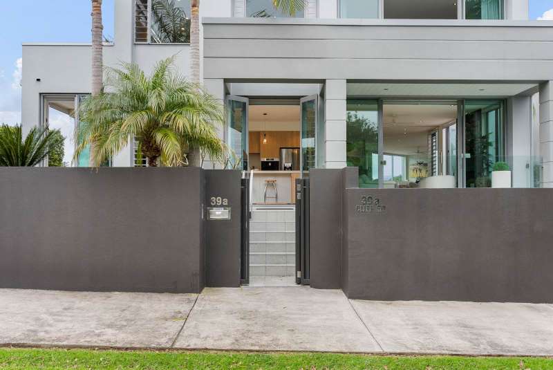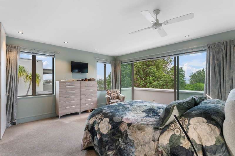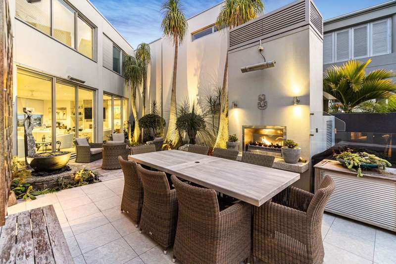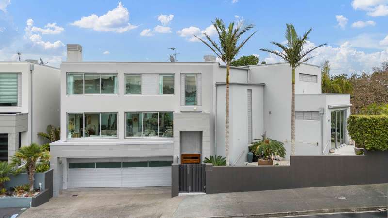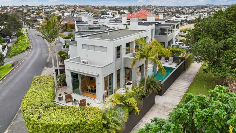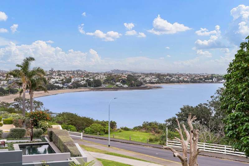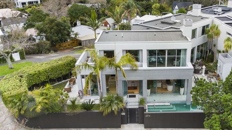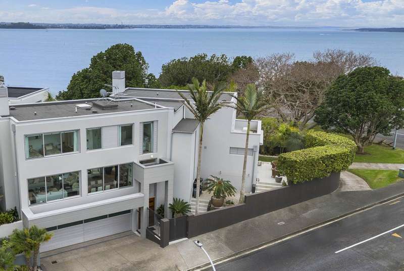 This majestic Brent Hulena-designed residence occupies a prized dual-access corner site in one of Auckland's most tightly held and exclusive beachside neighbourhoods. Constructed from concrete and spanning approximately 423 sqm across three luxurious levels with elevator access, the home combines timeless architecture with exceptional functionality. Bordering a reserve and footpath, the property enjoys a rare sense of seclusion while capturing framed views of the village, harbour, beaches, and distant city skyline. Set on 436 sqm (approx.) of lush subtropical gardens, it features a private in-ground saltwater pool and multiple sun-drenched outdoor living areas, including a sheltered alfresco zone with an open fireplace. Inside, a generous central foyer leads to two distinct living areas separated by cavity sliders-one a carpeted formal lounge, the other a timber-floored family and dining zone. Both offer gas fireplaces and seamless flow to outdoor spaces. The north-facing aspect bathes the interior in natural light, enhancing the sleek designer kitchen with Bosch dual ovens, gas hob, stone waterfall island, and warm timber cabinetry. Upstairs, four generous double bedrooms and three beautifully tiled bathrooms include a luxurious master suite with private balcony, walk-through wardrobe, and an opulent ensuite featuring a freestanding Victoria + Albert bathtub and dual vanities. Additional features include a powder room, full laundry, wine cellar, and internal access to triple garaging. Securely walled and gated, with select rooms air-conditioned and the gardens professionally landscaped, this outstanding home offers privacy, security, and effortless family living in a world-class coastal location-just a short stroll from village shops, cafes, restaurants, parks, and in zone for St Heliers School.