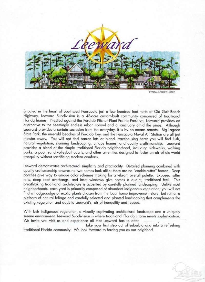 Build your Dream Home on this cul-de-sac lot (Lot 141) n the beautiful community of Leeward! This charming coastal community, Leeward is a private community known for its custom-built homes in the traditional Florida style. Amenities include a community pool, sidewalks, underground utilities, park, and sand volleyball court. Located close to NAS Pensacola, Perdido Key, Johnson's Beach, Big Lagoon State Park, shopping and downtown Pensacola. This exceptional cul-de-sac lot and is one of the bigger lots in the subdivision. Does need to be cleared. Please see the Documents section for all documents related to the neighborhood, building, and disclosures. 2024 taxes: $822.81 and 2025 HOA fees $1260 plus $190 annual fee for right of way maintenance for vacant lots.