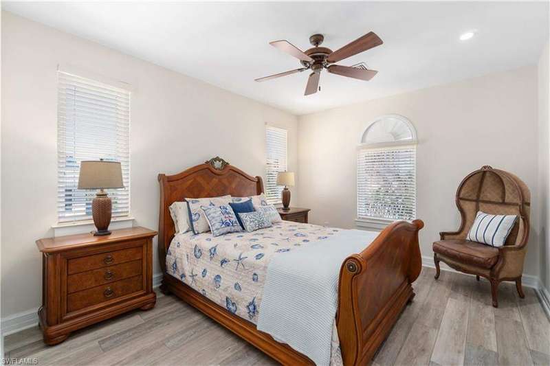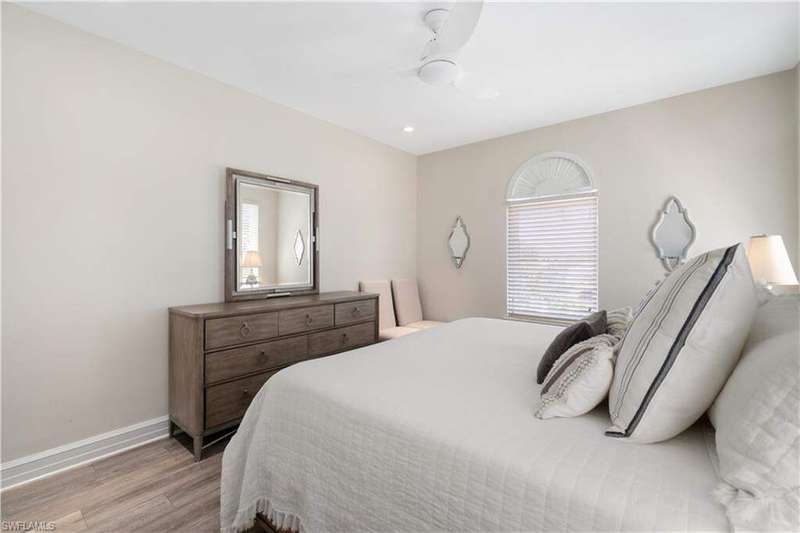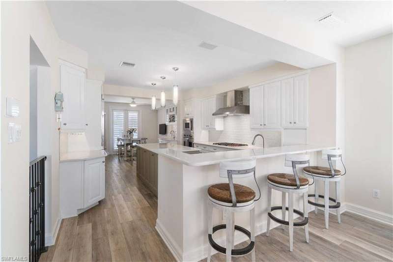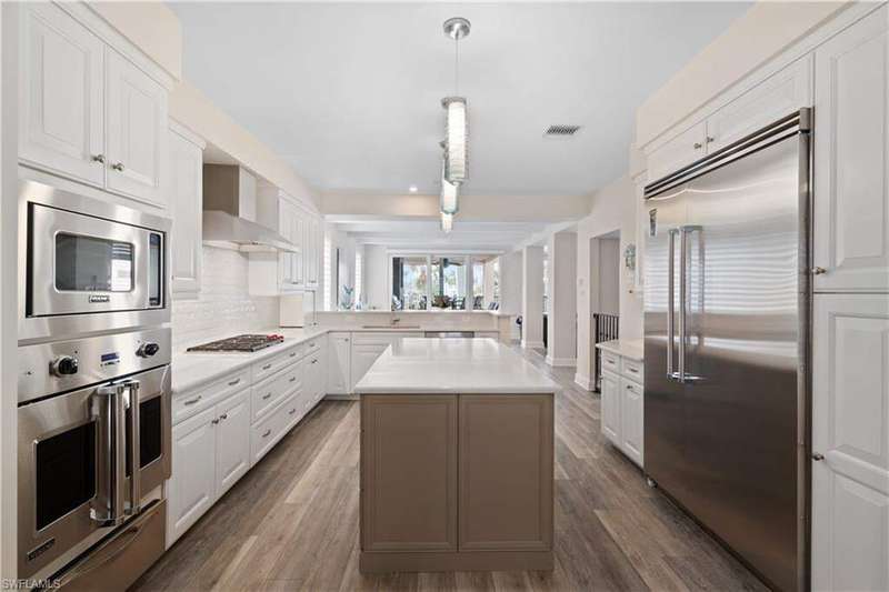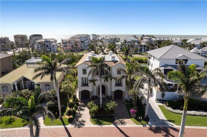 Exquisitely renovated & coastal contemporary Gulf-access estate nestled within the exclusive, double-gated Southport on the Bay in North Naples' highly sought-after Barefoot Beach community. With coveted WEST exposure, you'll enjoy SPECTACULAR SUNSETS and PRIME SUN over the RARE ELEVATED POOL & POOL DECK! A true paradise for boaters and beach lovers, this property boasts direct Gulf-access in minutes (no bridges) and is just a short 5-minute walk to the pristine shores of Barefoot Beach. Designed for the ultimate waterfront lifestyle, this home features a private boat dock and a new boat lift with a canopy. Inside, you'll discover 4 spacious bedrooms, a den, a large bonus room, 4 bathrooms, 4 half baths, a private elevator, versatile ground-floor flex space, and a garage that accommodates 6+ cars. This residence showcases a coastal contemporary design with an open, light-filled interior, soaring ceilings, and wood-look tile flooring. Additional features include a new roof (2022), hurricane impact windows and sliders, and hurricane shutters. Step outside to your personal outdoor haven, complete with an elevated pool and spa, a cozy fireplace, pool bath, and a summer kitchen designed for the perfect al fresco dining experience. The stunning chef's kitchen boasts white quartz countertops, sleek white cabinetry, white tiled backsplash, abundant storage, high-end appliances, and an adjacent wet bar-perfect for entertaining. The expansive primary suite, located on the main floor, features private access to the pool deck, as well as a spa-like bathroom with dual vanities, a generous shower with a rainfall showerhead, and a separate soaking tub. Upstairs, you'll find three additional bedrooms, a den, and a bonus room complete with a wet bar and beverage cooler, along with multiple balconies offering stunning water views. This private retreat is perfect for hosting guests or simply enjoying your own space. Optional membership to the exclusive "Club at Barefoot" provides access to tennis, two restaurants, beachside food and beverage service, and more. Conveniently located near fine dining, RSW Airport, Mercato, and Waterside Shops, and just 15 miles from the renowned Fifth Avenue in Naples, this home is a true gem in the heart of Barefoot Beach.