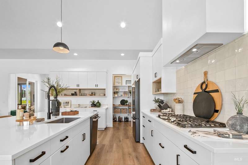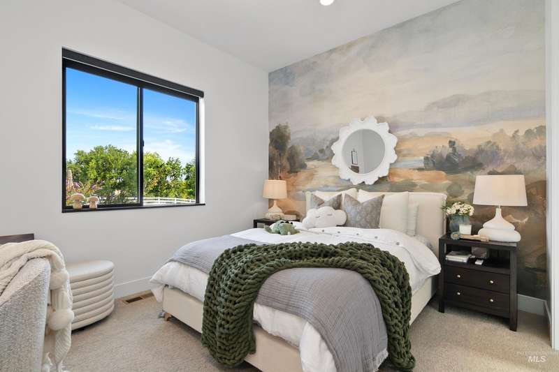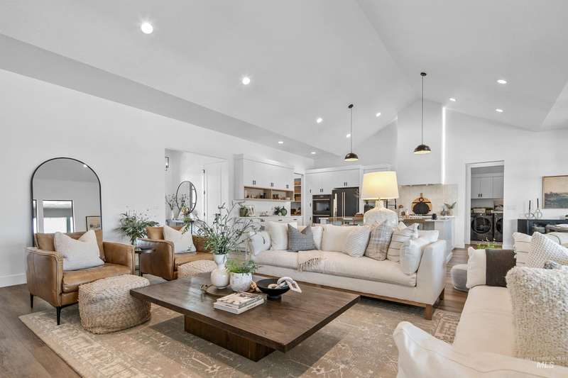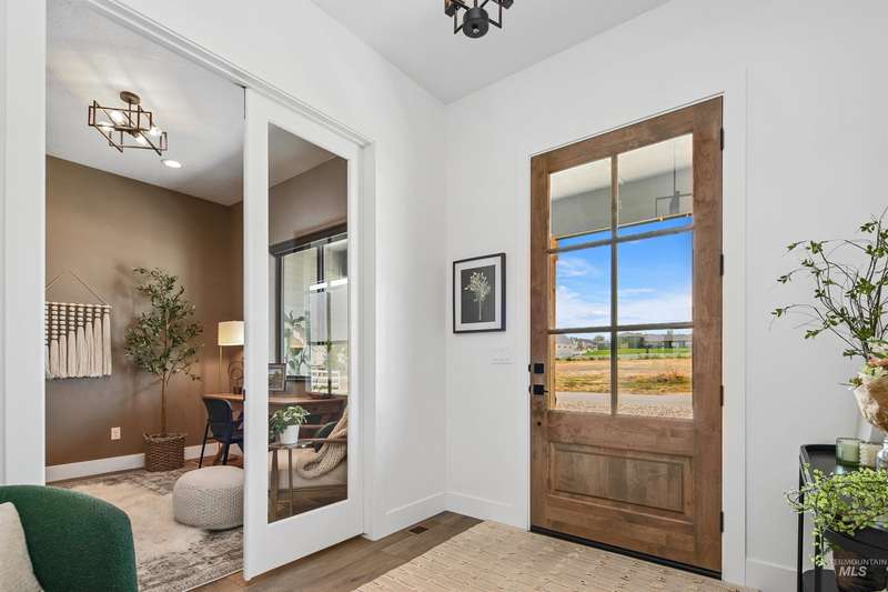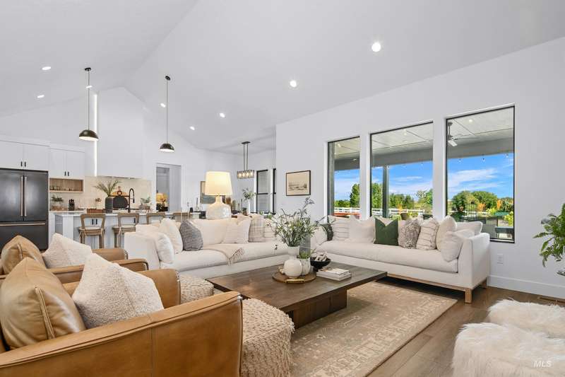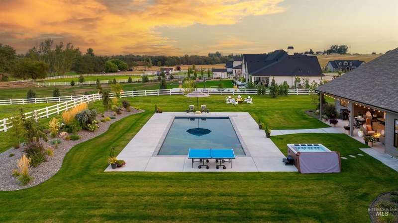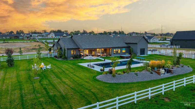 A rare 2-acre modern farmhouse ranch retreat near Middleton, where refined design meets Idaho’s natural beauty. Interiors are graced with soaring vaulted ceilings, remote-controlled shades, wide-plank white-oak LVP flooring, custom paint, curated wallpaper, wainscoting, and board-and-batten accents. At the heart, a showpiece farmhouse kitchen with an enormous island and country pantry inspires both daily living and elegant entertaining. The spa-inspired master suite offers heated floors, large dual vanities, soaking tub, and private hot-tub access. Outdoors, indulge in resort-style living with a new 22'x44' sport pool, party-size hot tub, stone water feature, fire pit, and light-strung patio. New horse fencing, auto-waterers, sand arena, and pasture complete the estate. A 50’ RV bay w/ pass-through, epoxy-finished garage w/ EV wiring, pressurized irrigation, and high-speed connectivity add modern ease. With 4 bedrooms, junior suite, 3.5 baths, den, & rec room, this is luxury Idaho living at its finest!