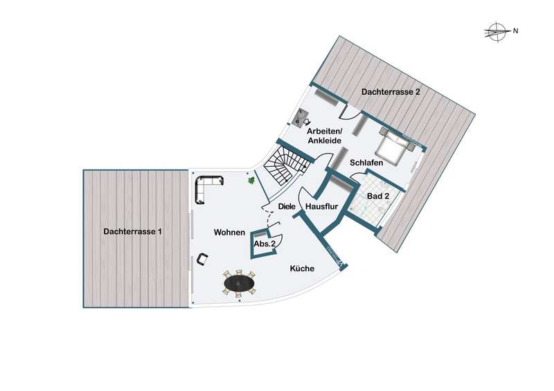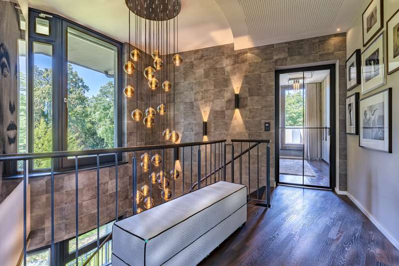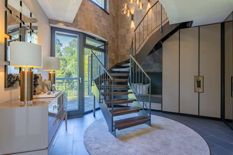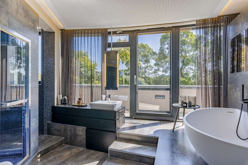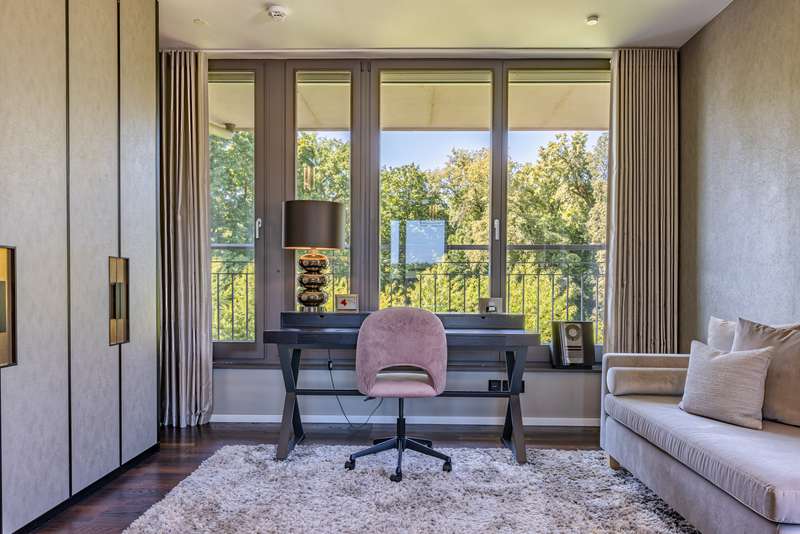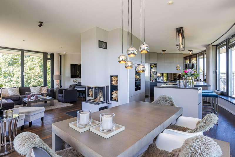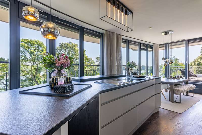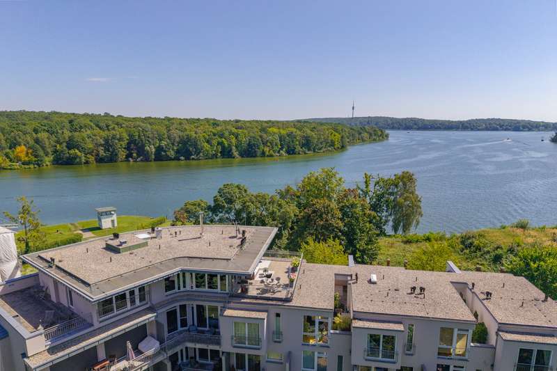 Welcome to one of Potsdam's most exclusive addresses - Bertinistraße This extraordinary penthouse with approx. 225 m² of living space is enthroned on the top floor of a modern building (built in 2009) and combines architecture, location and lifestyle in an incomparable way. As soon as you enter, a light-flooded entrance opens up, immediately drawing the eye to the open and spacious interior design. High-quality materials, fine parquet flooring and floor-to-ceiling windows create an ambience that is both modern, prestigious and inviting. Living with a panorama The spacious living/dining area with open luxury kitchen (including Gaggenau appliances, teppanyaki, wok hob, water treatment system, Miele appliances) is framed by all-round window fronts that not only provide maximum brightness, but also a spectacular panoramic view of the water and Potsdam's famous cultural landscape. A high-quality fireplace also creates a cozy atmosphere and underlines the exclusive living comfort of this extraordinary space. The master bedroom is located on this floor and has an elegant dressing room and a work area with a fantastic view of the garden. The designer shower room is directly adjacent to the bedroom. From here you have a direct view of the water. From the terraces you can enjoy a 360° panorama, the view over the Jungfernsee, the towers of Babelsberg Palace, the green expanse of the New Garden with the Marble Palace and, very close by, the world-famous Cecilienhof Palace. A view that impresses, fascinates and inspires every day. There are two further bright rooms on the lower level - flexible and individually usable. The space is complemented by a stylish daylight bathroom with designer bathtub, spacious shower with water view and steam sauna, as well as a separate guest WC and spacious entrance area. Architecture meets lifestyle The terraces - all-round, spacious and flooded with sunlight - are the real heart of this property. Here you can experience quiet mornings with magical sunrises and views of glistening water, as well as sociable evenings with guests in the open air. Absolute privacy is guaranteed. Culture & quality of life on the doorstep . Bertinistraße combines tranquillity and closeness to nature with urban exclusivity. You can reach Potsdam's cultural highlights in just a few minutes: - the new garden with the Marble Palace - the magnificent Glienicke Bridge, - the palaces and parks of Sanssouci and a lively city center with boutiques, cafés and Michelin-starred restaurants. Comfort at the highest level Barrier-free access, a modern elevator, innovative building technology, two optional underground parking spaces (€50,000 each) and a sophisticated security and energy system round off this exclusive offer. This penthouse is more than just a property. It is a statement - for people who are looking for the extraordinary.