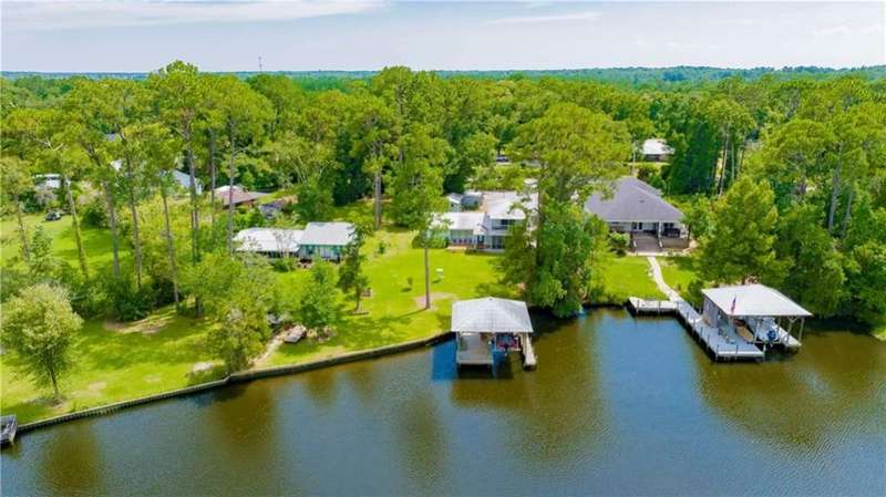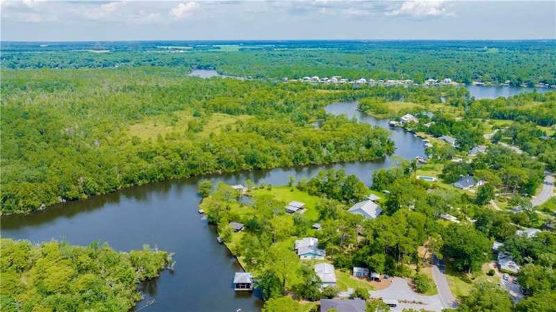 Approximately 1/2 acre river front home on Waterhole Branch, across from undeveloped acreage protected by the state. Just a 5 minute boat ride to Fish River & Weeks Bay. The raised foyer provides direct views of the river upon entering the home. Step down into the living room with solid brick floors, exposed rafters, built in shelving and a decorative hearth. The open floor plan leads into recently updated bright kitchen, with pretty cabinets and lighting. Plenty of counterspace and storage and a massive 8x5 kitchen island, all on new LVP flooring. Downstairs half bath was enlarged for easier handicapped usage, or extra room for future shower/tub installation. Two other bedrooms and full bath downstairs, with one bedroom currently used as an office. Graciously sized primary suite upstairs with walkthrough closet and fantastic river views from the metal roof balcony. A screened porch and open deck are downstairs, both with river views. The covered boathouse has electricity and boat lift. Bulkhead was repaired approx 2 years ago. Large 40 x 15 outbuilding with AC unit could be used as workshop, office or hobby room. Second outbuilding can be used as covered parking. Lot is partially fenced. No HOA but elective $25 annual fee to utilize community boat launch. All updates per owner. Buyer to verify all information during due diligence.