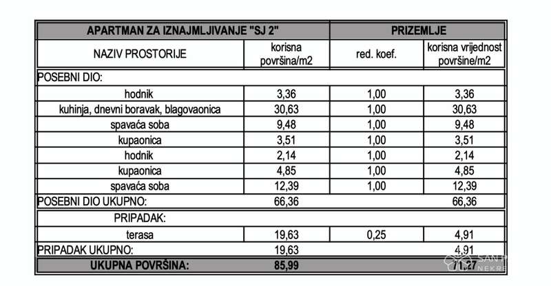 Apartment A-2 - ground floor - living area 66.36 m2 (2 bedrooms + 2 bathrooms) + terrace (20 m2 - SE) + garden (32 m2) + garage parking space + storage in the basement, net calculation area 85.57 m2 = EUR 385,065
