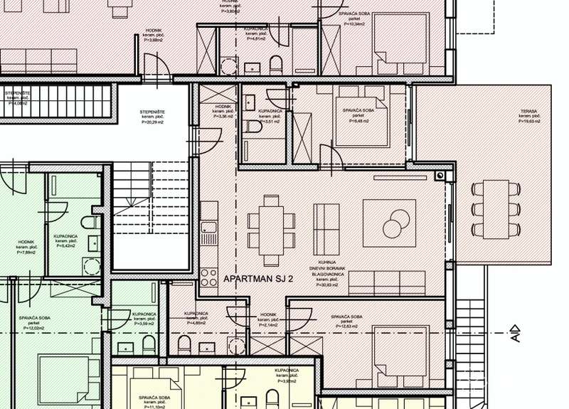 The building consists of a basement with garages and storage areas, providing residents with practical parking solutions and additional storage space. The ground-floor apartments have the advantage of their own garden, ideal for relaxing outdoors. On the first floor, the apartments feature spacious terraces and balconies that offer excellent views and space for socializing, while the second-floor apartments, in addition to terraces, have access to impressive rooftop terraces, adding a special charm and exclusivity.