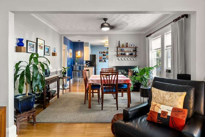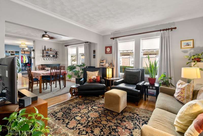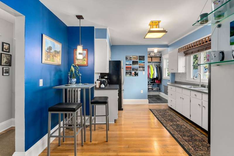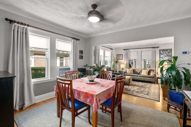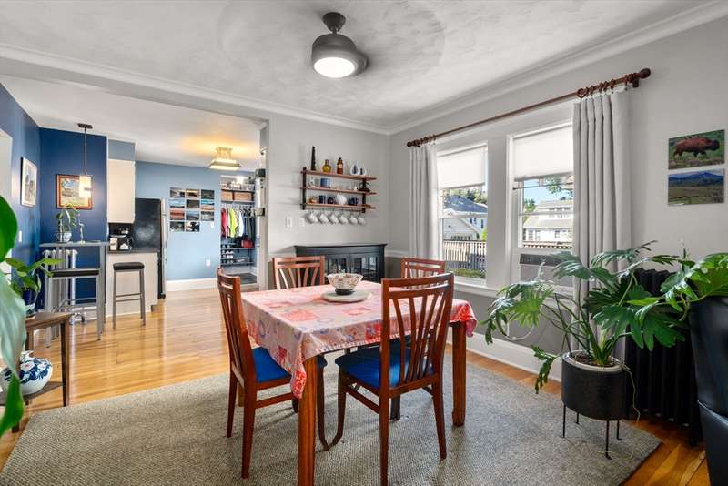 Move right into this beautifully kept first-floor 2-bedroom, 1-bath condo on a charming tree-lined street! Enjoy an enclosed, insulated, and heated front porch plus a bright, fully enclosed back sunroom perfect for year-round use. The kitchen with eating area adjoins a mudroom with slate flooring. Formal living and dining rooms feature hardwood floors throughout, with ample closet and basement storage. The bathroom offers radiant-heated slate floors, slate shower tiles, limestone countertops, and new fixtures. Custom shades included in bedroom and kitchen; dining and living room shades; bamboo shades in second bedroom and front porch; curtains not included. Shelving in front room and mudroom available for purchase. Updates: 2-year-old washer, newer water heater, Mass Save upgrades, asbestos removed 2023, back porch re-shingled 2023. Shared paver patio with gas hookup for grilling. Prime spot steps to Moody St, near Rte 20 & I-95. Property sold as is; buyers please do your due diligence
