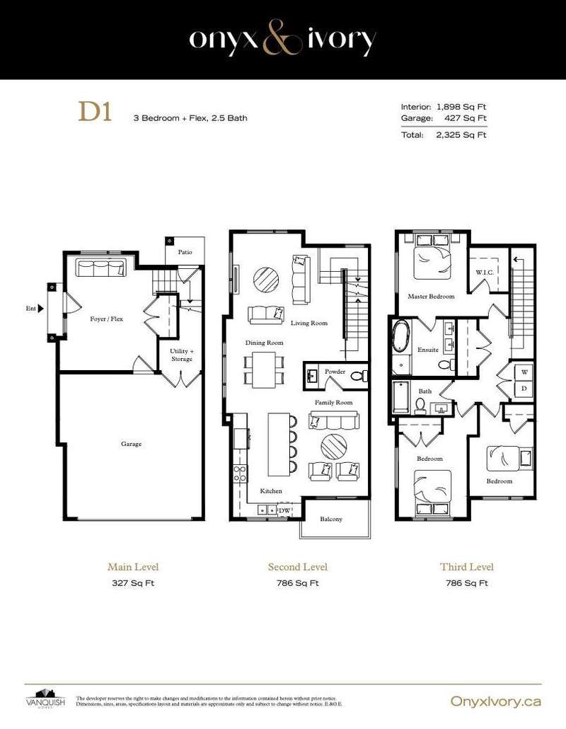 3 bed + flex END townhouse (D1 Plan) with all of the bells and whistles of a detached home! Fenced yard, dbl garage, low strata fees. Onyx & Ivory: Set in a prestigious neighbourhood, surrounded by greenery. High-end finishes incl: European appliances, gas stove, large island w/ waterfall, quartz counters/backsplash, LED pot lights, designer light fixtures & e-poxy in garage. 3 levels. Flex on main flr. Open kitchen/living/dining & powder room + balcony on 2nd level. Upstairs you have 3 beds, 2 baths, incl a stunning ensuite w/ duel sinks, walk-in-closet + side-by-side laundry. Wide-plank oak laminate throughout, forced air heating, hot water on demand + central A/C & millwork incl. Est. Completion is early 2026. Show Home in photos is different than this floorplan. Photos are of A2 plan. SHOW HOME OPEN DAILY 12-5PM (except Fridays). Pets & rentals allowed. PHASE 2 NOW SELLING! (id:58403)