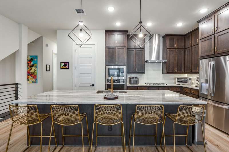 Welcome to 1053 Manacor Lane in Parkside at Trinity Green a modern, three-story home set on a premium interior courtyard lot with over $100K in builder upgrades. The open-concept main level features tall ceilings, abundant natural light, and designer finishes including Fantastic Brown Dolomite countertops, ceiling-height Gunmetal shaker cabinetry, and GE Profile stainless appliances. Upstairs, the primary suite offers a spacious retreat with quartz dual vanities, a soaking tub, and a semi-frameless glass shower. Two additional bedrooms and a full bath on the first floor provide ideal flexibility for guests, an office, or gym. The top level includes a large bonus living area, full bath, and rooftop terrace overlooking the landscaped courtyard perfect for entertaining. Enjoy a fenced yard, two-car garage with storage nook, and community amenities such as a pool, dog park, green space, and walking paths. Minutes from Downtown Dallas, Trinity Groves, and the Design District.