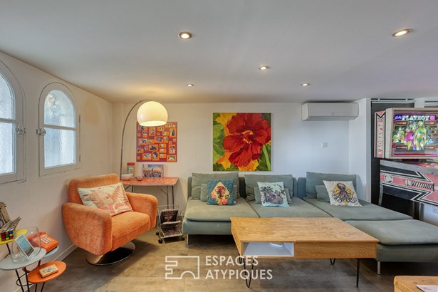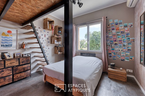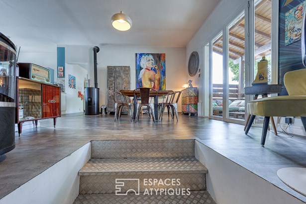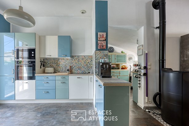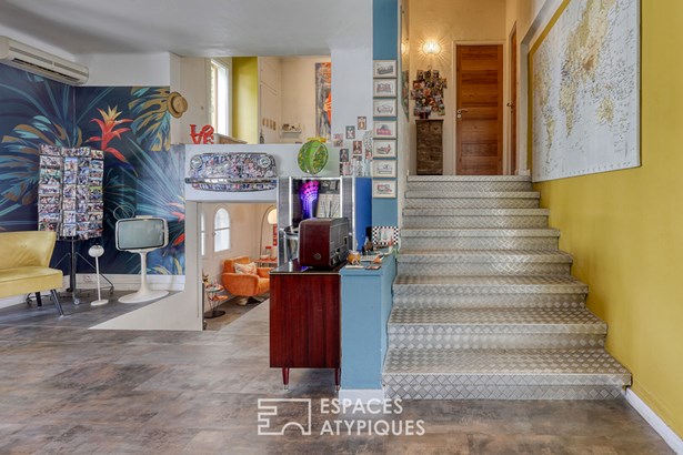 Inside, an atypical layout on different half-levels. Upon entry, a living room is revealed, composed of a fitted kitchen in pastel tones and a beautiful living room giving access to a shaded terrace.