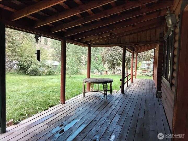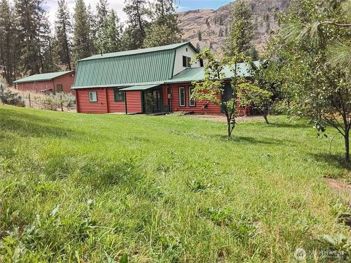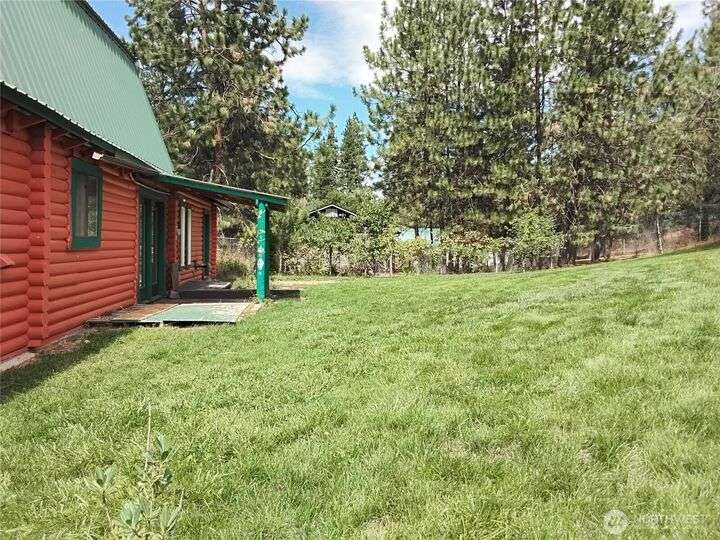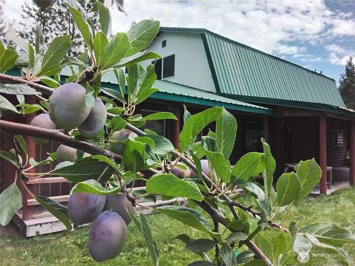 Customize your own rustic log cabin on 3+ acres in Pinecrest Estates—just 15 minutes from Omak or Tonasket! Stay cool in summer and cozy in winter while enjoying privacy in a community. The oversized 2-car garage features a finished bonus room, and the fully fenced yard is complete with garden space, a chicken coop with a run, and mature permaculture plantings, including organic pears, three varieties of cherries, grapes, and raspberries. Inside, the open-concept design features recessed lighting, a spacious kitchen with a large island, and an abundance of natural wood charm. With one bedroom on the main level and two upstairs, this home blends comfort, character, and endless potential for your personal TLC!