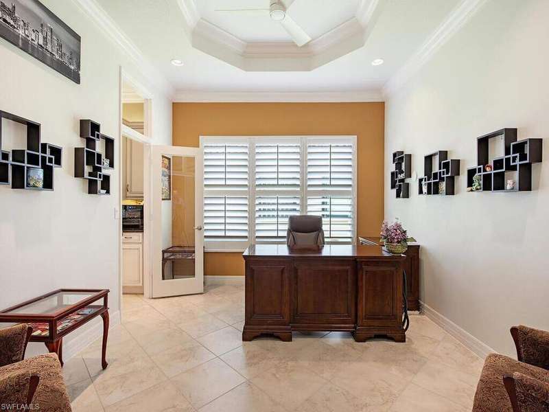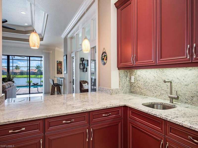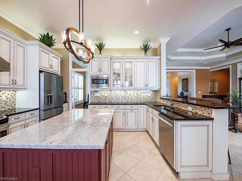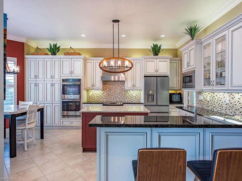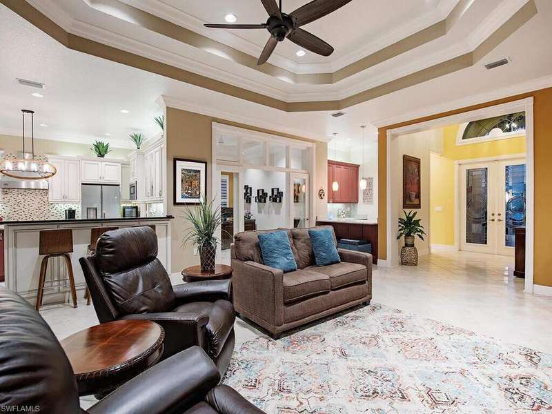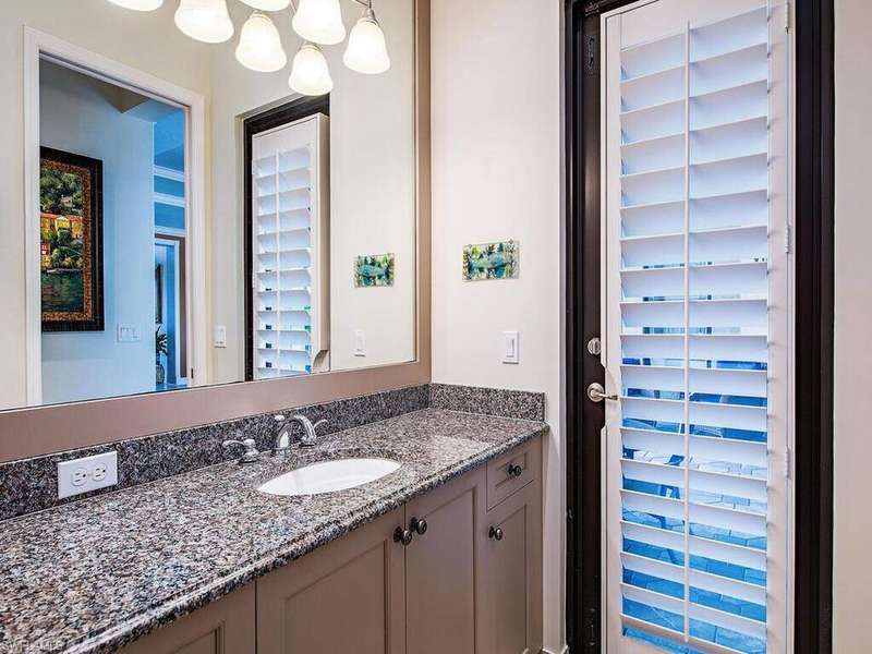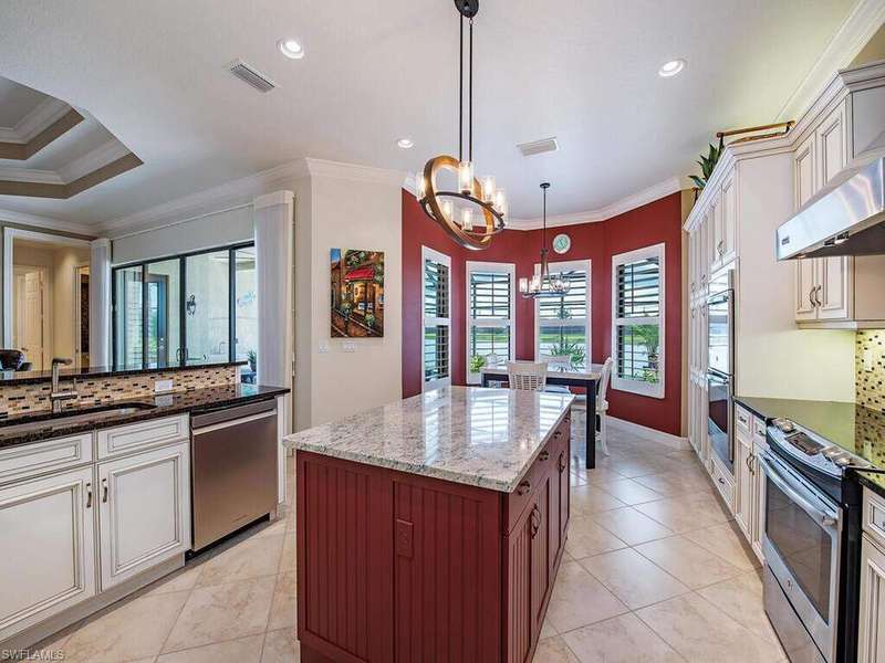 Behind the gated courtyard of this thoughtfully curated Carlyle lies a home designed for effortless living and unforgettable entertaining, where every day feels like a vacation. Step through decorative glass entry doors into an expansive, entertainer's dream layout, where the wet bar, great room, flexible dining area, and gourmet kitchen flow seamlessly to the outdoors. A sparkling lake view beckons you to the screened lanai, which offers ample room to relax or dine alfresco. Spend your days lounging by the saltwater pool, then prepare dinner in the outdoor kitchen-equipped with marine-grade cabinetry, a sink, granite surfaces, dual burners, and a 60,000 BTU wok-capable burner, all powered by a buried 120-gallon propane tank. Inside, no detail has been overlooked. The chef's kitchen features upgraded white cabinetry, granite counters, a new GE Cafe four-door refrigerator, double wall ovens, newer microwave, range with vented hood, custom pull-out shelves, and a professionally painted island. Glass atrium doors with side panels enclose the dining space, adding elegance and allowing for flexible usage. The luxurious primary suite overlooking the lake includes dual custom closets, a serene sitting area, and a renovated spa-like bath. The primary bath has been updated with a newly tiled walk-in shower with linear drain and new fixtures. Vanities feature new quartz counters, professionally painted cabinetry, framed mirrors, and Rohl sinks. Both guest suites offer private baths and walk-in closets. One ensuite bath includes a remodeled shower with frameless glass doors and new tile. The versatile club room adapts to your needs-ideal as an office, den, or media space. Additional highlights include 18" porcelain tile throughout, plantation shutters, crown molding, Hunter Douglas Luminette sheers, and built-in closets. A well-appointed laundry room offers a newer GE Profile washer and dryer, abundant cabinetry, a laundry tub, and a secondary refrigerator. The garage is equally refined with epoxy floors, insulated doors, and built-in storage. Peace of mind comes standard with impact glass throughout, a Ring doorbell, fenced yard for pets, and a generator transfer switch. Additional upgrades include a new whole-house water softener system, UV lights on the A/C, and landscape lighting. Riverstone offers a vibrant, vacation-inspired lifestyle for all ages. Located in North Naples, just minutes from I-75 and zoned for "A"-rated schools, the community features a fitness center, social hall, resort-style pool, lap pool, spa, five lighted tennis courts, outdoor basketball and pickleball, a full indoor basketball court, tot lot, children's water play area, game room, and an activities coordinator; making it easy to meet new friends. Whether hosting, relaxing, or simply enjoying the view, this home delivers the ideal setting for your Naples lifestyle.