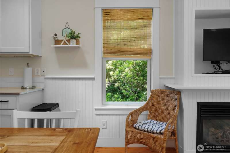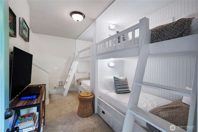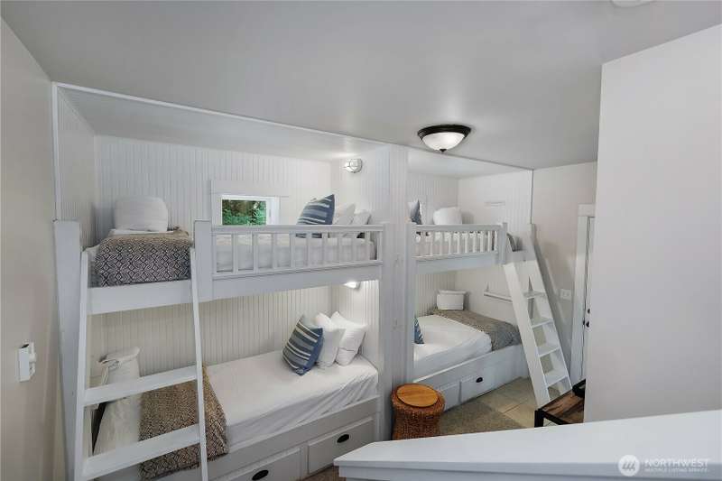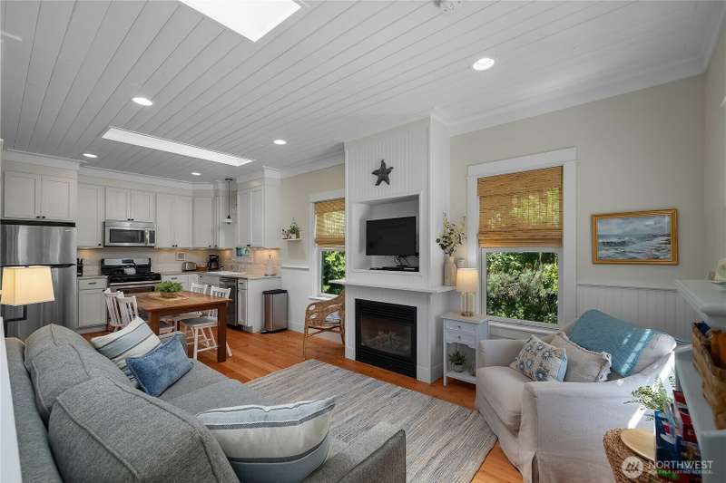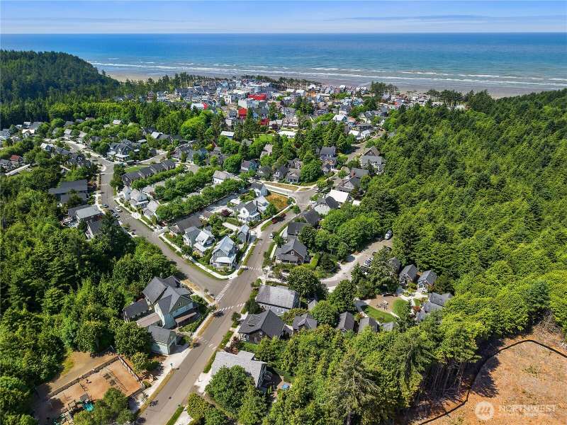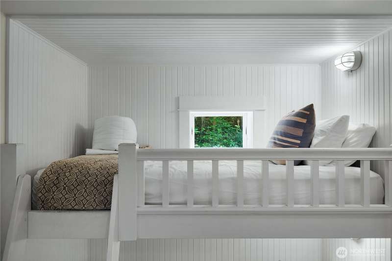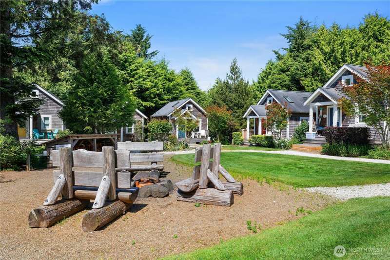 Beachy Keen is a unique two-story Beach Camp home, located on a wooded corner lot. Enjoy an open living room and kitchen with skylights, bamboo blinds, planked ceilings, and a gas fireplace. Downstairs, has high ceilings, a bunk area with built-in four extra-long twin beds with their own individual lights, shelves & drawers. The queen primary bedroom on the lower floor offers tranquil forest views. The Bathroom has a tile floor heating system. The lower level opens to a private patio surrounded by forest, featuring a bike shed, a seven-person hot tub for evening relaxation under the clear sky, with sounds of the ocean. The beach is a short walk away. This property is sold furnished, and has new carpet & new hardwood floors.