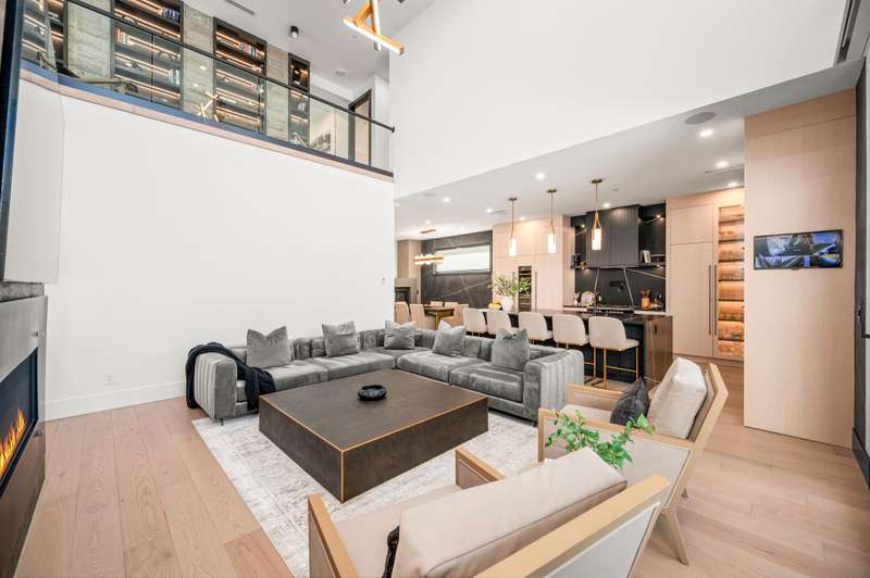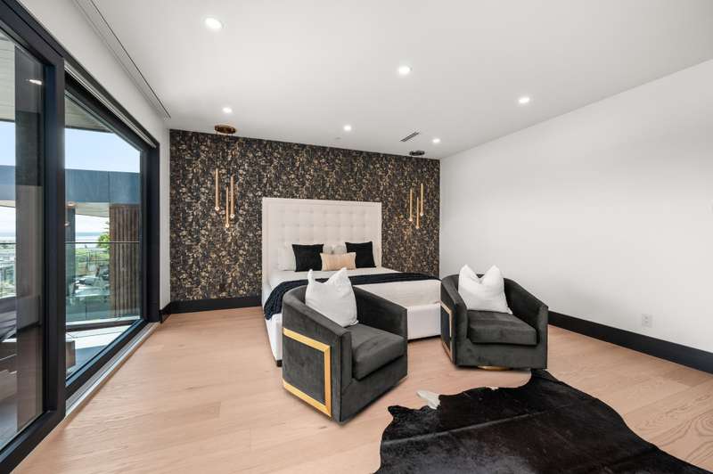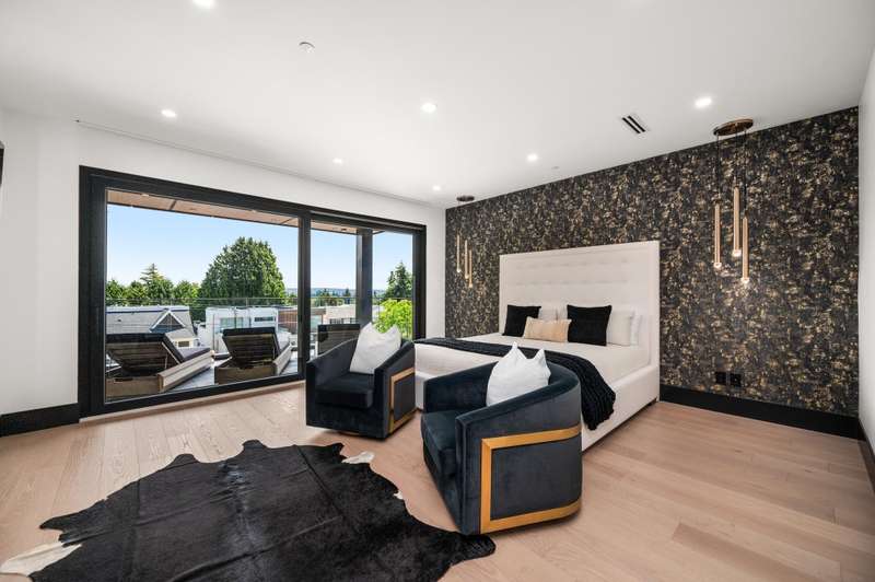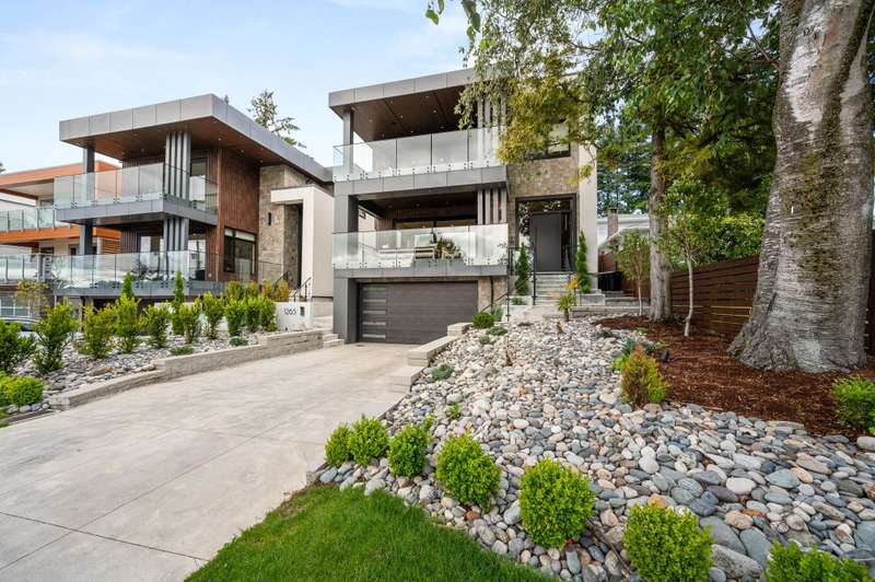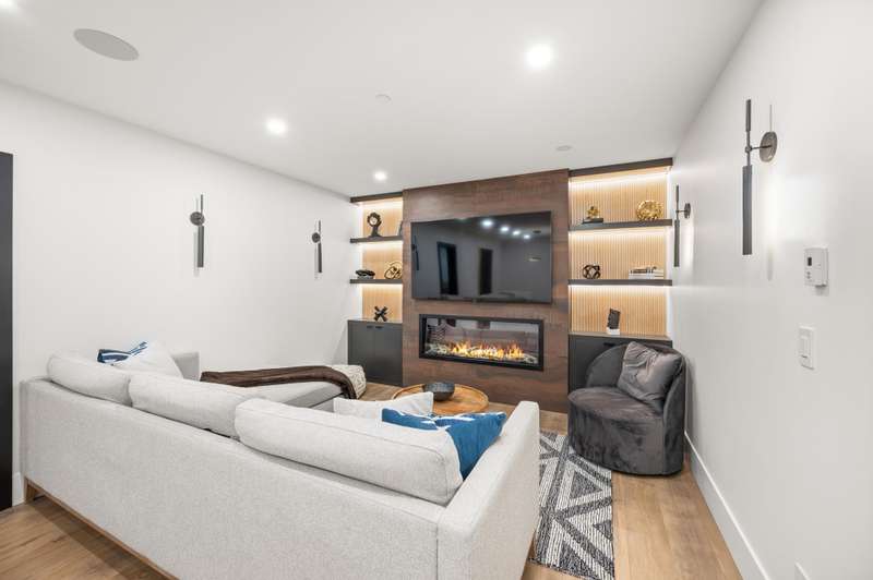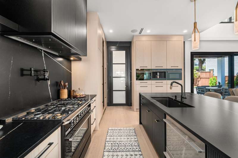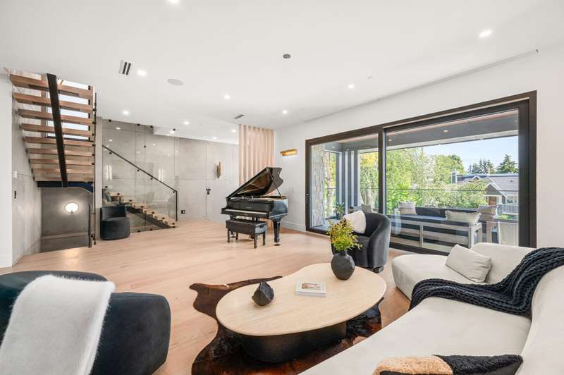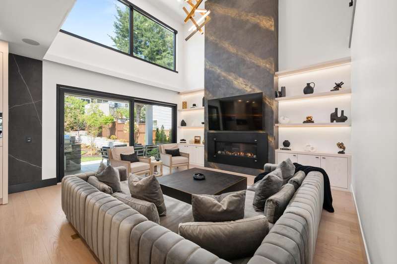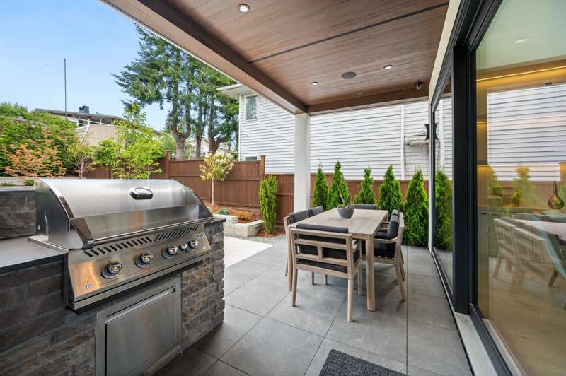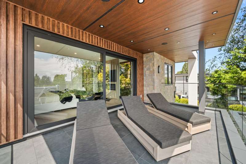 Stunning design & quality construction by Rychter Custom Homes. Elegant Hardwood, floating staircase, abundant light, & extensive wood features are just the start. Spacious covered deck access from living room with view. Radiant heat, A/C, automated blinds, Control 4 - smart home, on demand H/W, Retractable B/I Vac, Shinnoki Panel Cabinetry with integrated Liebherr Fridge, wine cooler & 24" Freezer. Fisher Paykel appliances, B/I Coffee/Espresso & Steam Oven. Spice kitchen. Covered outdoor living space with b/i barbecue station. Primary suite has open glass wall to the sundeck with view of the mountains & ocean. Add'l balcony off back bedroom. 1-bed legal suite is also registered with Airbnb. Bsmnt offers rec room with wet bar, wine storage & sauna.