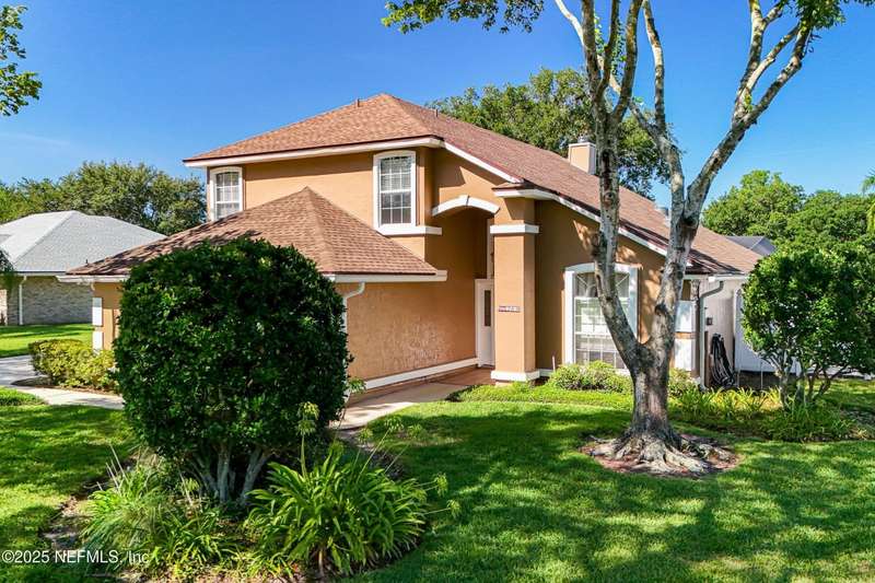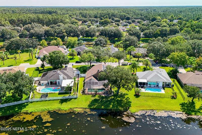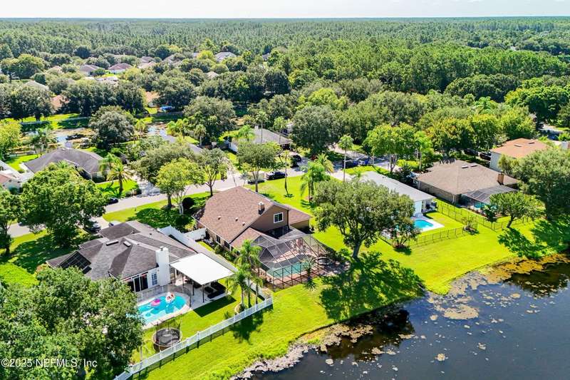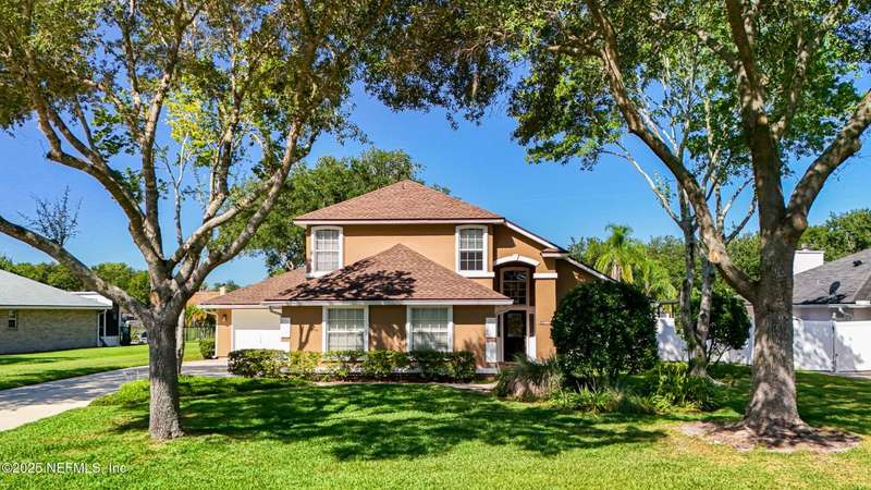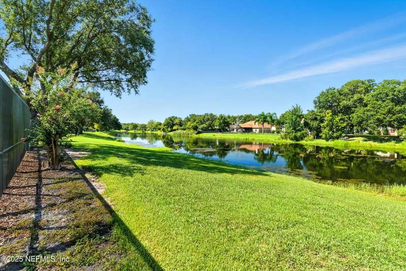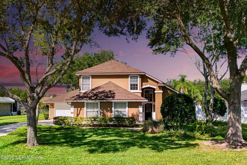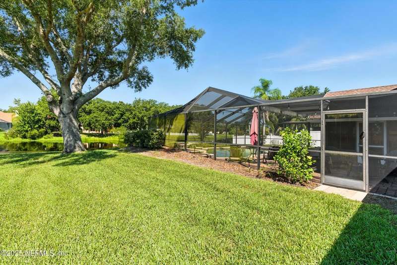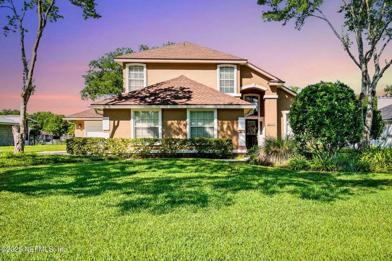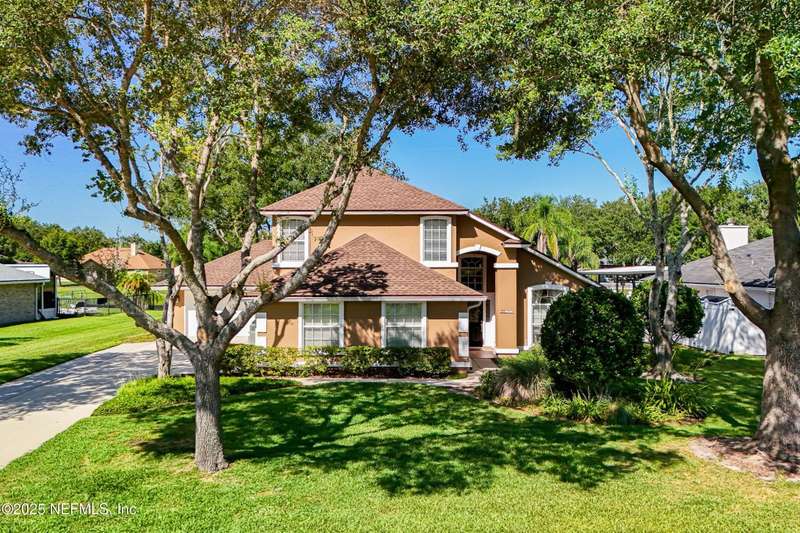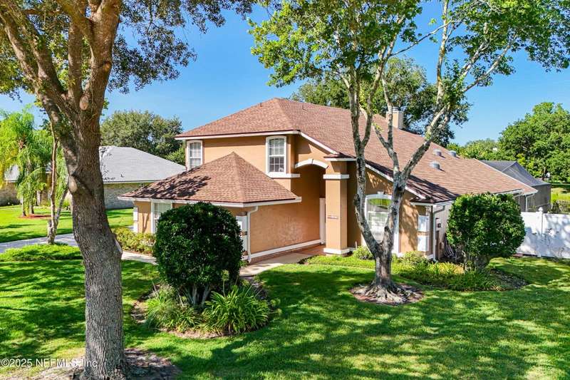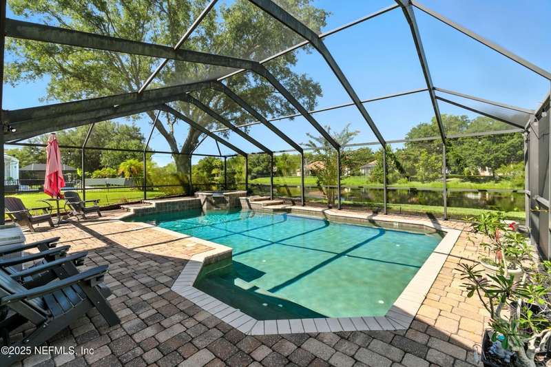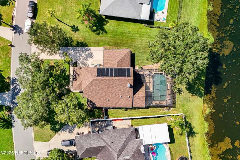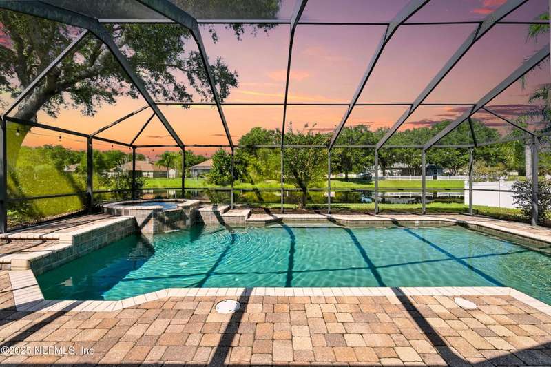Welcome to this beautifully updated & maintained 4 bed, 2.5 bath pool home in the desirable Village Green community of St. Johns. Set on a serene lakefront lot, this two-story home features a screened, solar-heated pool with spa, paver lanai, and spacious backyard perfect for entertaining. Recent updates include a new roof (2024), exterior paint (2024), skylights (2025), water heater (2023), pool automation system, and solar panels for year-round enjoyment. Inside, you'll find soaring ceilings, a bright family room, and an beautifully designed kitchen with granite counters, stainless appliances, and a new Whirlpool gas range (2025). The first-floor primary suite offers a newly tiled shower, dual vanities, garden tub, and walk-in closets. With a huge bonus room upstairs for the secondary bedrooms there are tons of possibilities! Additional features include new windows in many rooms, smart thermostat, Rainbird irrigation system, and an oversized garage. Conveniently located near A-rated schools, shopping, and dining, this move-in ready home blends comfort and modern upgrades.