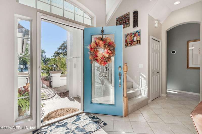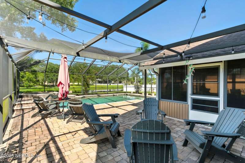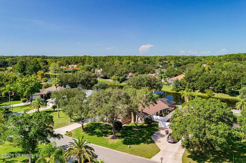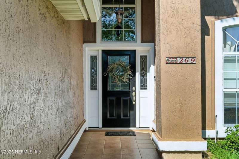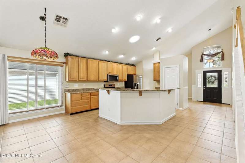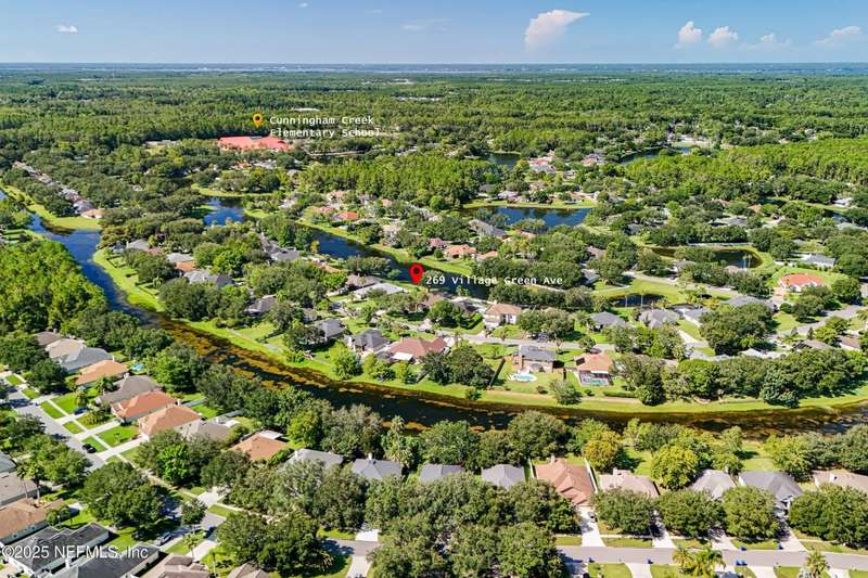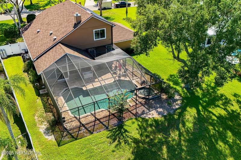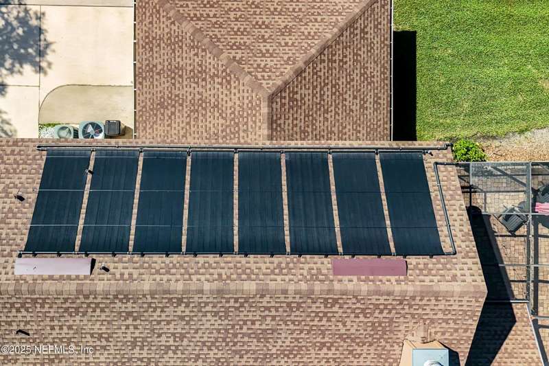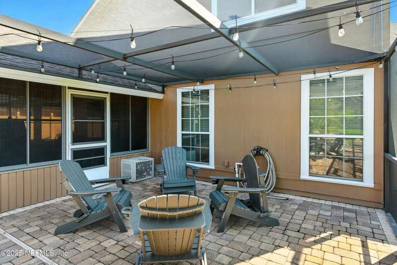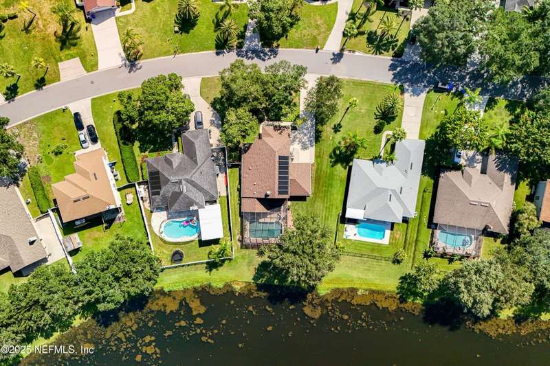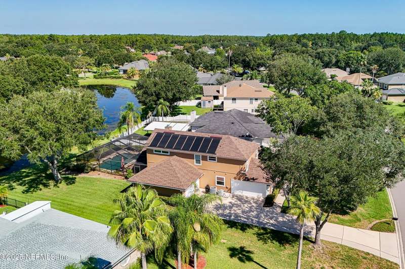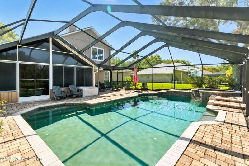 Welcome to this beautifully updated & maintained 4 bed, 2.5 bath pool home in the desirable Village Green community of St. Johns. Set on a serene lakefront lot, this two-story home features a screened, solar-heated pool with spa, paver lanai, and spacious backyard perfect for entertaining. Recent updates include a new roof (2024), exterior paint (2024), skylights (2025), water heater (2023), pool automation system, and solar panels for year-round enjoyment. Inside, you'll find soaring ceilings, a bright family room, and an beautifully designed kitchen with granite counters, stainless appliances, and a new Whirlpool gas range (2025). The first-floor primary suite offers a newly tiled shower, dual vanities, garden tub, and walk-in closets. With a huge bonus room upstairs for the secondary bedrooms there are tons of possibilities! Additional features include new windows in many rooms, smart thermostat, Rainbird irrigation system, and an oversized garage. Conveniently located near A-rated schools, shopping, and dining, this move-in ready home blends comfort and modern upgrades.