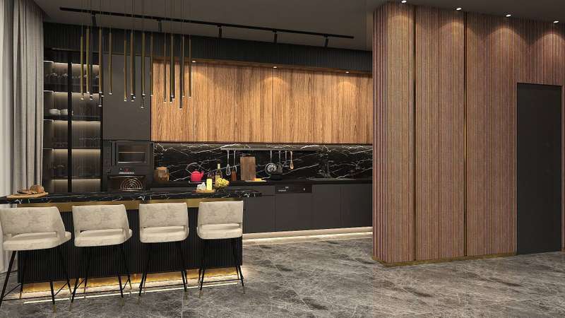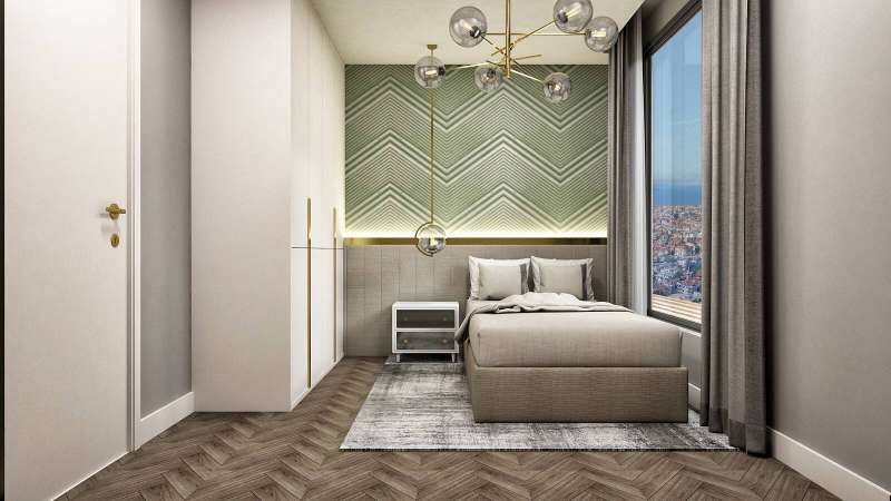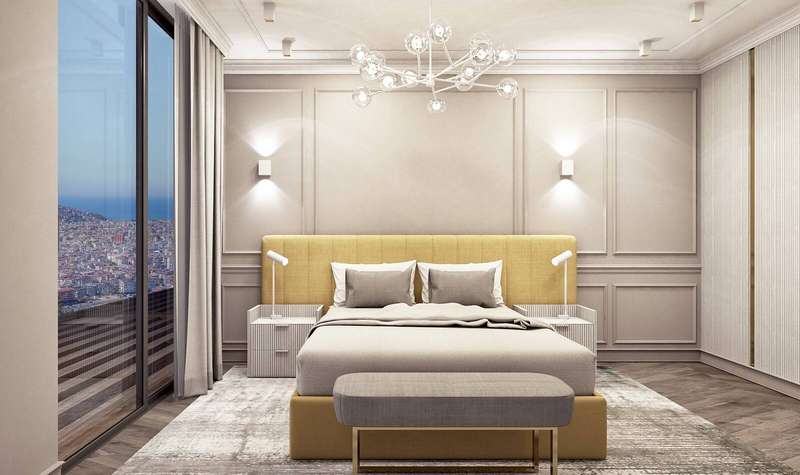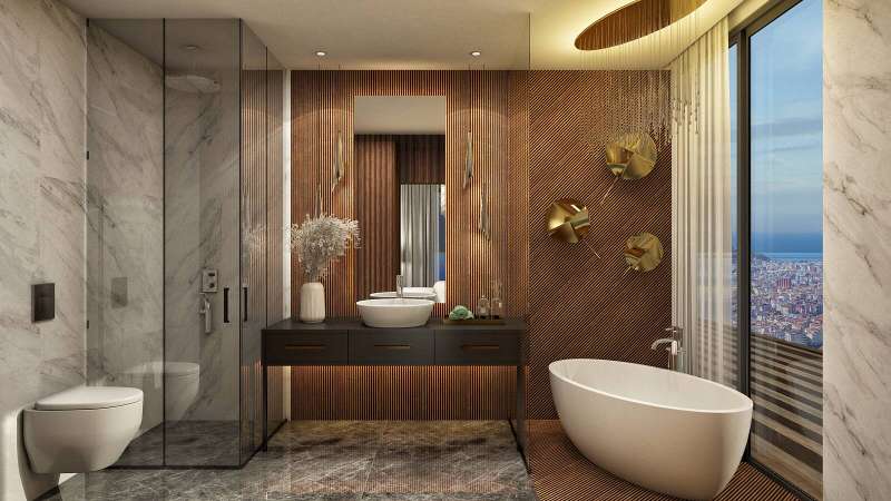 Modern apartments are designed with ceramic flooring, LED and spot lighting, lacquered interior doors, steel doors, PVC double-glazed windows, open plan kitchens, generators, dressing rooms, fireplaces, built-in sets, blinds, shower cabins, bathtubs, terraces and balconies.