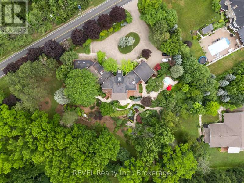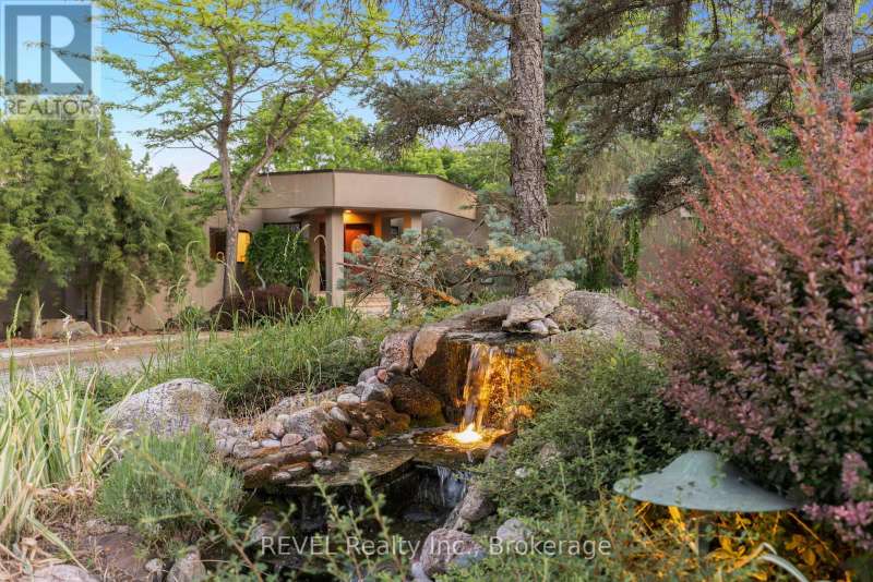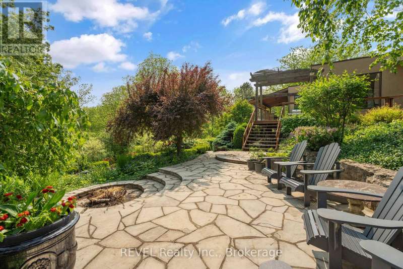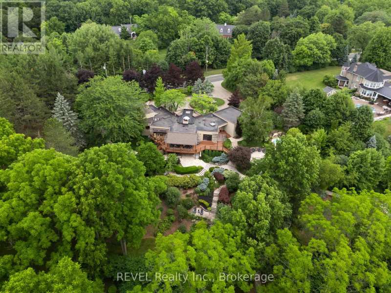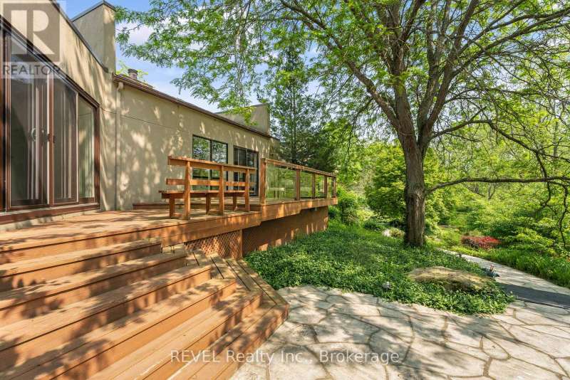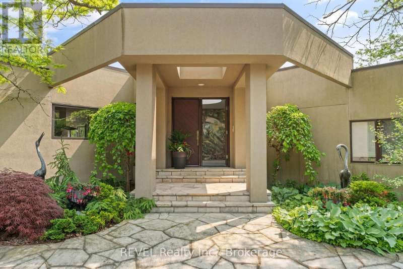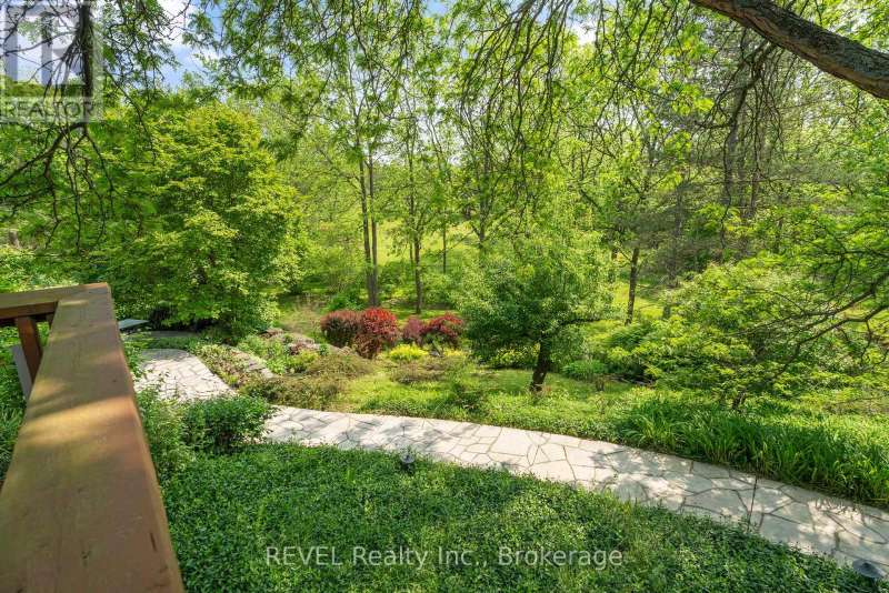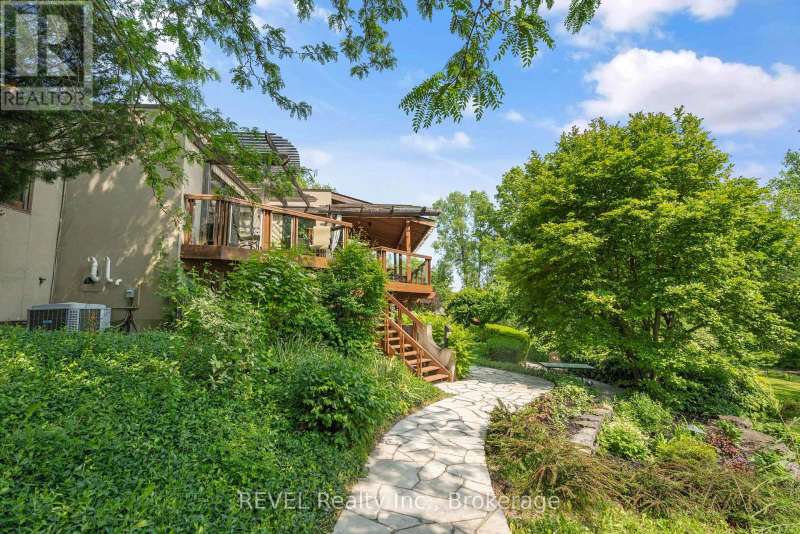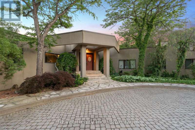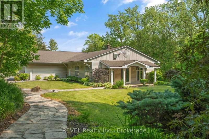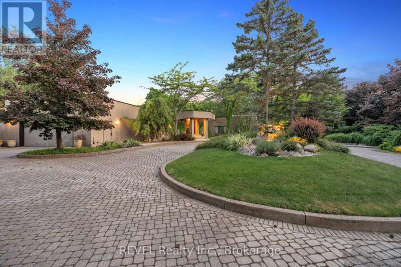 Iconic luxury living locally renowned as 'The Driftwood' emerges from resplendent landscaped acreage on exclusive Decew road in St. Catharines, one of the most sought after and elite areas in the Niagara region. Situated in the midst of legendary Carolinian trees in the most tranquil of pastoral settings, this architecturally envisioned L-shaped bungalow offers escarpment views from every angle while hosting a fluid, sprawling floor plan seamlessly exiting to a virtual paradise of manicured gardens. Featuring separate primary bedroom with elevated ensuite privileges and appending exercise and office rooms, all with relevant views of the natural flora outside, this unique listing also offers a modern open kitchen anchored by a chef's choice of high end Miele appliances. Perfect for family gatherings and designed to accommodate any entertainment function, descend to a full walkout lower level that hosts, without exaggeration, a fully imagined Scottish pub with customized pool room and furniture, oak bar, and stain glassed accents to ideally characterize this exceptional living space. Venturing out from the walkout lower level from a recreation room, which also features a separate bathroom and sauna incorporating the possibility of in-law capability or nanny suite privileges, walk the extensive stone pathways throughout the 10 acre property, pass the gated spa designed pool area, before eventually strolling upon a fully updated and renovated separate, 1800sq.ft., guest home with four car garage. Buying two luxury homes for the price of one set on an idyllic landscape in the heart of the Niagara region and wine country, with exceptional proximity to golf courses, Brock University, wineries, new hospital, shopping centres, restaurants, the Meridian Centre, Ridley Private School and the downtown core of St. Catharines, only magnifies the majesty of such a setting and location. (id:7434)