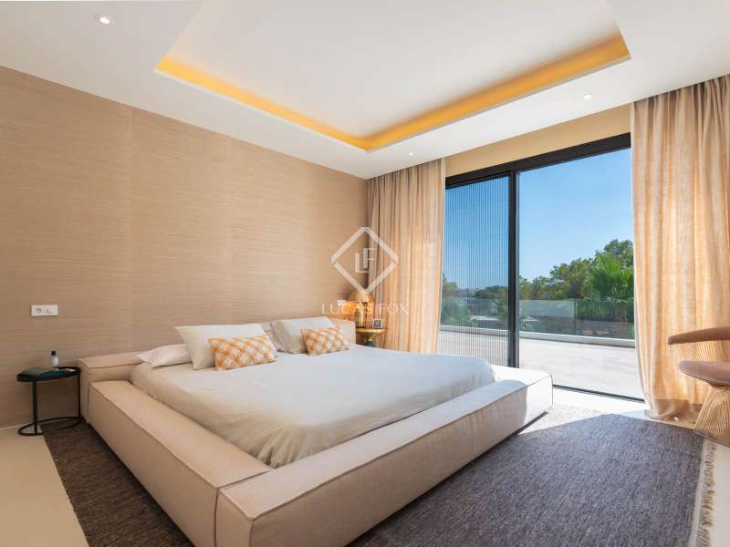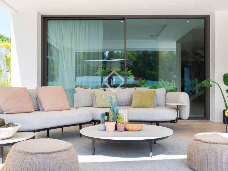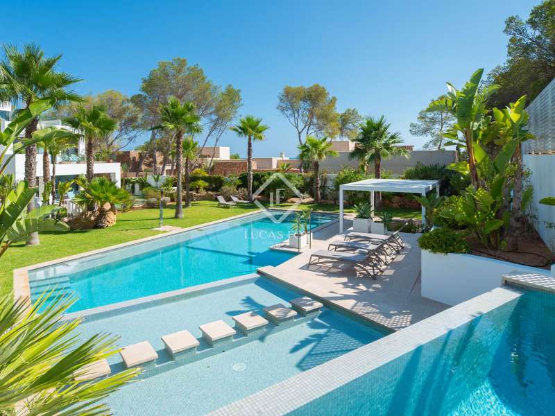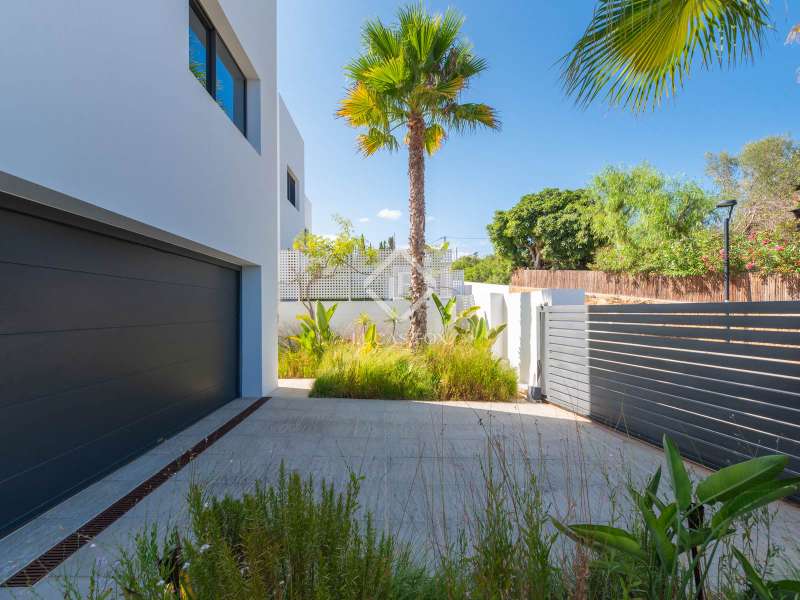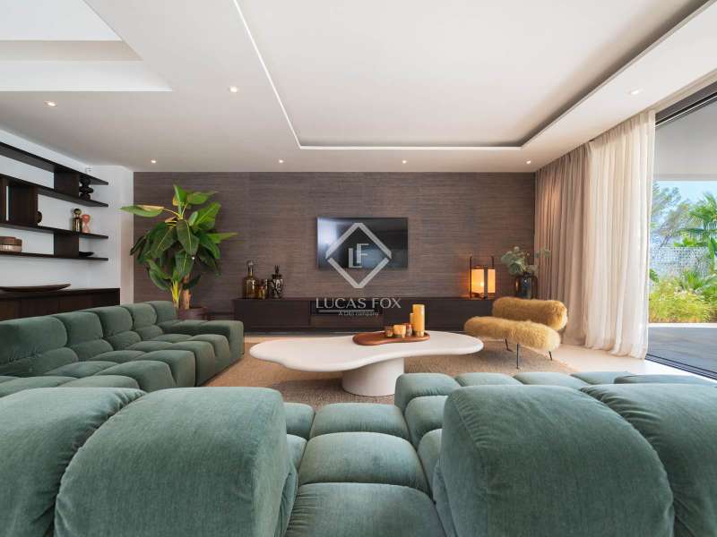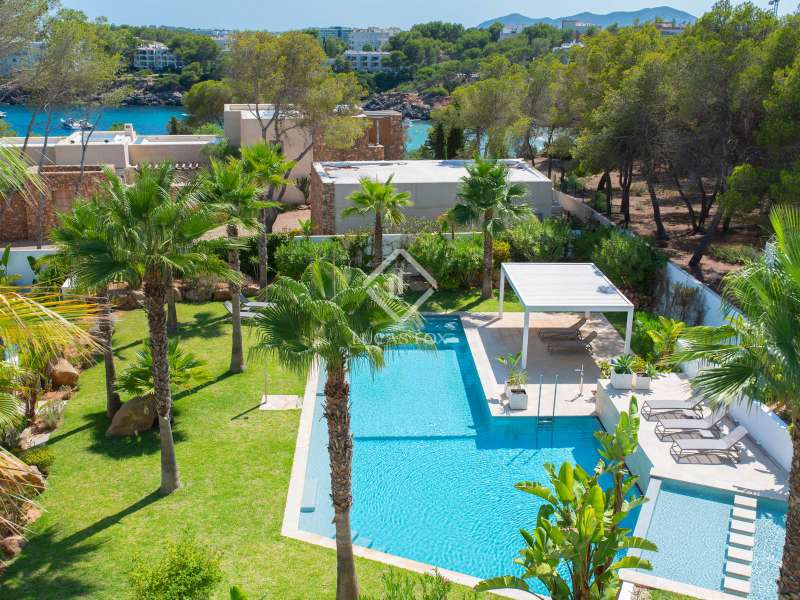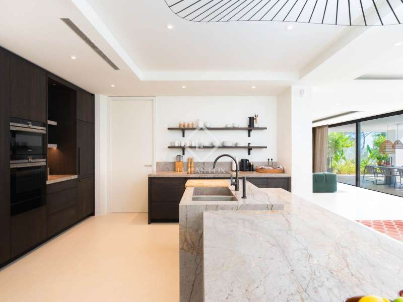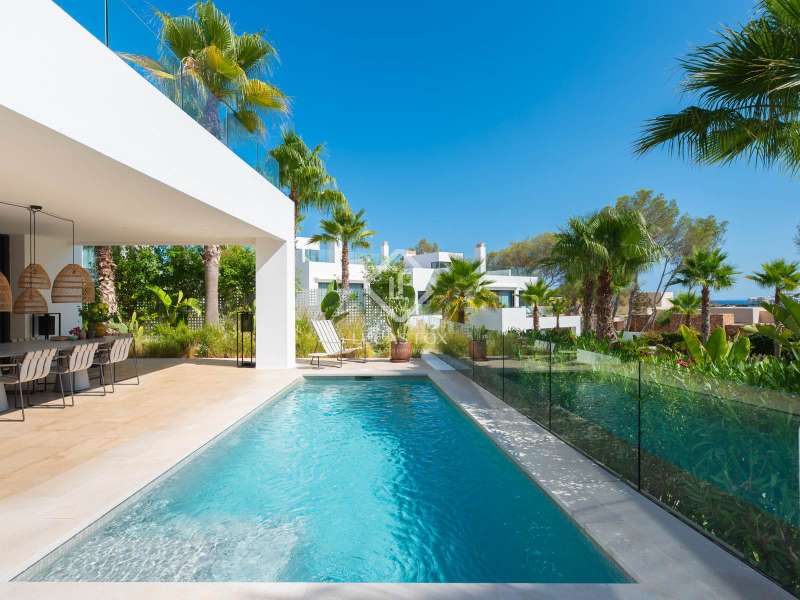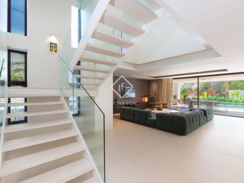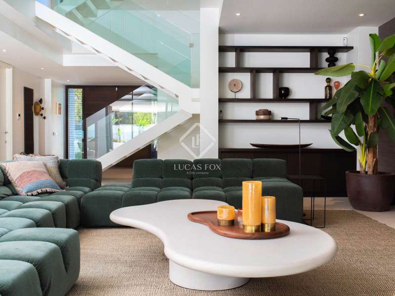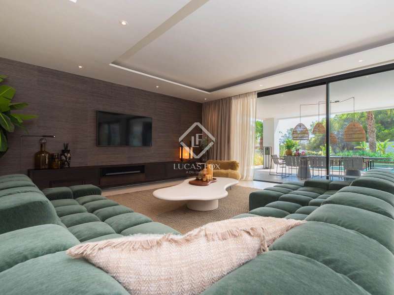 This villa is located in an exclusive gated community of just five homes, just a two-minute walk from the golden beaches of Cala Llenya. Every sophisticated corner has been designed to offer comfort, yet with an elegant and timeless style. The property features five spacious bedrooms with uniquely designed private bathrooms: a guest suite on the ground floor and four additional bedrooms floor . The impressive 80 m² living room features high cathedral ceilings and opens onto a private patio and landscaped garden with a heated pool. It is ideal for both relaxing and entertaining guests. From its terraces, you can admire the verdant landscape with sea views. The interiors feature the highest quality finishes, with a soft, natural color palette complemented by custom details. The lush garden is carefully designed with tropical vegetation and flowering shrubs. The property boasts furnishings from renowned brands such as Gervasoni, Living Divani, and B&B Italia, and a functional, handcrafted Eginstill kitchen, ideal for both everyday use and special occasions. The villa overlooks the lush community park, a meticulously maintained area that houses a spectacular 400 m² pool on three levels for comfortable swimming, as well as areas designed for the enjoyment of both residents and visitors. The community guarantees exceptional privacy, with indoor and outdoor spaces protected from the exterior for greater exclusivity and privacy. The property 's layout has been carefully thought out, with multiple distinct living spaces. It also features a private, secure garage, accessible via a remote-controlled gate.