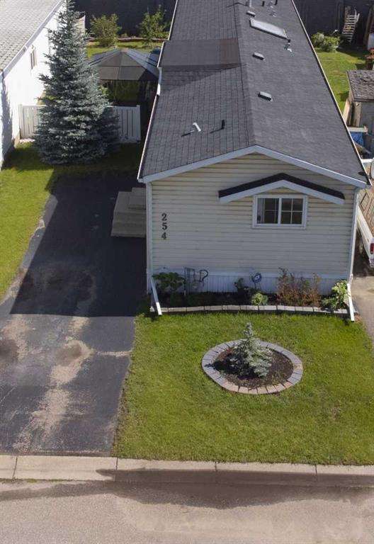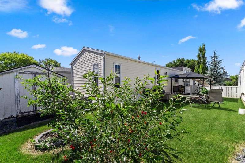 Incredible Value! Own Your Own Titled Land—Say Goodbye to Monthly Condo Fees and Pad Rent! This beautifully designed, air-conditioned 1,200 sq. ft. bungalow-style modular home offers three spacious bedrooms and two full bathrooms, complete with two convenient entrances. Step inside to experience an inviting open floor plan featuring a bright oak kitchen illuminated by a skylight. With ample pantry storage and a charming built-in china cabinet that doubles as an elegant beverage station, this kitchen is perfect for entertaining. The living room is a stunning showcase, boasting high vaulted ceilings and additional oak cabinetry for stylish storage, all while bathing in natural light from numerous large windows. Retreat to the primary bedroom, which includes a luxurious 4-piece ensuite bathroom complete with a 2-person jetted soaker tub, a dedicated makeup area with a sink, a separate shower, and a private toilet. The front of the home features two generously sized bedrooms with ample closet space, along with a main bathroom that is also 4 pieces, ensuring comfort for family and guests. The rear entrance features built-in cabinetry and ample storage for a freezer or other essentials, conveniently located adjacent to a separate laundry room equipped with a modern front-load washer and dryer. Step outside to discover two storage sheds skillfully hidden behind a beautifully landscaped yard, featuring a delightful apple tree and chokecherry bushes. Whether you’re grilling on your patio or enjoying a cozy fire in the yard, outdoor living has never been better! Winterized heat tape ensures no issues during the cold. With asphalt parking and easy access to walking paths and green spaces, this home is ideally situated. Enjoy unparalleled convenience with quick access to Stoney Trail, Peigan Trail, Deerfoot Trail, and Downtown, along with all the amenities you could desire, including Costco on 17th Avenue and big box stores. Don’t miss out on this exceptional opportunity—experience it for yourself!
