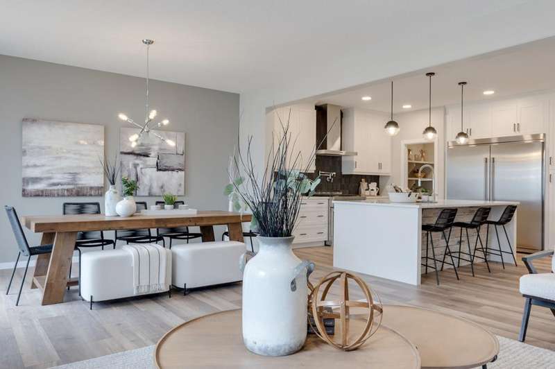 THERE’S A CERTAIN KIND OF QUIET THAT COMES WITH BACKING ONTO GREENSPACE—uninterrupted sunsets, morning coffees with a view, and a buffer of calm between you and the world. That’s the everyday reality at 243 Mallard Grove SE, a WEST-FACING, park-backed stunner in Calgary’s Rangeview by Genstar. Built by Homes by Avi, the Jefferson model offers over 2,350 SQUARE FEET OF REFINED FUNCTION. On the main floor, a tucked-away FLEX ROOM AND POWDER BATH create the perfect setup for a home office or private guest area. The open-concept kitchen, anchored by 48" upper cabinets, quartz counters, and a built-in microwave, blends seamlessly into the dining nook and great room, where a FULL-HEIGHT FIREPLACE WALL adds warmth and visual impact. Just beyond the TRIPLE-PANEL PATIO DOOR, your 11'x10' deck overlooks landscaped parkland and walking trails. NO REAR NEIGHBOURS, NO COMPROMISES. Upstairs, the primary bedroom hits every note: a SOAKER TUB, TILE-AND-GLASS SHOWER, dual sink vanity, and a GENEROUS WALK-IN CLOSET. Two additional bedrooms—each with their own walk-in—plus a spacious bonus room and UPPER-LEVEL LAUNDRY WITH FOLDING COUNTER make this floorplan especially family-friendly. Design selections lean modern and moody: wide plank LVP in “Dusty Roads,” Canadian Grey cabinetry, storm-toned backsplash tile, and quartz counters throughout. Thoughtful upgrades include 9' foundation and main floor ceilings, iron spindle railing, an 80-GALLON HOT WATER TANK, 200 AMP PANEL with EV charger rough-in, solar conduit, and BBQ and gas stove rough-ins for future functionality. Rangeview by Genstar is one of Calgary’s most connected new communities, designed for people who value intentional planning, greenspace, and QUICK ACCESS TO SETON’S URBAN CONVENIENCES. And this home, perched quietly at the edge of the action, offers a front-row seat to that lifestyle. QUICK POSSESSION IS AVAILABLE—JUST MOVE IN AND START LIVING. PLEASE NOTE: Photos are of a finished Showhome of the same model – fit and finish may differ on finished spec home. Interior selections and floorplans shown in photos.