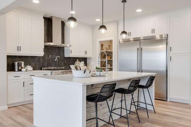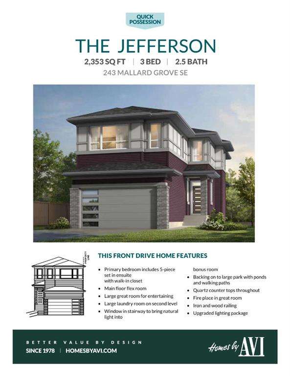 THERE’S A CERTAIN KIND OF QUIET THAT COMES WITH BACKING ONTO GREENSPACE—uninterrupted sunsets, morning coffees with a view, and a buffer of calm between you and the world. That’s the everyday reality at 243 Mallard Grove SE, a WEST-FACING, park-backed stunner in Calgary’s Rangeview by Genstar. Built by Homes by Avi, the Jefferson model offers over 2,350 SQUARE FEET OF REFINED FUNCTION. On the main floor, a tucked-away FLEX ROOM AND POWDER BATH create the perfect setup for a home office or private guest area. The open-concept kitchen, anchored by 48" upper cabinets, quartz counters, and a built-in microwave, blends seamlessly into the dining nook and great room, where a FULL-HEIGHT FIREPLACE WALL adds warmth and visual impact. Just beyond the TRIPLE-PANEL PATIO DOOR, your 11'x10' deck overlooks landscaped parkland and walking trails. NO REAR NEIGHBOURS, NO COMPROMISES. Upstairs, the primary bedroom hits every note: a SOAKER TUB, TILE-AND-GLASS SHOWER, dual sink vanity, and a GENEROUS WALK-IN CLOSET. Two additional bedrooms—each with their own walk-in—plus a spacious bonus room and UPPER-LEVEL LAUNDRY WITH FOLDING COUNTER make this floorplan especially family-friendly. Design selections lean modern and moody: wide plank LVP in “Dusty Roads,” Canadian Grey cabinetry, storm-toned backsplash tile, and quartz counters throughout. Thoughtful upgrades include 9' foundation and main floor ceilings, iron spindle railing, an 80-GALLON HOT WATER TANK, 200 AMP PANEL with EV charger rough-in, solar conduit, and BBQ and gas stove rough-ins for future functionality. Rangeview by Genstar is one of Calgary’s most connected new communities, designed for people who value intentional planning, greenspace, and QUICK ACCESS TO SETON’S URBAN CONVENIENCES. And this home, perched quietly at the edge of the action, offers a front-row seat to that lifestyle. QUICK POSSESSION IS AVAILABLE—JUST MOVE IN AND START LIVING. PLEASE NOTE: Photos are of a finished Showhome of the same model – fit and finish may differ on finished spec home. Interior selections and floorplans shown in photos.