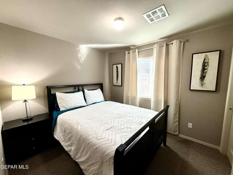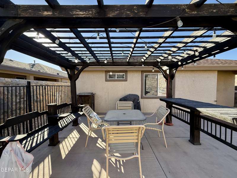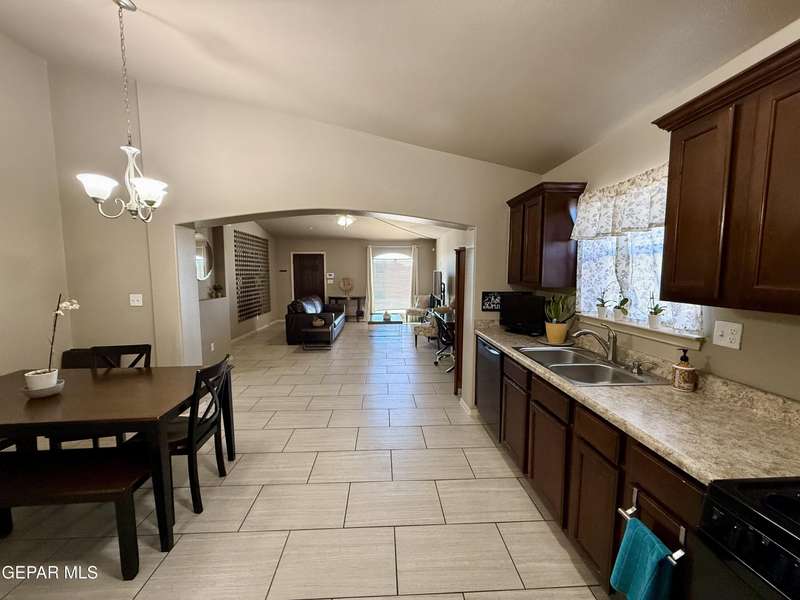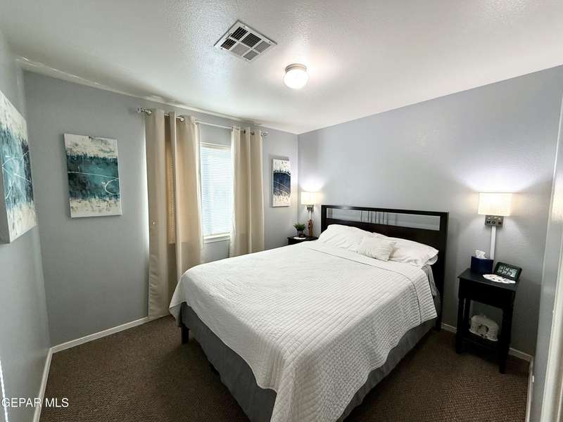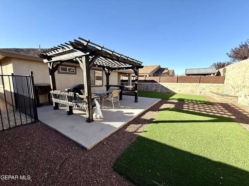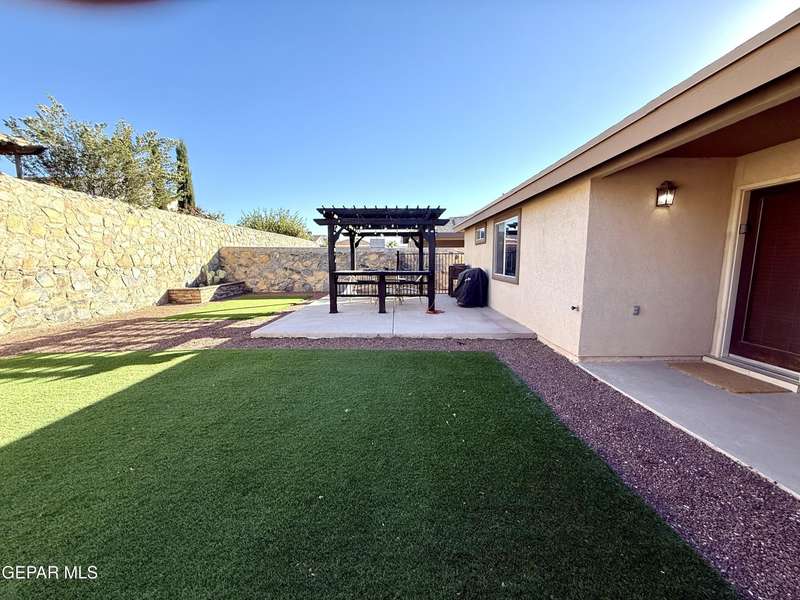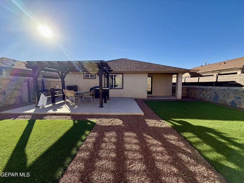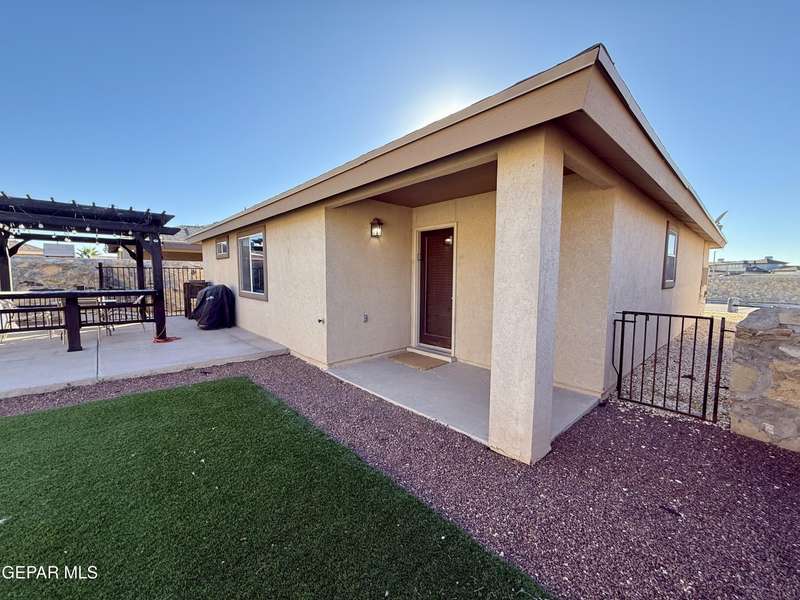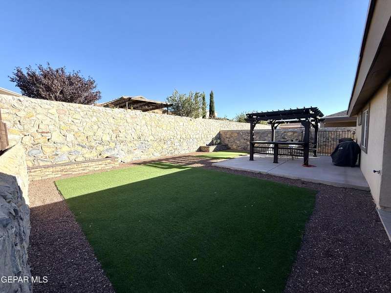 Move-in ready 3-bedroom, 2-bath home in East El Paso near Zaragoza and Montana with direct access to Fort Bliss. Features an open-concept layout with high ceilings, tile flooring, and abundant natural light. The kitchen offers ample cabinet space and modern appliances. Spacious bedrooms and updated baths provide comfort and style. The low-maintenance backyard includes turf, a covered patio, and a pergola ideal for entertaining. Garage has epoxy flooring and has a park right across. Conveniently located near shopping, dining, schools, and major routes, this home offers easy living in a prime location.