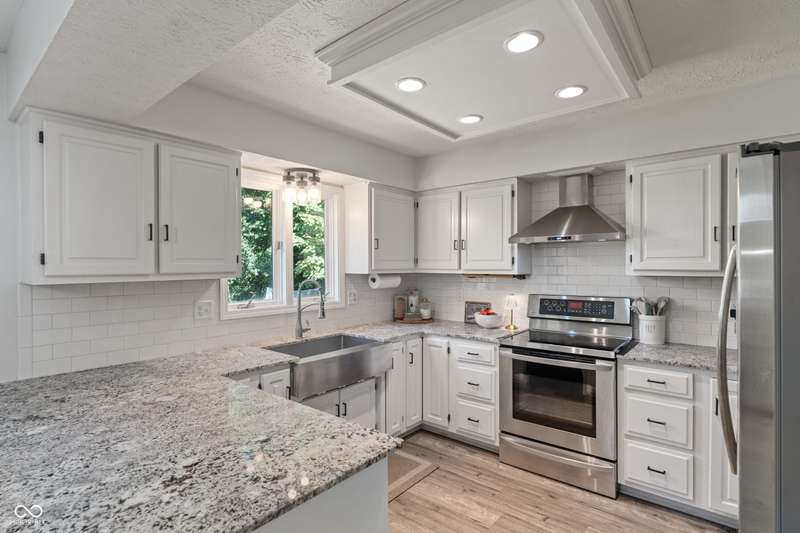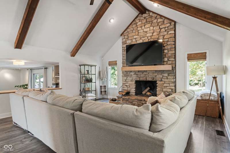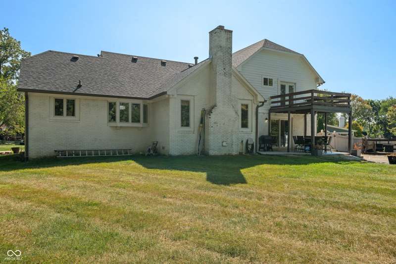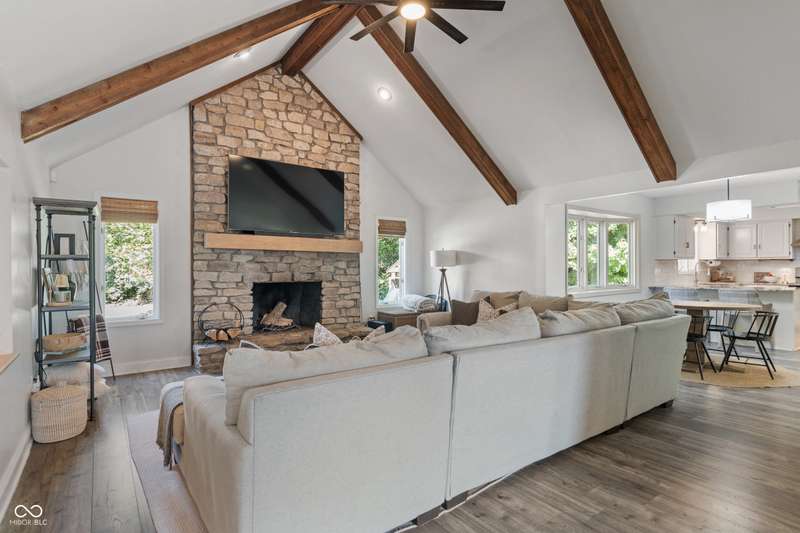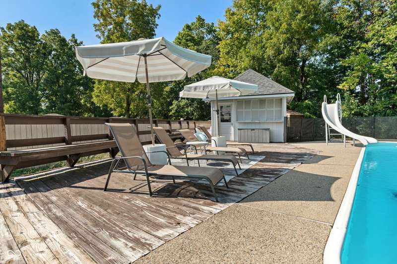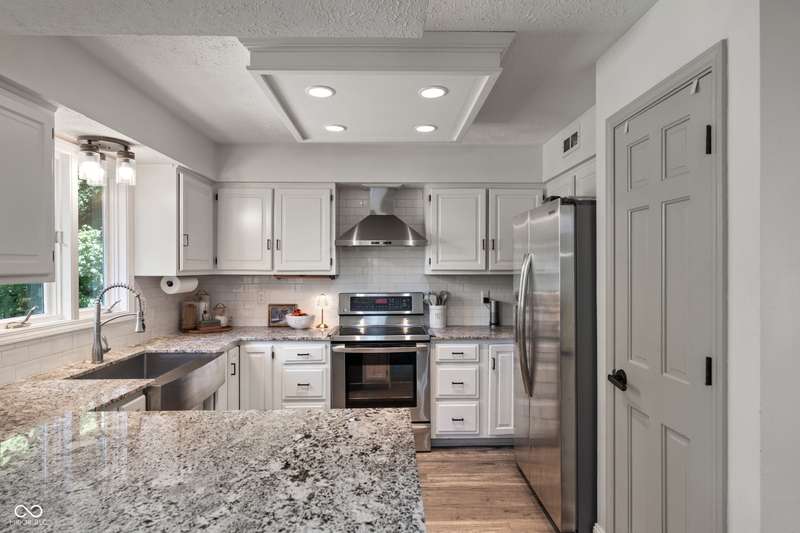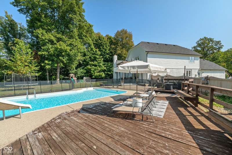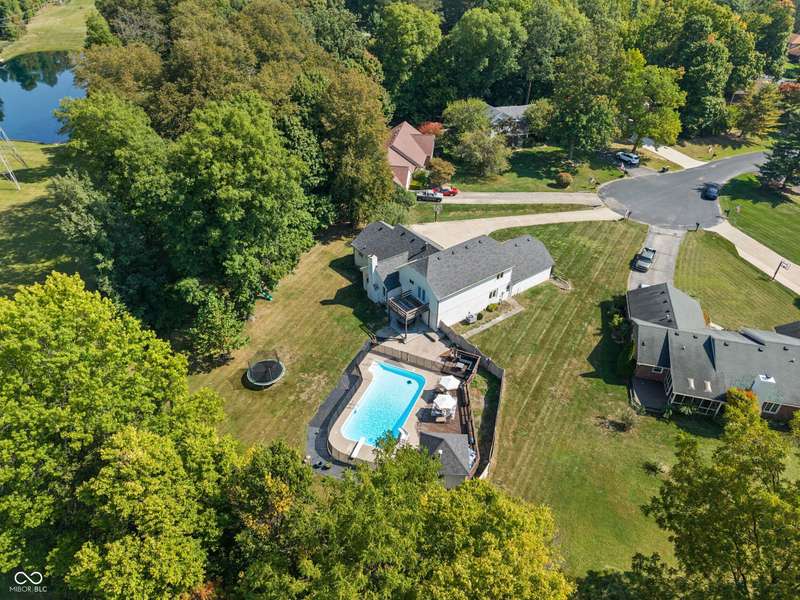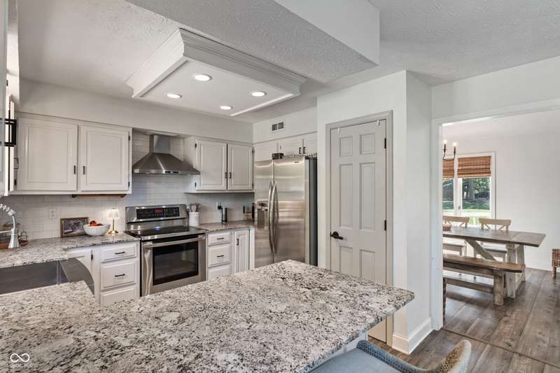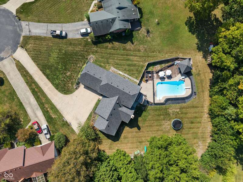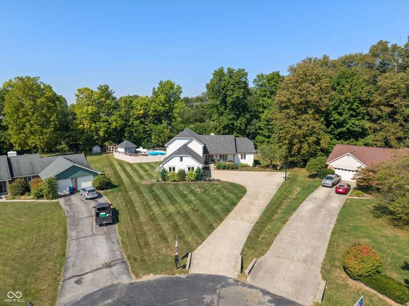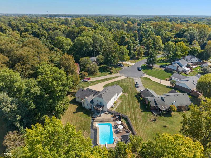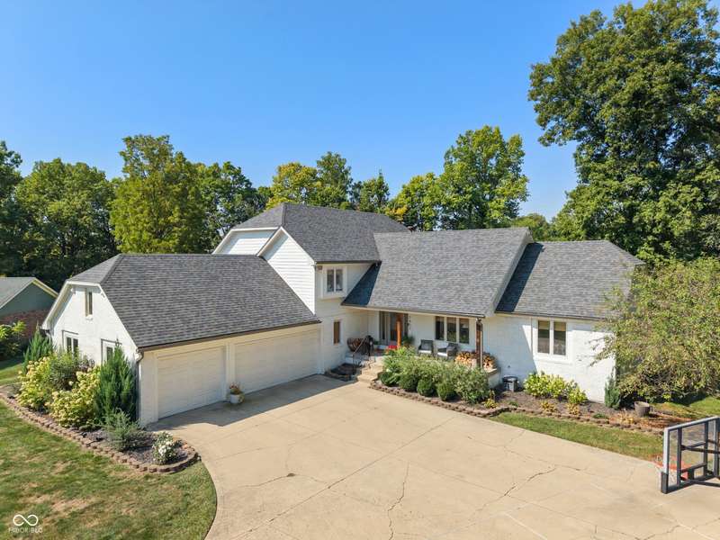 Nestled on a private .63-acre cul-de-sac lot, this modern retreat in secluded Schildmeier Woods awaits. A long driveway sweeps toward a whitewashed exterior, where a cozy front porch invites you inside. Step into nearly 3100 finished sq ft of thoughtfully updated space. A functional circular floorplan flows through generous rooms graced with LVP floors and contemporary fixtures. Bask in the family room beneath soaring cathedral ceilings, where a dramatic wood-burning stone fireplace creates an impressive focal point. The bright kitchen gleams with granite countertops, stainless steel appliances, subway tile backsplash. Versatile main level also hosts a large bonus room, flexible living/dining areas, a walk-out bar, and a convenient bedroom. Escape upstairs to the tranquil primary suite, a private oasis with a spa-like bath. It features custom dual vanities, two walk-in closets, and a huge, exquisitely tiled walk-in shower. Two other spacious bedrooms and another beautifully renovated bathroom complete the upper level. Unleash your vision in the 960 sq ft unfinished basement or utilize the 3-car garage for exceptional storage. Your backyard paradise unfolds with a sprawling lawn and a freshly sealed gunite pool, updated with a new pump and gas line for a heater. Dine on the covered patio, overlooking the lush, tree-lined yard-the perfect backdrop for making lasting memories. Enjoy peace of mind with newer roof and water heater. Don't miss the opportunity for a home that can provide years of memories for you and your loved ones!
