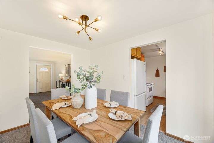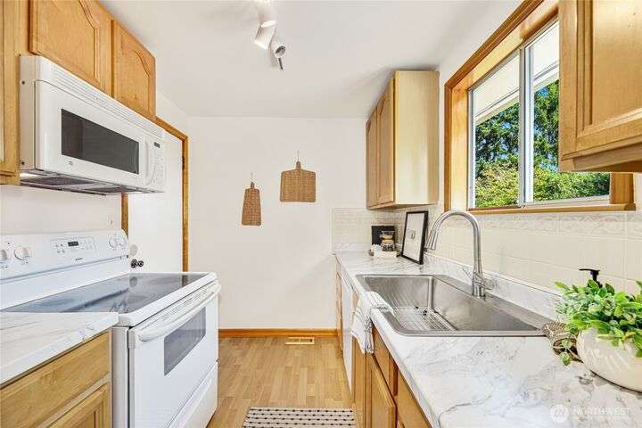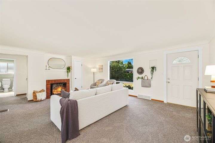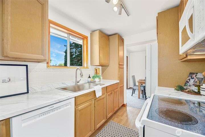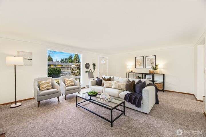 Lovely one level, 3-bed, 1-bath home, move-in ready located in sought-after south end of West Seattle on expansive 8,000 sq.ft. plus lot. Enjoy a spacious living room, dining room, refreshed kitchen with new countertops, SS sink, and brand-new carpet and paint throughout, with refinish-able hardwood floors under carpet! The large and level backyard with patio is drenched in sunlight—perfect for entertaining, gardening, or relaxing. Spacious garage plus storage loft, additional off-street parking adds extra convenience. R18 Zoning allows for development potential, buyer to verify. Located near parks, shops, transportation options, this centrally positioned home offers both comfort, room to grow, and accessibility. A must-see!