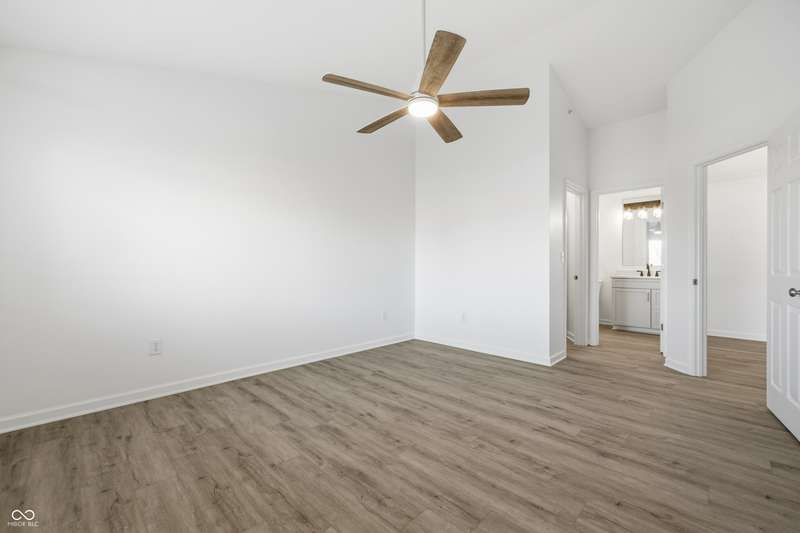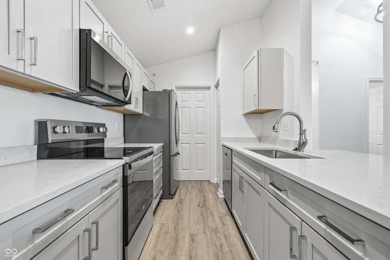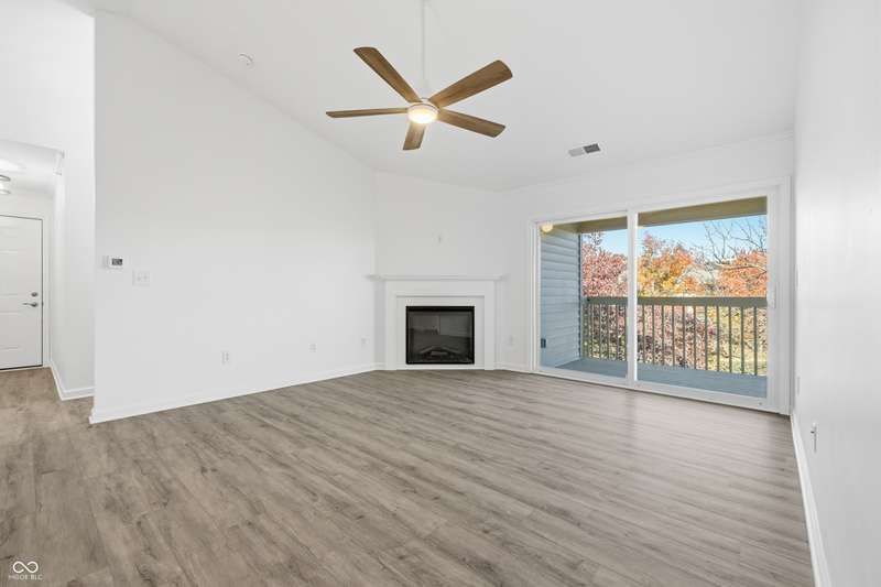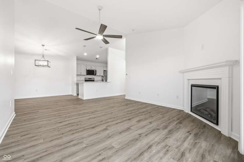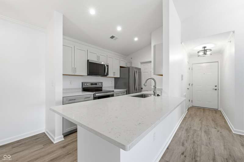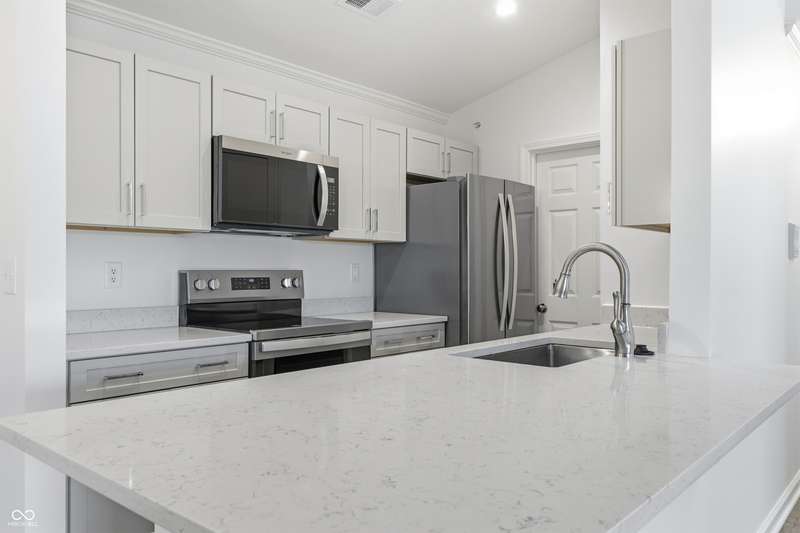 Just completed in 2025! This home is a highly desirable 3rd floor balcony end unit overlooking a pond with a water feature. Spacious and bright with 2 bedroom/2 bathrooms, cathedral ceilings, and fireplace. Custom shelving in kitchen, both bedrooms and laundry room. Brand new stainless steel kitchen appliances AND washer and dryer are included!! This unit has 2 GARAGES and was just completed this month. Some of the features include high end soft close cabinets with quartz counters throughout. Walk-in tiled shower w/glass door in primary bedroom, large walk-in closets in both bedrooms and luxury vinyl plank flooring throughout. Everything is warrantied. This community features a community pool, clubhouse with gym featuring new exercise equipment, tennis courts and has very low monthly HOA fees. It is also located near the Monon and only a bike ride away from Midtown, the Palladium and the Arts district. This unit comes with a builder's warranty, and everything in the unit is new and warranted (including the HVAC, water heater, windows and all appliances). Unlike the older units in both the Timber Creek and Lennox Trace communities--these new units ARE NOT PLUMBED with problematic polybutylene plumbing but are plumbed with new, much more desirable pex lines. They additionally feature a fire sprinkler/suppression system in all units.