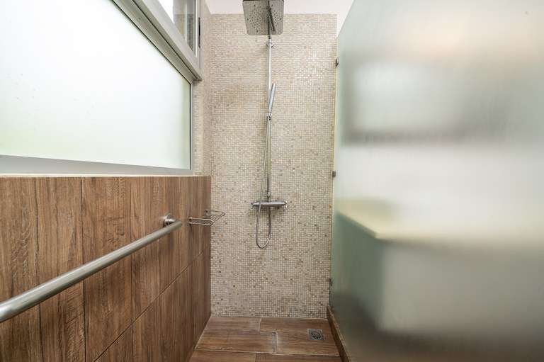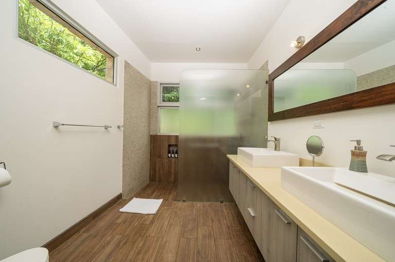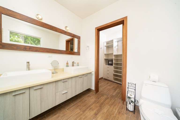 Inside, the home is filled with natural light and designed to ensure year-round cross-ventilation. The open-plan kitchen, living room, and dining area flow seamlessly toward the terrace, making it ideal for entertaining or enjoying peaceful moments in nature. There are two large master bedrooms, each with its own bathroom and ample closet space, offering comfort and privacy for residents or guests.