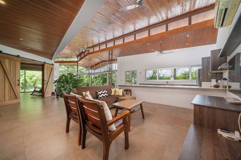 Welcome to a distinctive tropical-modern villa that blends architectural charm with natural beauty and exceptional investment potential. Nestled within one of the region's most desirable gated communities, this unique property sits at the highest point of the residential complex, offering unmatched privacy, continuous airflow, and breathtaking views of the surrounding valley and lush rainforest.