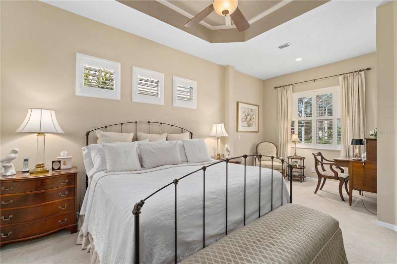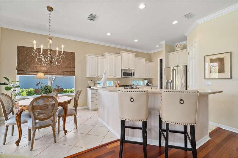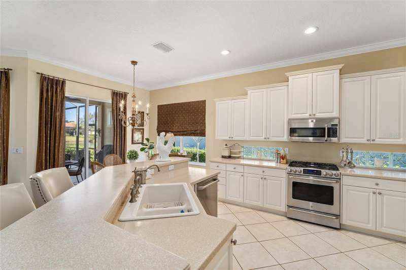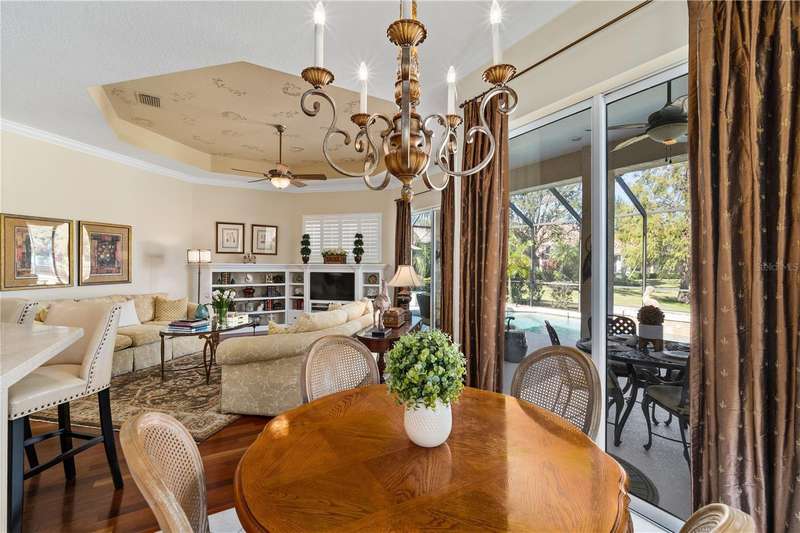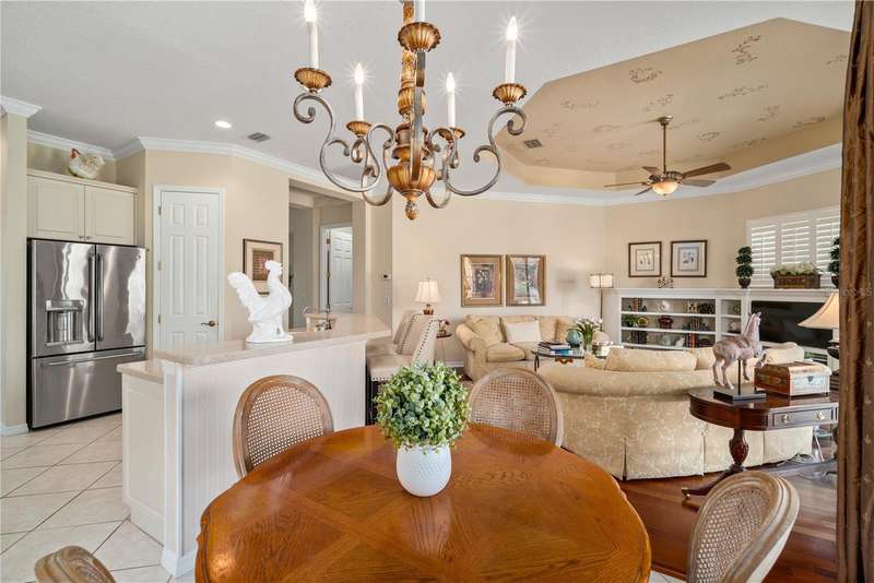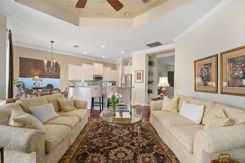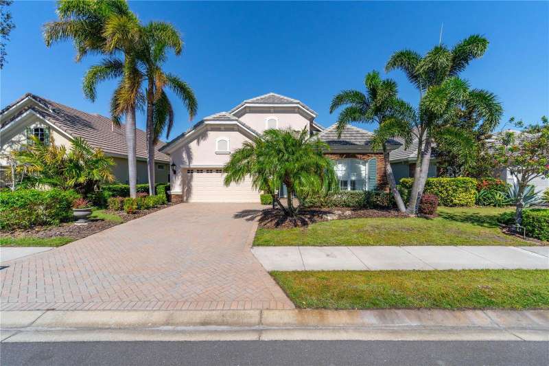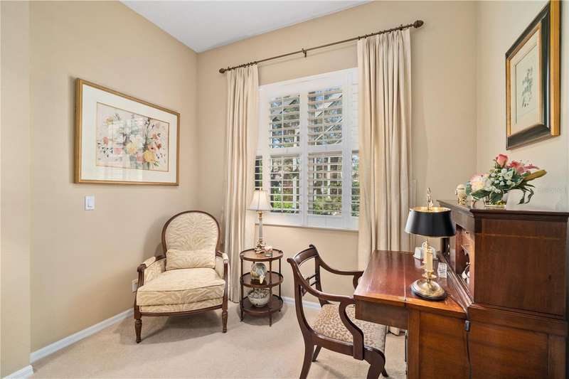 Nestled behind the gates of the exclusive Lakewood Ranch Golf and Country Club, this exquisite home offers both elegance and comfort. Featuring a spacious open floor plan, this 2-bedroom, 2-bathroom home with a den/study boasts custom built-in cabinetry in the great room. The separate dining area flows seamlessly into a gourmet kitchen equipped with high-end stainless steel appliances, ideal for any home chef. The expansive primary bedroom provides ample space for a cozy sitting area and showcases beautiful tray ceilings. The luxurious en suite is designed with a five-piece layout, offering both style and function. Throughout the home, you'll find a neutral color palette and stunning plantation shutters. Additional features include tray ceilings, a brick-paved driveway, and a screened-in lanai that overlooks the serene pond. The spacious pool area is perfect for relaxation or entertaining. Optional social or golf memberships add extra leisure to your lifestyle, whether you're enjoying a day on the course or hosting friends for cocktails by the pool. This home truly offers the best of both worlds.