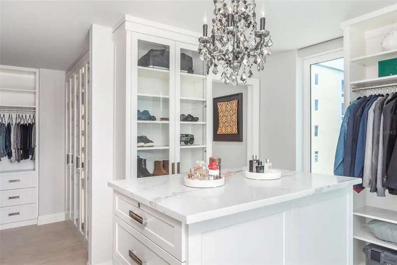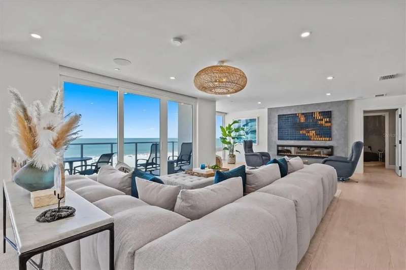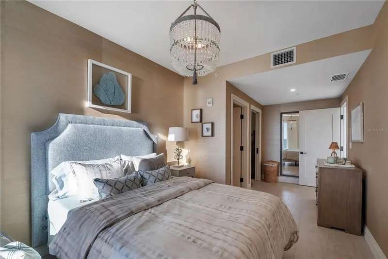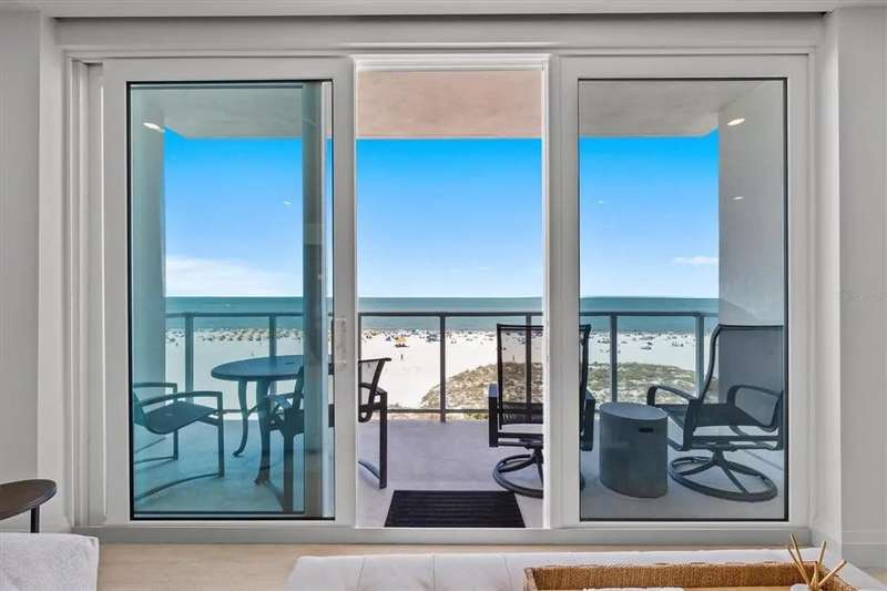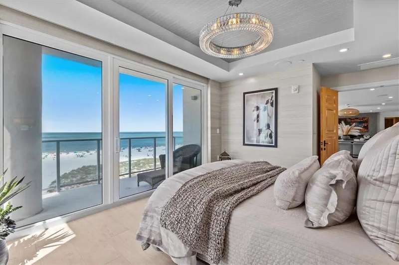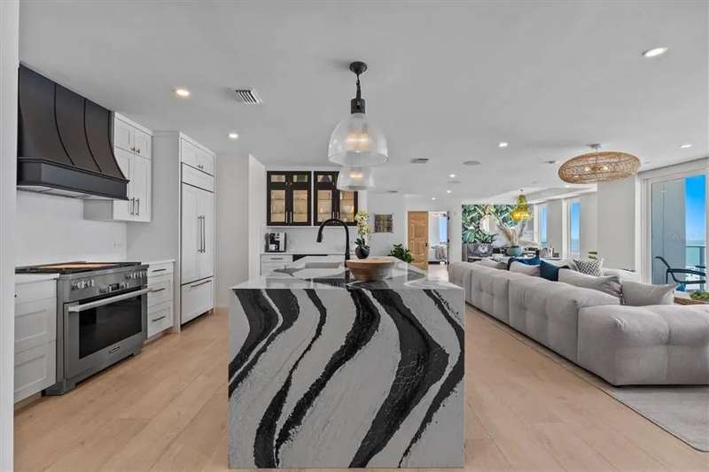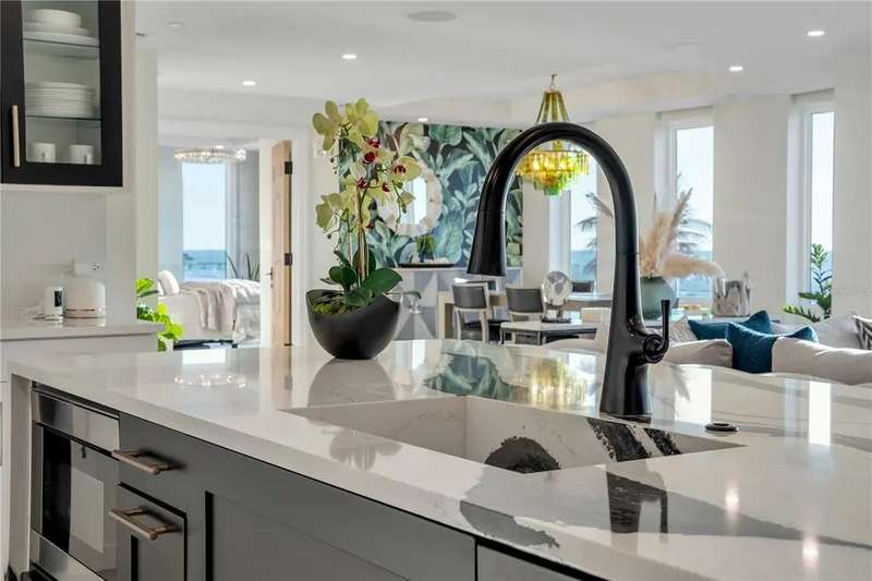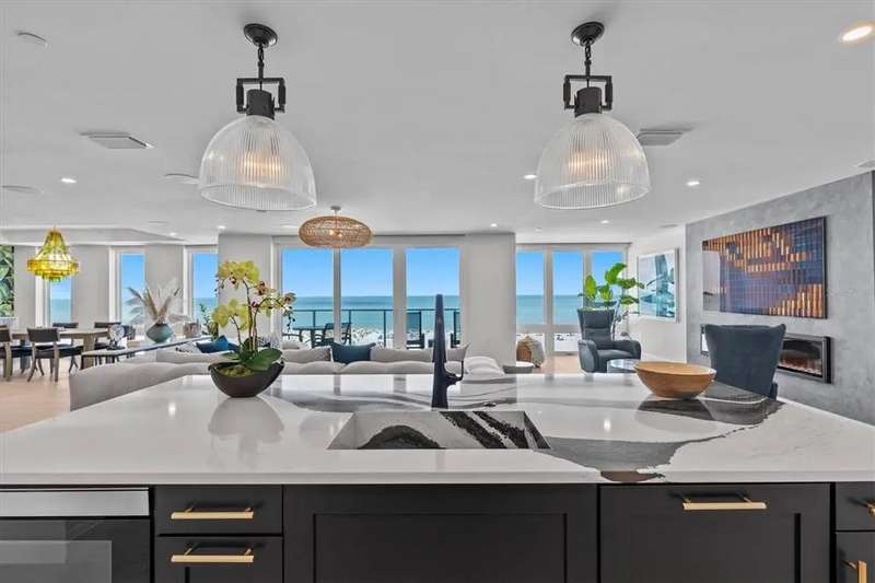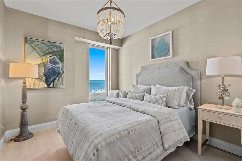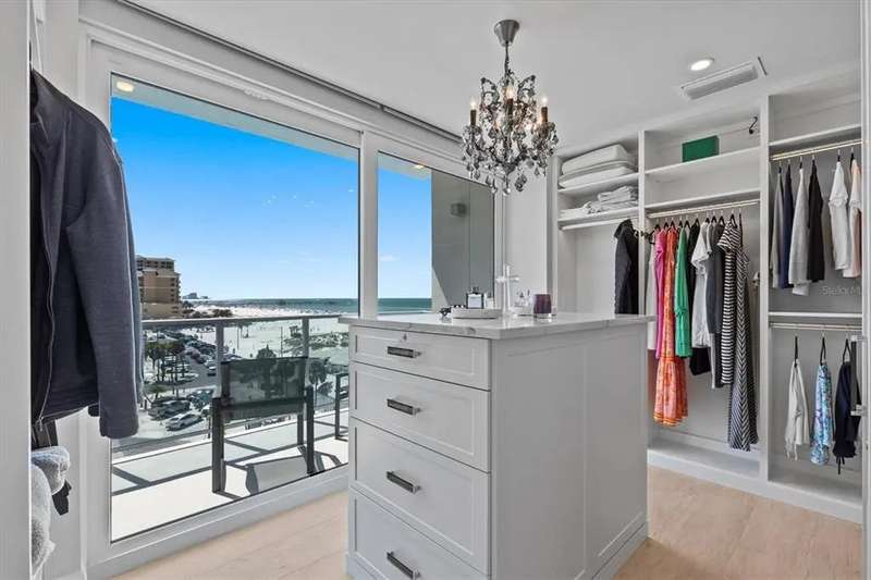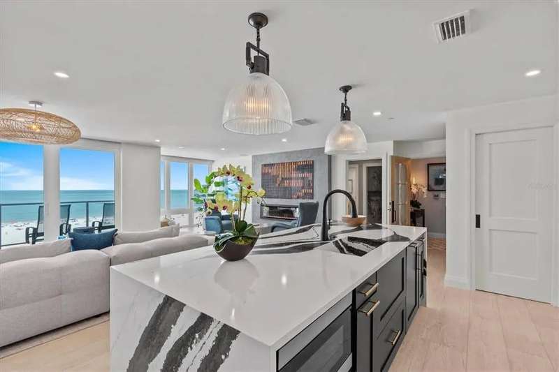 Experience the ultimate in luxury beachfront living at Pura Vida Clearwater Beach, where sophistication blends seamlessly with elegance. This exceptional 2,240-square-foot condominium features two bedrooms, a bonus room, an office, and two and a half bathrooms, designed with an open-concept layout that invites natural light and maximizes ocean views. The living, dining, and kitchen areas flow effortlessly into private glass-paneled balconies, providing the perfect setting for both entertaining and everyday relaxation. A harmonious mix of modern and traditional furnishings creates a transitional aesthetic that exudes livable luxury, while custom finishes and designer fixtures by Franco A. Pasquale Design Associates elevate the home's refined ambiance. The chef-inspired gourmet kitchen is a masterpiece, featuring top-of-the-line Miele and Sub-Zero appliances, sleek quartz countertops, custom cabinetry, a wine fridge, a gas stovetop, and a discreetly integrated dishwasher and refrigerator. The centerpiece is a striking waterfall quartz island with integrated deep sink, ideal for preparing meals while enjoying sweeping oceanfront views. After dinner, the primary bedroom provides a serene retreat with generous proportions, floor-to-ceiling windows, and a private balcony which is perfect for sunset gazing. Its en-suite spa-like bathroom boasts dual sinks, a separate water closet, a dedicated vanity, a soaking tub, and a glass-enclosed shower, all enhanced by a luxurious towel warmer. The walk-in closet is nothing short of a boutique-inspired haven, complete with illuminated wardrobe, chandelier, spacious jewelry cabinet, and a hidden washer and dryer with water filtration system, for ultimate convenience. For your out-of-town guests, the guest bedroom offers privacy and comfort with ocean views and its own en-suite bathroom. The oversized walk-in closet has been thoughtfully reimagined into a charming sleeping nook, featuring bunk beds and a custom mural of Clearwater Beach, ensuring every guest has a memorable stay. This property offers secure, gated access with two designated parking spaces that pre-wired for charging stations. A secure private elevator opens directly into the foyer, with an additional secure entry for added peace of mind. Practical features include a bike storage room, a designated beach locker, and a spacious air-conditioned storage unit. Situated in the heart of Clearwater Beach, this prime location offers easy access to pristine sands, vibrant dining experiences, boutique shopping, and recreational activities such as pickleball and a nearby playground. After a day exploring the best of Florida's renowned coastline, unwind by the oversized heated pool and spa, stay active in the well-appointed fitness center, or gather with friends in the inviting club room. Combining luxurious design, thoughtful functionality, and a prime beachfront location, this exceptional property is the ultimate coastal retreat. Contact us today to schedule your private showing and discover the unparalleled lifestyle awaiting you at Pura Vida Clearwater Beach.