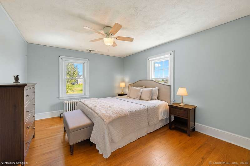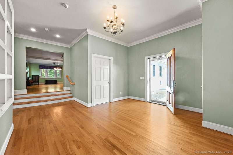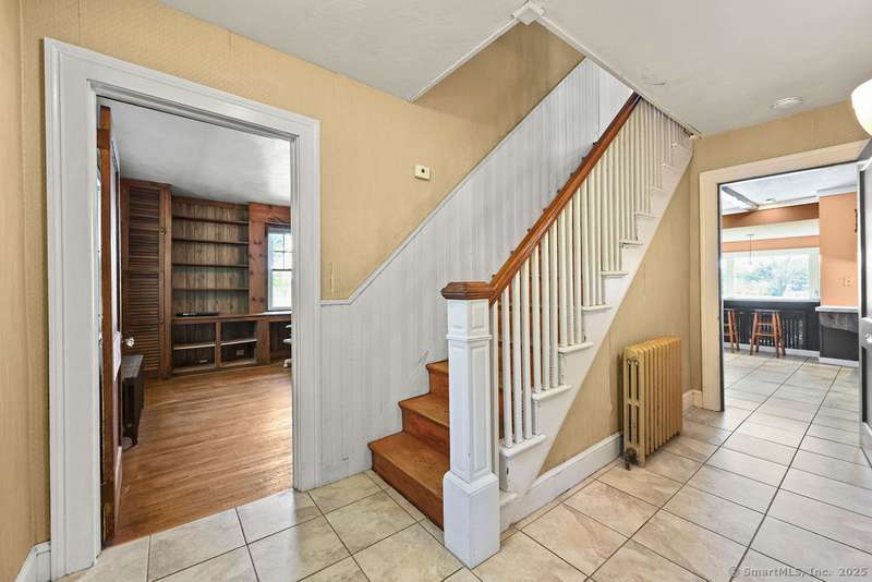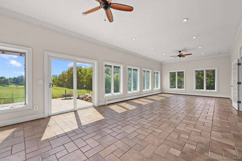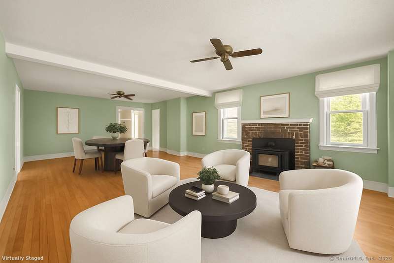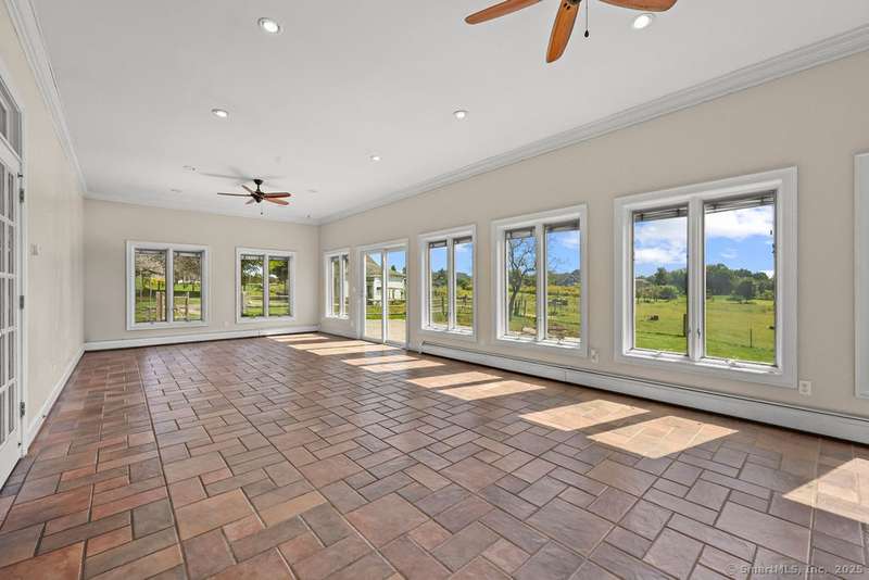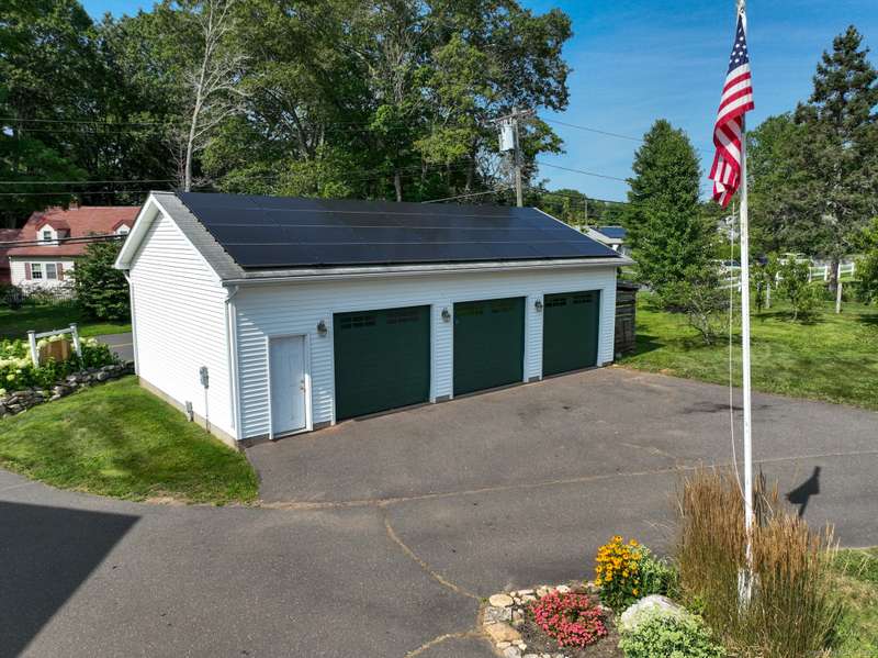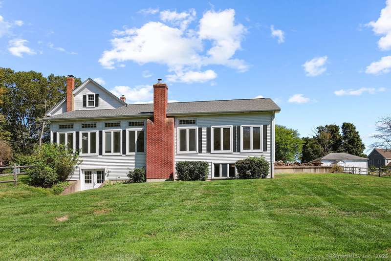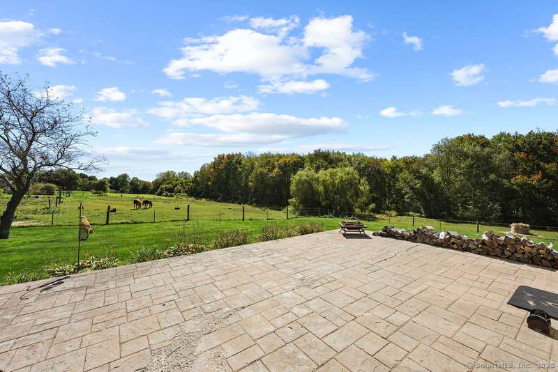 Country living meets modern comfort in this 4-bedroom, 2.5-bath Colonial set on 3+ private acres with access to Bolton Land Trust Trails. Offering nearly 3,900 sq ft of living space, including an 1,800+ sq ft addition, the home features updates that matter: a brand-new 50-year architectural shingle roof (transferable warranty), updated mechanicals, solar panels, and multiple wood stoves for efficiency. Inside, a welcoming foyer with 10' ceilings, crown moulding, and built-ins opens to the centerpiece of the home, a stunning living room filled with natural light from oversized windows with transoms and anchored by a striking fieldstone fireplace. The adjacent sunroom flows seamlessly to a wrap-around patio for entertaining, while the dining room doubles as a cozy lounge with a second fireplace and wood stove insert. The kitchen offers a generous layout with eat-in space and patio access. A first-floor bedroom or office with built-ins, plus a powder room, complete the main level. Upstair