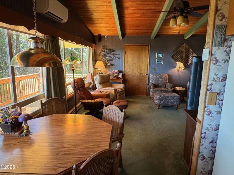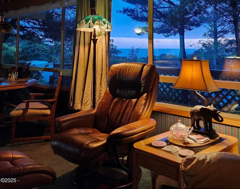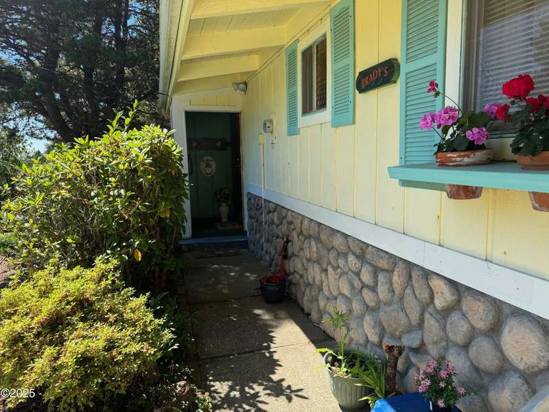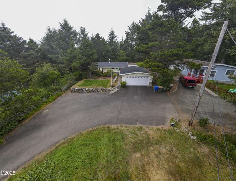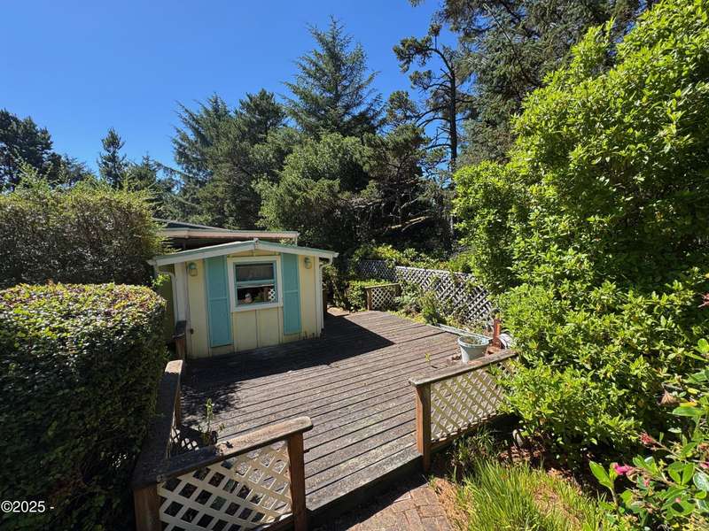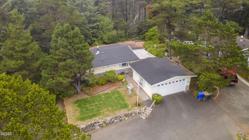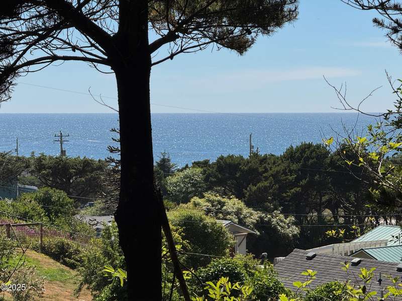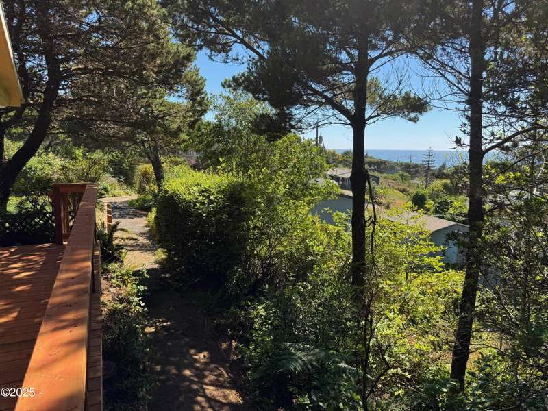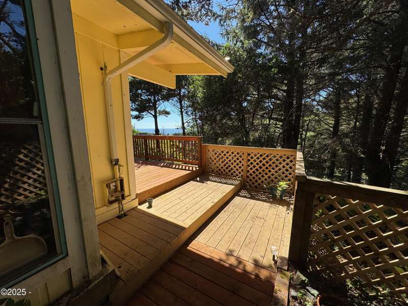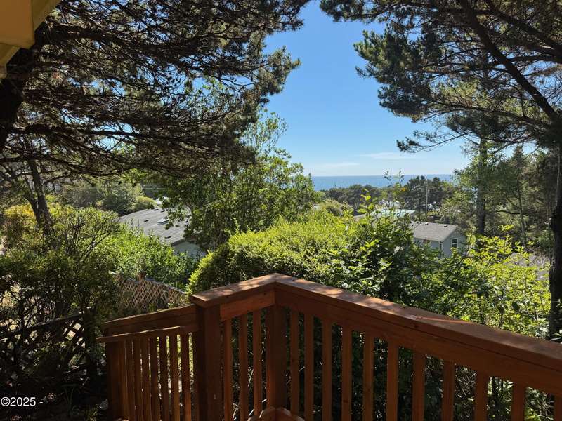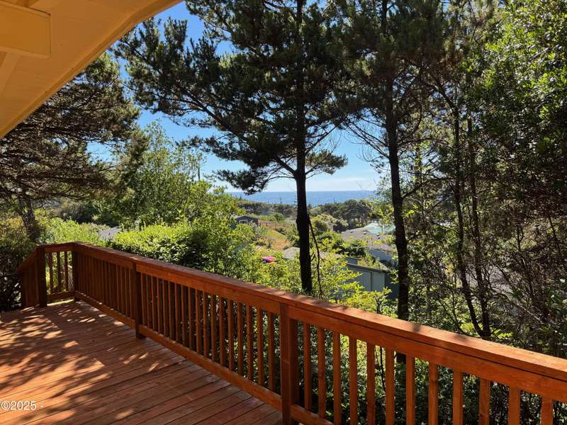 This charming Pacific Northwest cottage, located about 10 minutes from Newport or Waldport and 3 minutes from Lost Creek State Park, featuring a stunning ocean view. Large picture windows and vaulted ceilings in the dining and living areas beautifully frame the coastal panorama. The NEW ocean-facing deck is perfect for barbecues or entertaining guests. This 2 bedrooms and 1 bathroom property includes a detached garage, an enclosed back patio, and a pet-friendly yard with mature landscaping. The septic system was fully replaced in 2022 and has been professionally maintained since installation.
