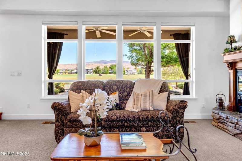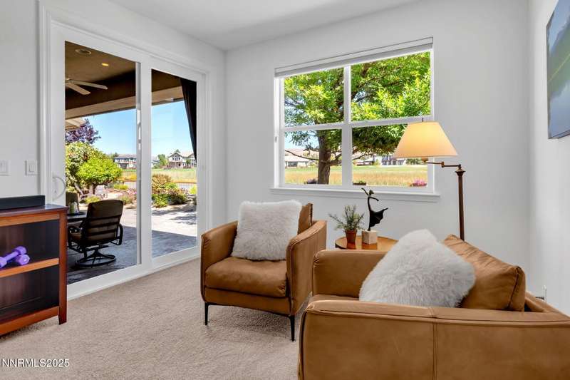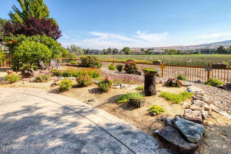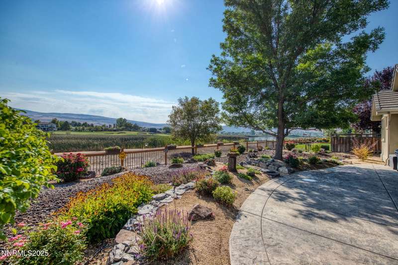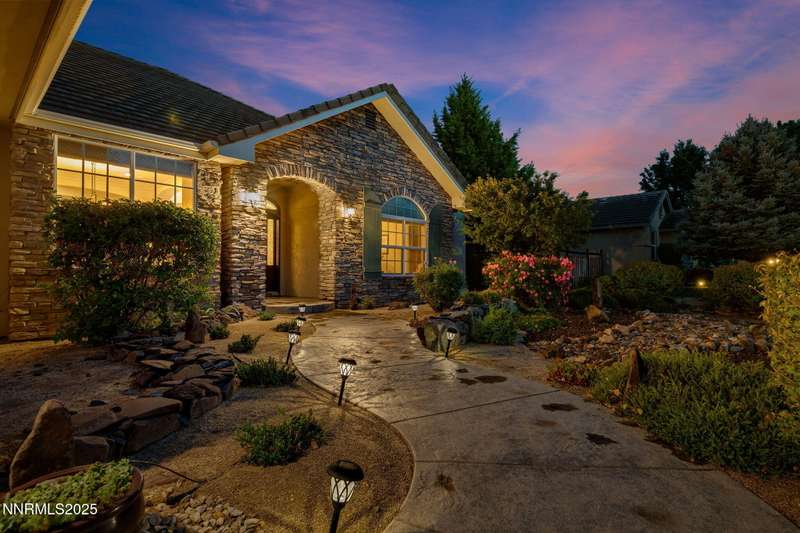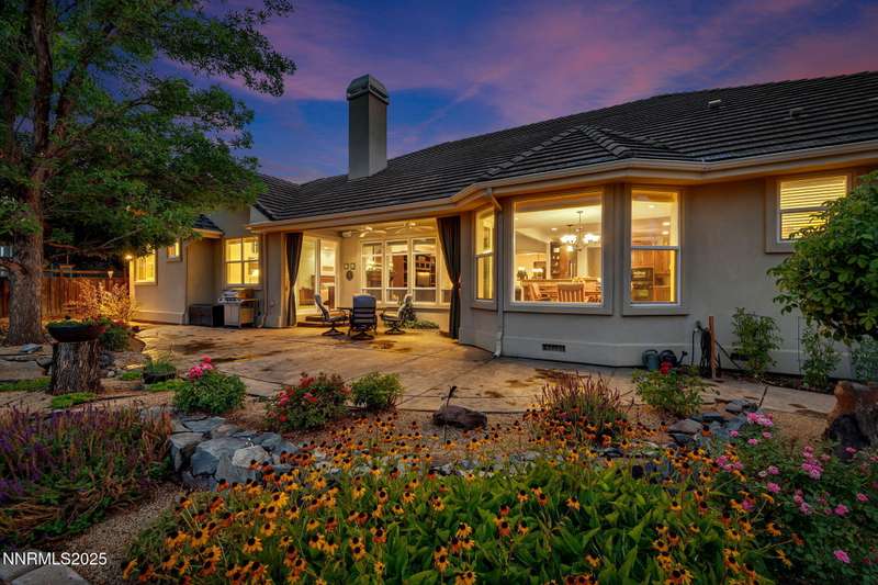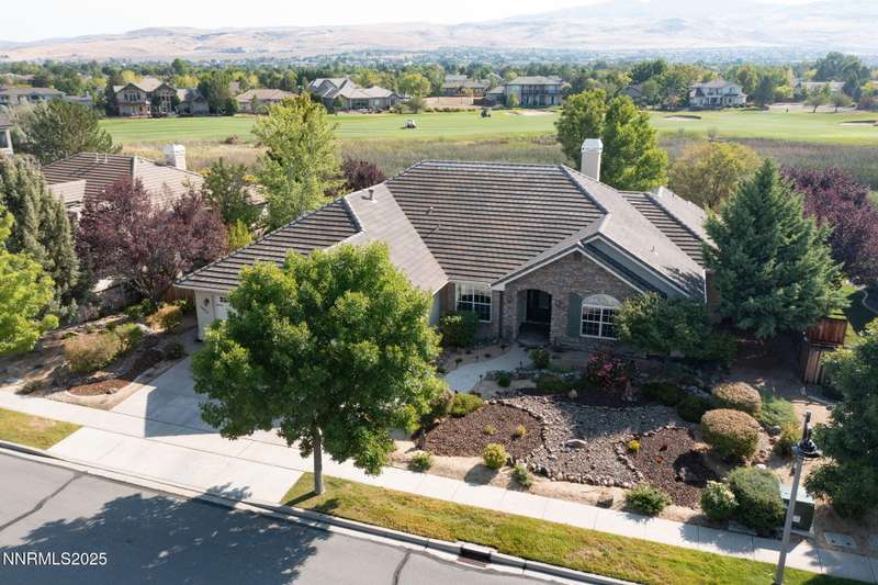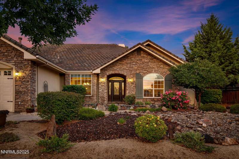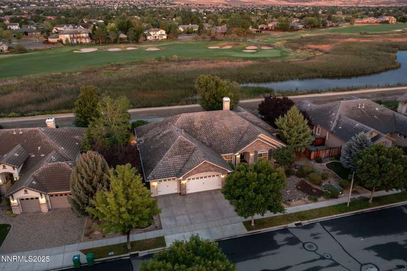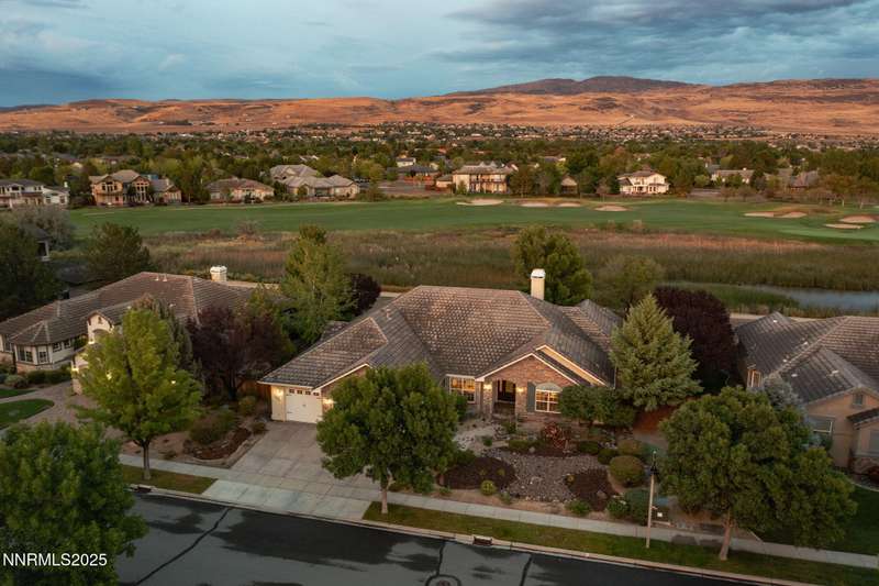 Welcome Home to Luxury Living in the Red Hawk Golf Community! This exquisite custom home offers the epitome of the Northern Nevada lifestyle, perfectly situated in the highly sought-after Red Hawk Golf Community. Residents can enjoy unparalleled access to walking trails, championship golf, a vibrant clubhouse, swimming facilities, a state-of-the-art gym, and an array of fitness classes including pilates, yoga, and spin. Convenience is key, with shopping, dining and entertainment just moments away. Step inside and be captivated by the incredible views of the Red Hawk golf course and tranquil pond, framed by expansive windows and a spacious covered patio. The open-concept floor plan seamlessly flows into the great room, the inviting heart of the home. Here, a dramatic window wall overlooks the picturesque backyard and golf course, complemented by a gas fireplace, recessed lighting, a custom entertainment center with shelves and cabinets, and brand new carpet. The gourmet kitchen is a chef's dream, offering an abundance of granite counter space, two ovens, built-in microwave, large island, wine fridge, walk-in pantry, stunning custom cabinetry, and elegant hardwood floors. A charming breakfast nook with a bay window provides the perfect spot to savor your morning coffee, bathed in natural light and surrounded by gorgeous views. The primary bedroom suite is a true sanctuary, featuring a cozy gas fireplace, direct backyard access through a glass door, a roomy sitting area, and an enormous walk-in closet. The luxurious en-suite bathroom boasts two sinks, a generously sized shower, and a jacuzzi tub with breathtaking views. Entertain in style in the stunning dining room, featuring a coffered ceiling, a dramatic chandelier, and slate tile flooring. A large bedroom conveniently located off the entry is currently utilized as an office, complete with a full en-suite bathroom and walk-in closet. Two spacious secondary bedrooms and a full bathroom are privately situated in their own wing. The extra-large laundry room is both functional and beautiful, offering a large window, ample counter space, cabinets, storage, and a dedicated work station ideal for a sewing machine or crafting. Elegant hardwood floors grace the entrance, hallways, and kitchen, while brand new upgraded carpet adds comfort to the great room, primary bedroom, and office/fourth bedroom. New fresh white paint. Throughout the home you'll discover several extra-large storage closets, providing abundant space for all your needs. Embrace outdoor living on the eastern-faced covered patio, designed for enjoying sunny mornings and cool evenings, complete with ceiling fans and recessed lighting. The backyard is a private oasis, featuring mature trees, grape vines draping over a charming trellis, a variety of inviting seating areas, seasonal flowers, vibrant roses, decorative flower boxes, and striking rock landscaping - a truly lovely yard to enjoy all year round.