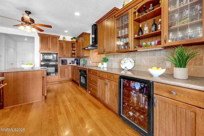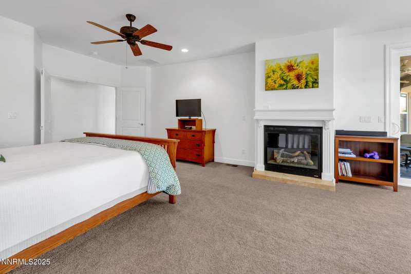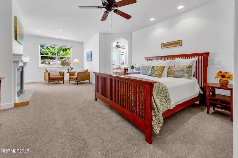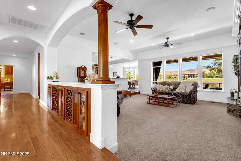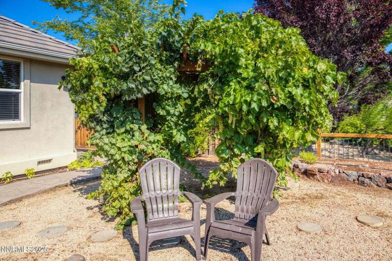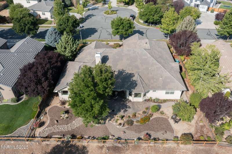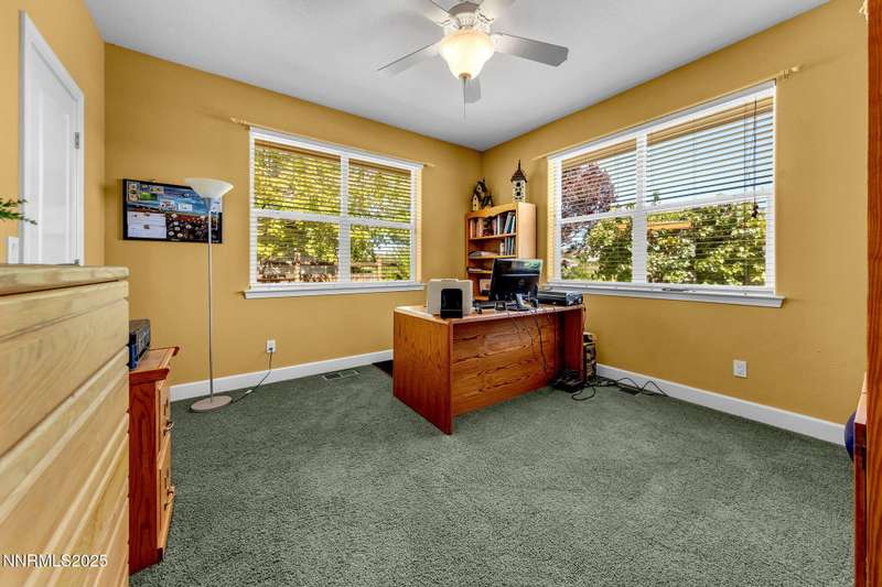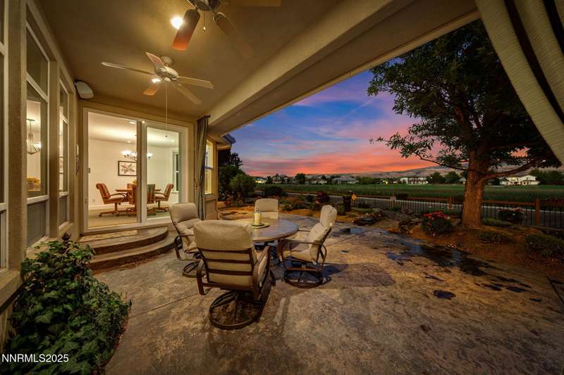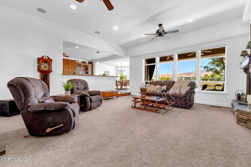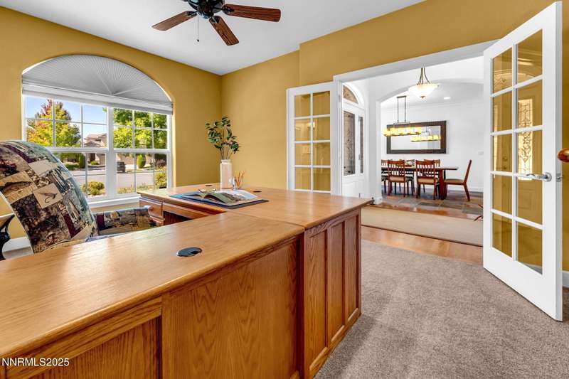 Welcome Home to Luxury Living in the Red Hawk Golf Community! This exquisite custom home offers the epitome of the Northern Nevada lifestyle, perfectly situated in the highly sought-after Red Hawk Golf Community. Residents can enjoy unparalleled access to walking trails, championship golf, a vibrant clubhouse, swimming facilities, a state-of-the-art gym, and an array of fitness classes including pilates, yoga, and spin. Convenience is key, with shopping, dining and entertainment just moments away. Step inside and be captivated by the incredible views of the Red Hawk golf course and tranquil pond, framed by expansive windows and a spacious covered patio. The open-concept floor plan seamlessly flows into the great room, the inviting heart of the home. Here, a dramatic window wall overlooks the picturesque backyard and golf course, complemented by a gas fireplace, recessed lighting, a custom entertainment center with shelves and cabinets, and brand new carpet. The gourmet kitchen is a chef's dream, offering an abundance of granite counter space, two ovens, built-in microwave, large island, wine fridge, walk-in pantry, stunning custom cabinetry, and elegant hardwood floors. A charming breakfast nook with a bay window provides the perfect spot to savor your morning coffee, bathed in natural light and surrounded by gorgeous views. The primary bedroom suite is a true sanctuary, featuring a cozy gas fireplace, direct backyard access through a glass door, a roomy sitting area, and an enormous walk-in closet. The luxurious en-suite bathroom boasts two sinks, a generously sized shower, and a jacuzzi tub with breathtaking views. Entertain in style in the stunning dining room, featuring a coffered ceiling, a dramatic chandelier, and slate tile flooring. A large bedroom conveniently located off the entry is currently utilized as an office, complete with a full en-suite bathroom and walk-in closet. Two spacious secondary bedrooms and a full bathroom are privately situated in their own wing. The extra-large laundry room is both functional and beautiful, offering a large window, ample counter space, cabinets, storage, and a dedicated work station ideal for a sewing machine or crafting. Elegant hardwood floors grace the entrance, hallways, and kitchen, while brand new upgraded carpet adds comfort to the great room, primary bedroom, and office/fourth bedroom. New fresh white paint. Throughout the home you'll discover several extra-large storage closets, providing abundant space for all your needs. Embrace outdoor living on the eastern-faced covered patio, designed for enjoying sunny mornings and cool evenings, complete with ceiling fans and recessed lighting. The backyard is a private oasis, featuring mature trees, grape vines draping over a charming trellis, a variety of inviting seating areas, seasonal flowers, vibrant roses, decorative flower boxes, and striking rock landscaping - a truly lovely yard to enjoy all year round.