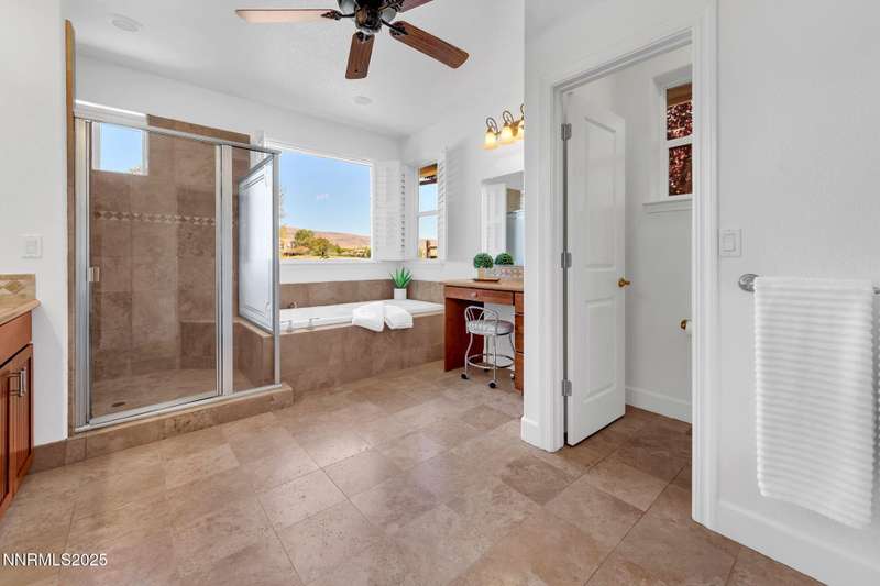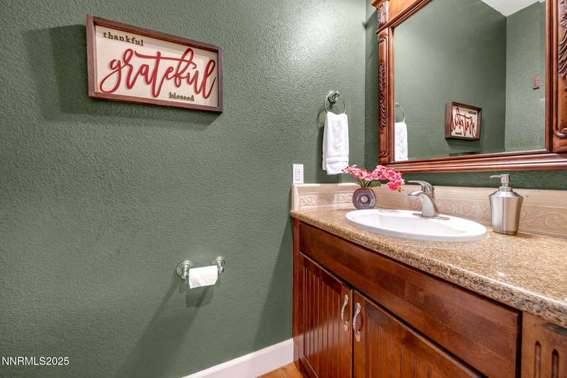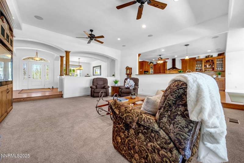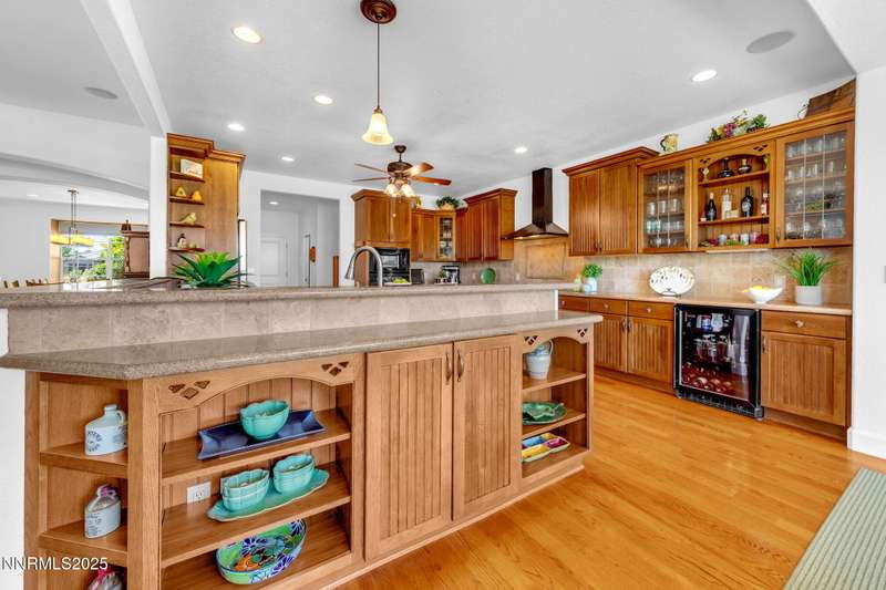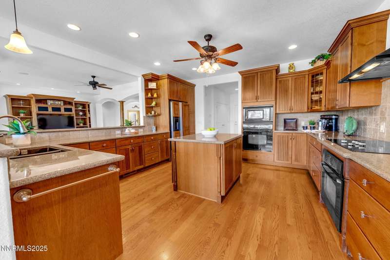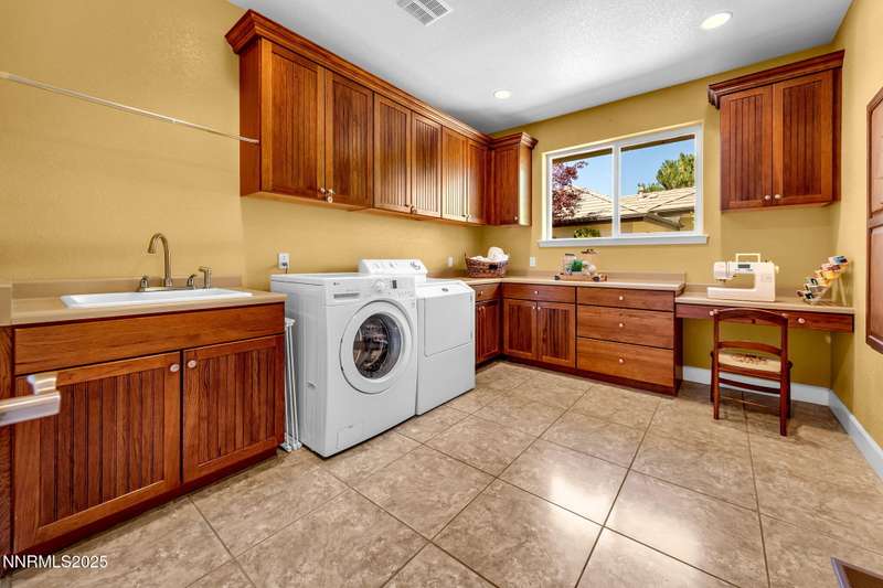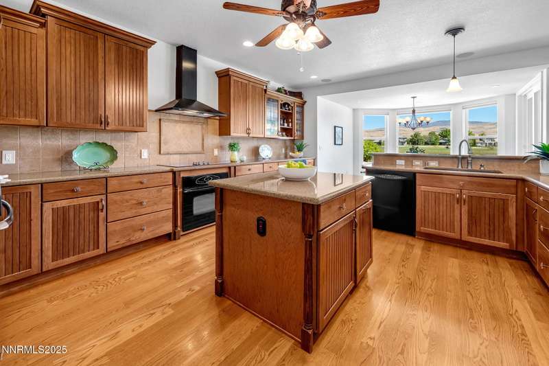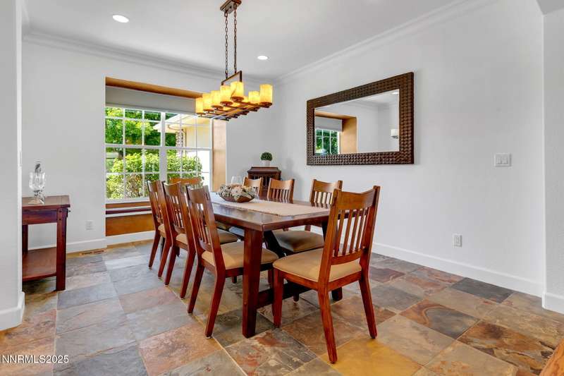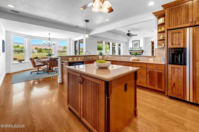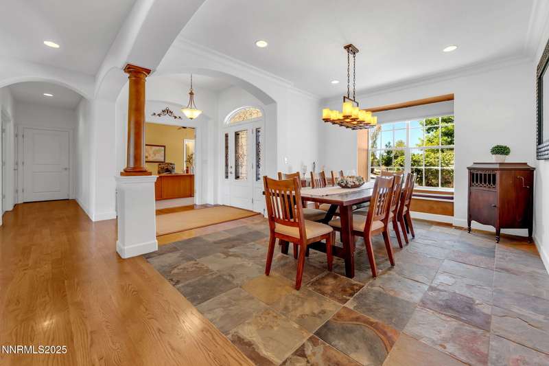 Welcome Home to Luxury Living in the Red Hawk Golf Community! This exquisite custom home offers the epitome of the Northern Nevada lifestyle, perfectly situated in the highly sought-after Red Hawk Golf Community. Residents can enjoy unparalleled access to walking trails, championship golf, a vibrant clubhouse, swimming facilities, a state-of-the-art gym, and an array of fitness classes including pilates, yoga, and spin. Convenience is key, with shopping, dining and entertainment just moments away. Step inside and be captivated by the incredible views of the Red Hawk golf course and tranquil pond, framed by expansive windows and a spacious covered patio. The open-concept floor plan seamlessly flows into the great room, the inviting heart of the home. Here, a dramatic window wall overlooks the picturesque backyard and golf course, complemented by a gas fireplace, recessed lighting, a custom entertainment center with shelves and cabinets, and brand new carpet. The gourmet kitchen is a chef's dream, offering an abundance of granite counter space, two ovens, built-in microwave, large island, wine fridge, walk-in pantry, stunning custom cabinetry, and elegant hardwood floors. A charming breakfast nook with a bay window provides the perfect spot to savor your morning coffee, bathed in natural light and surrounded by gorgeous views. The primary bedroom suite is a true sanctuary, featuring a cozy gas fireplace, direct backyard access through a glass door, a roomy sitting area, and an enormous walk-in closet. The luxurious en-suite bathroom boasts two sinks, a generously sized shower, and a jacuzzi tub with breathtaking views. Entertain in style in the stunning dining room, featuring a coffered ceiling, a dramatic chandelier, and slate tile flooring. A large bedroom conveniently located off the entry is currently utilized as an office, complete with a full en-suite bathroom and walk-in closet. Two spacious secondary bedrooms and a full bathroom are privately situated in their own wing. The extra-large laundry room is both functional and beautiful, offering a large window, ample counter space, cabinets, storage, and a dedicated work station ideal for a sewing machine or crafting. Elegant hardwood floors grace the entrance, hallways, and kitchen, while brand new upgraded carpet adds comfort to the great room, primary bedroom, and office/fourth bedroom. New fresh white paint. Throughout the home you'll discover several extra-large storage closets, providing abundant space for all your needs. Embrace outdoor living on the eastern-faced covered patio, designed for enjoying sunny mornings and cool evenings, complete with ceiling fans and recessed lighting. The backyard is a private oasis, featuring mature trees, grape vines draping over a charming trellis, a variety of inviting seating areas, seasonal flowers, vibrant roses, decorative flower boxes, and striking rock landscaping - a truly lovely yard to enjoy all year round.
