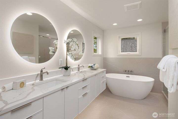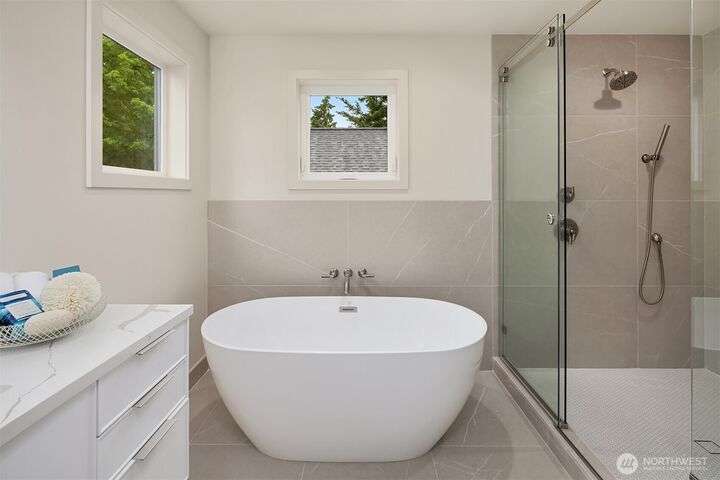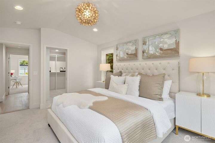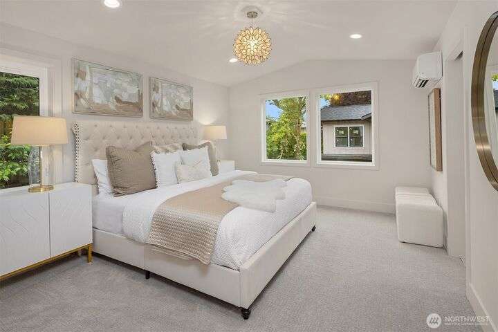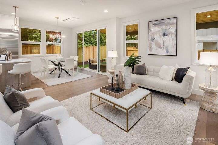 New construction by DKWozniak Design Build with a coastal flair in coveted West of Market. Light-filled main level features open living, dining, and kitchen with gas fireplace, built-ins, and sliders to a covered patio and fenced yard—perfect for indoor/outdoor living. Kitchen shines with Monogram appliances and custom cabinetry, with drybar in the dining room. Upstairs offers a serene primary suite, two additional bedrooms, full bath, and oversize laundry with extensive storage. Fully finished basement includes a spacious rec room for entertaining, dry bar with beverage fridge, plus guest bed and bath. Enjoy proximity to Lake Washington, Waverly Beach Park, and downtown Kirkland. EV-ready garage completes this home!