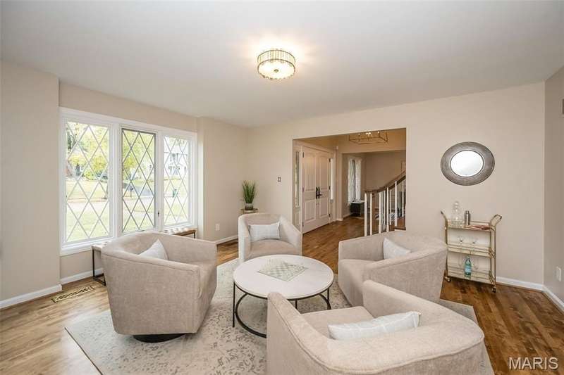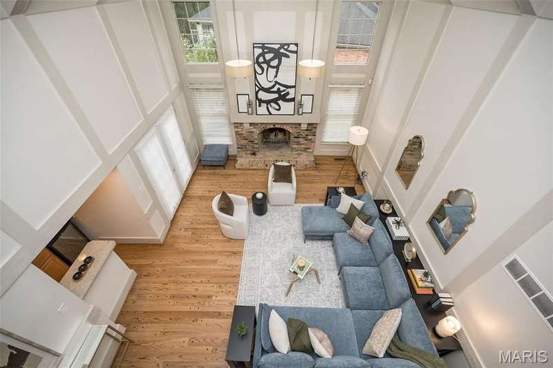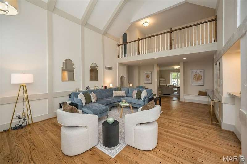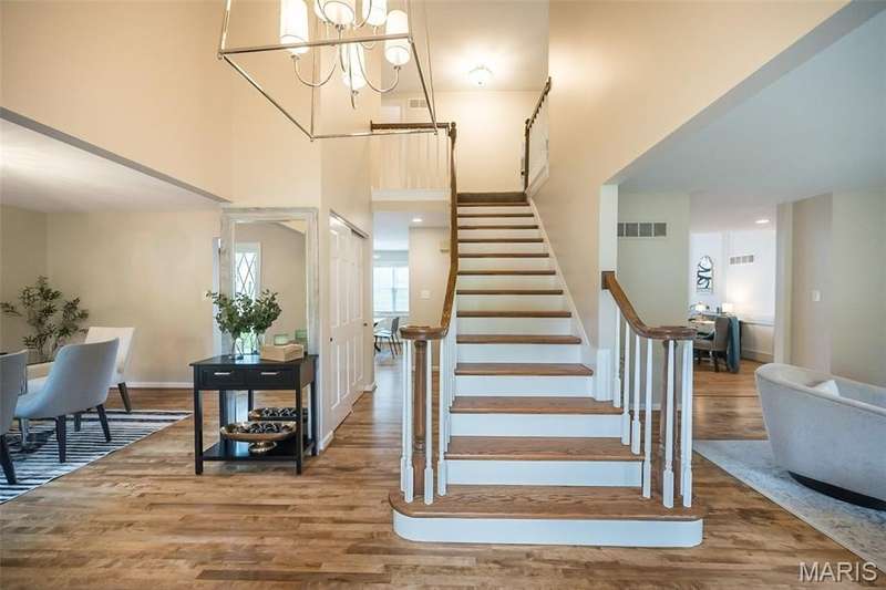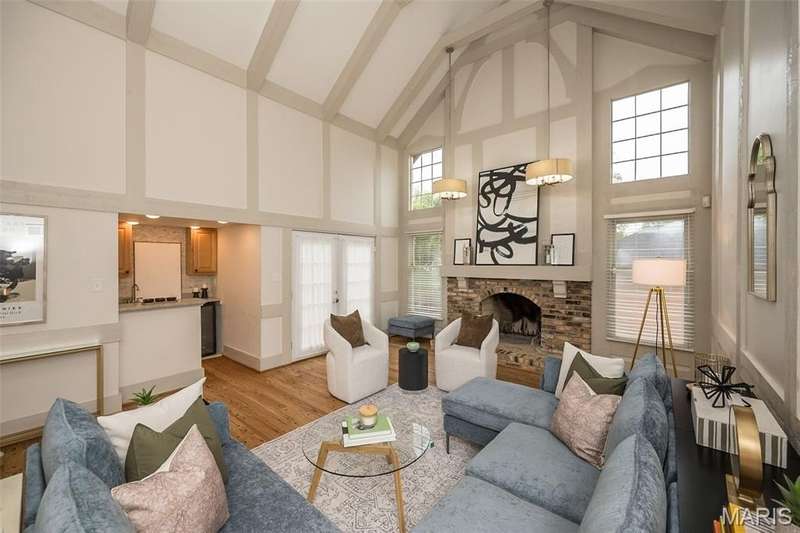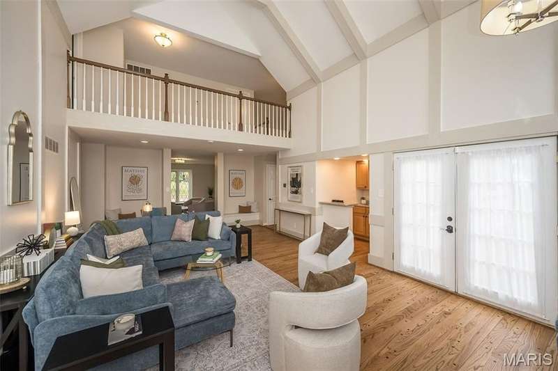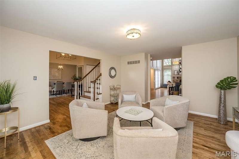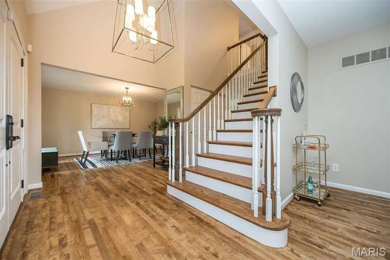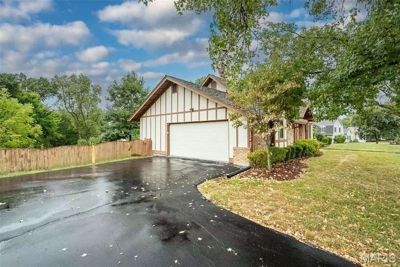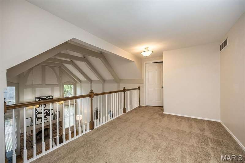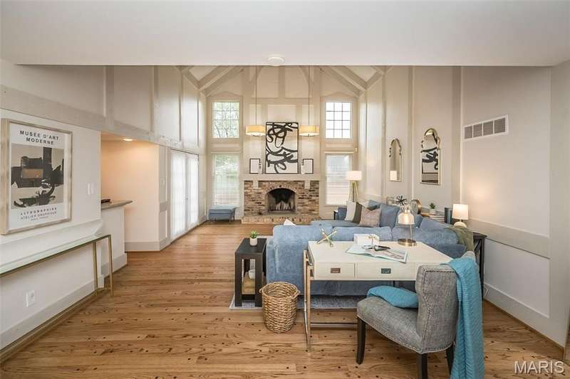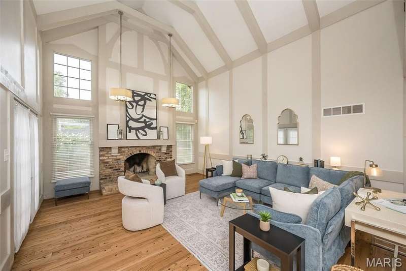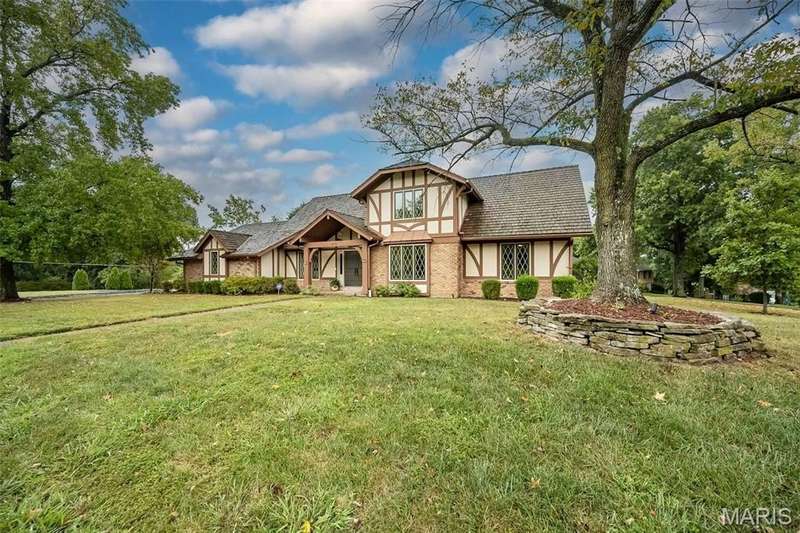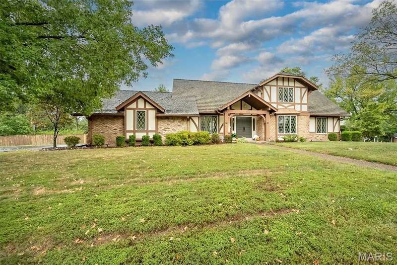 Simply SPECTACULAR! Welcome to 1710 Lynkirk Lane ~ a unique "Chalet-like" architectural gem that's perfectly positioned on a gorgeous .50 acre lot in the coveted Briar Hill Farm Subdivision! This 1 1/2 story stunner proudly boasts 3200+ sq. ft. with 5 bedrooms, 3 1/2 baths and exudes a one-of-a kind style and personality plus! Be greeted by the grand entry that is the perfect precursor to what lies within: formal dining room with chic chandelier, classy sitting room/study that leads into the STUNNING great room with soaring 20 ft. ceilings and distinctive Tudor accents that consist of rough sawn wood, angles, arches and beams that creatively define it's dramatic space. The focal fireplace is a true showstopper and is flanked by floor to ceiling windows, French doors and a wet bar that's perfect for entertaining. The sunny eat-in kitchen is very attractive with custom wood cabinetry, rich granite countertops, sleek subway backsplash, stainless appliance package, pantry and easy access to the laundry/mud room! You will LOVE the spacious MAIN FLOOR primary suite that is oh-so dreamy: large walk-in closet, spa-like bathroom with beautiful travertine floors, double bowl cabinet vanity, oversized walk-in shower and linen closet. Head upstairs to find (3) expansive bedrooms that are each equipped with plenty of closet space, a neat "flex" loft-like area and a large hall bath with double bowl cabinet vanity and tub/shower combo. Need more space? No problem! The lower level is AMAZING: rec/media room that sports recessed lighting and custom built-ins, private ensuite with stylish designer vanity, walk-in shower and linen closet! There's an additional room that could be used as an office, workout area or sleeping area...lots of options! Not to miss: GORGEOUS refinished floors, beautiful fenced yard with patio, oversized 2-car garage, meticulously maintained systems, subdivision pool, tennis courts and private clubhouse, highly rated Kirkwood School District and a PRIMO location! Don't miss this one folks!