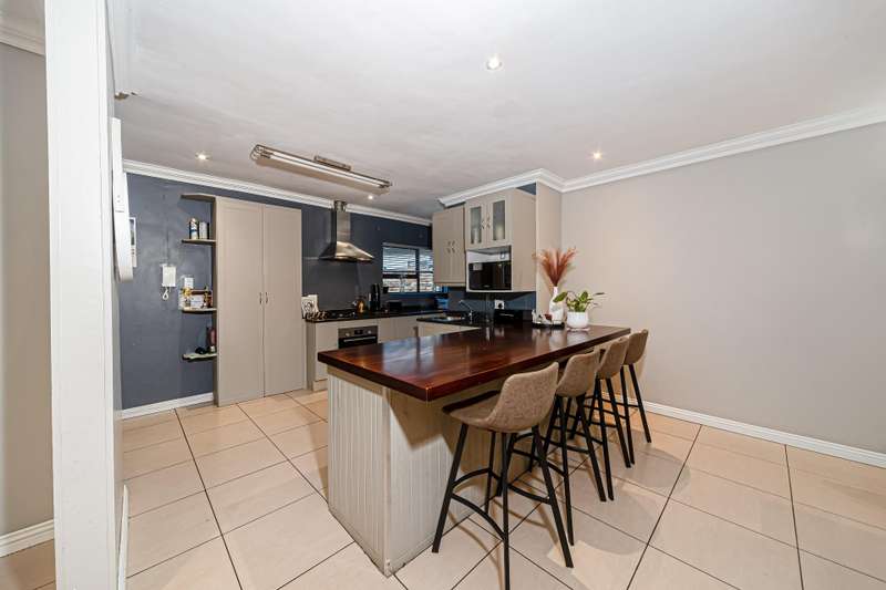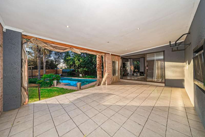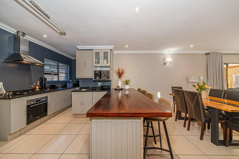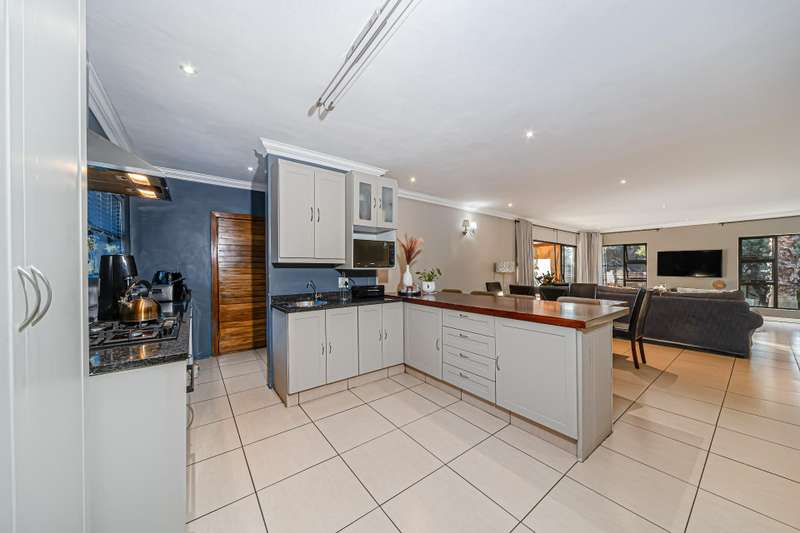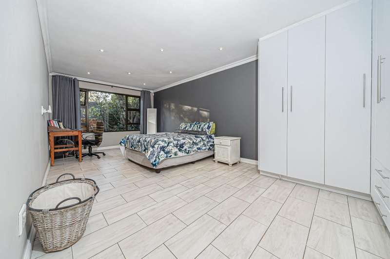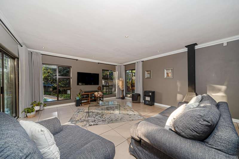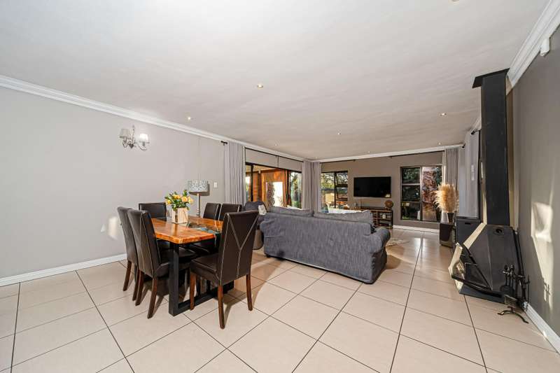 The wonderful open plan kitchen which comes complete with a walk in pantry, breakfast bar and an offset scullery, boasts a varied use of materials to create the dream every chef has of a high end designer setting that offers the functionality needed for everyday use which overlooks the open plan lounge and dining areas which combine light and bright tones which extend out to the pool and garden areas offering a clear line of sight to the outdoors which can be enjoyed from the oversized covered patio area which comes complete with a built in braai area and a very functional prep station and a feature wall all which is accessed from the lounge area through aluminium sliding doors. The lounge areas also feature a fireplace which will keep the living areas of this home warm whilst the windows cleverly bring in the surrounding greenery into these cosy living spaces which are sure be a hit with all your guests.