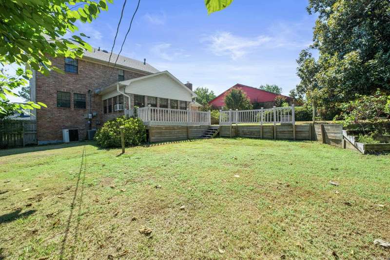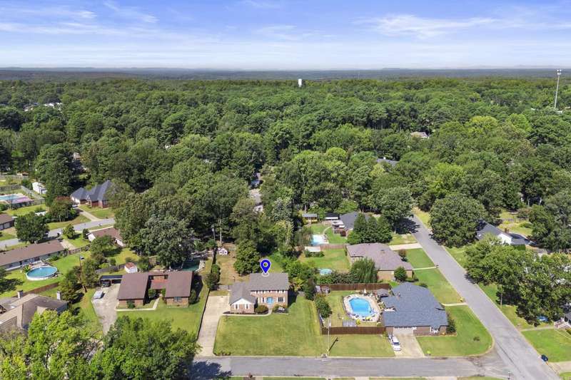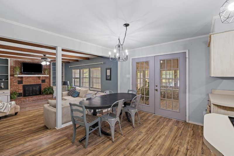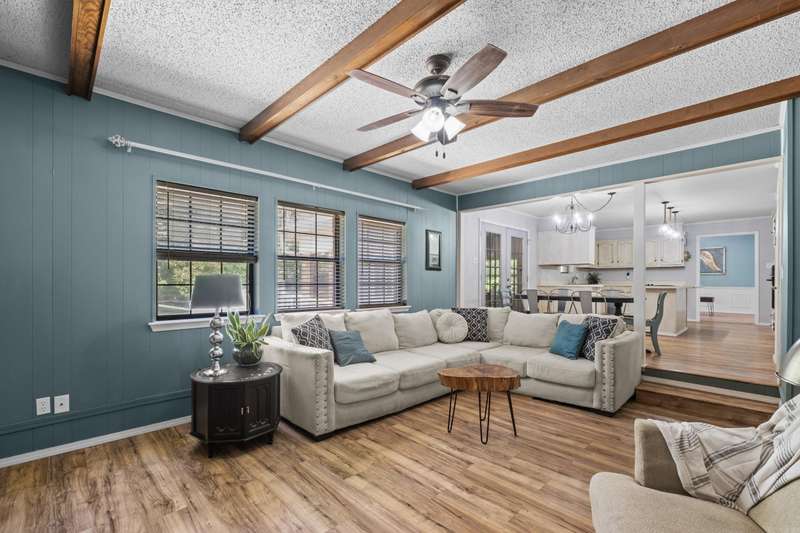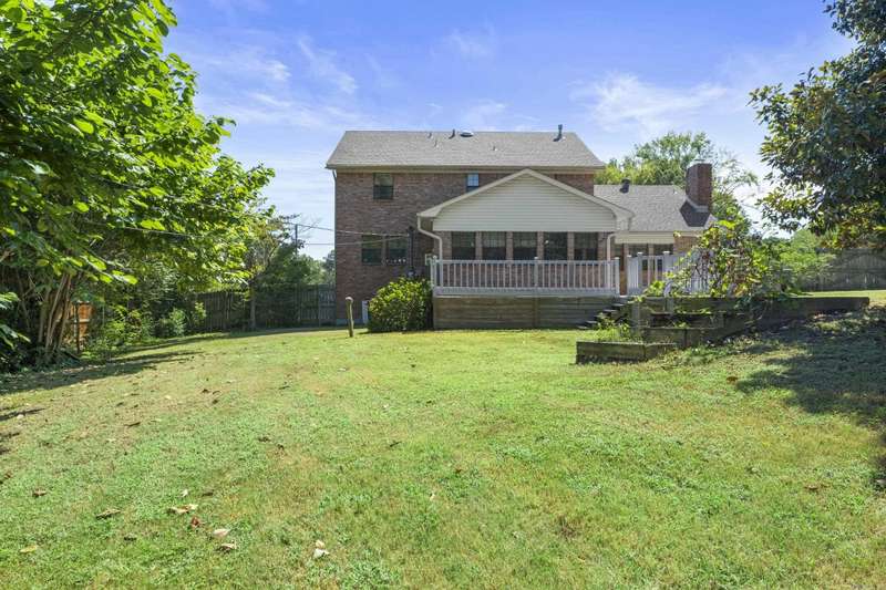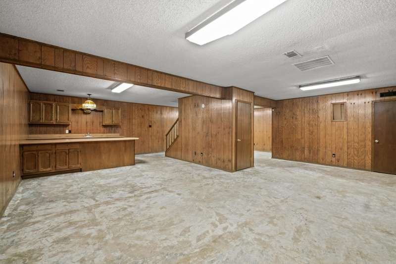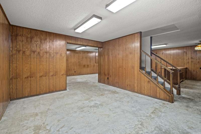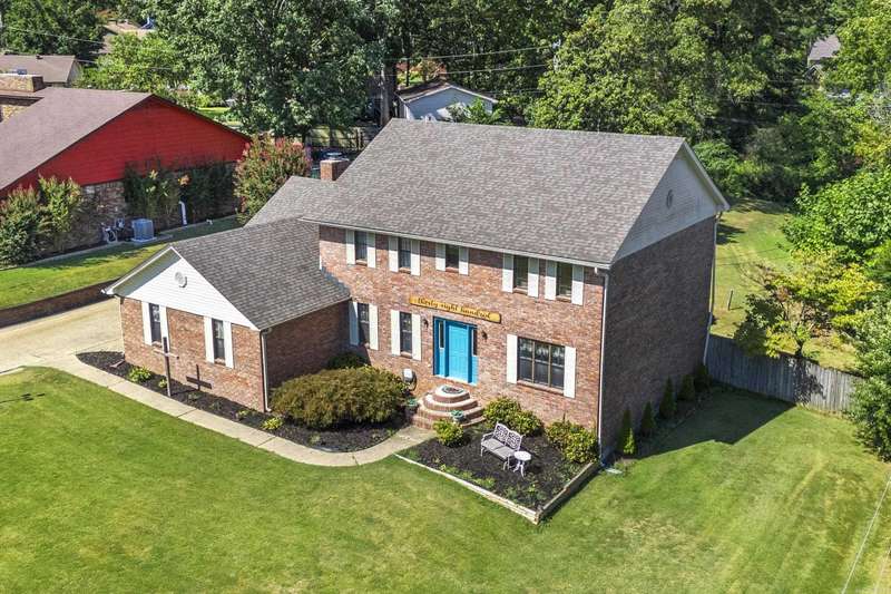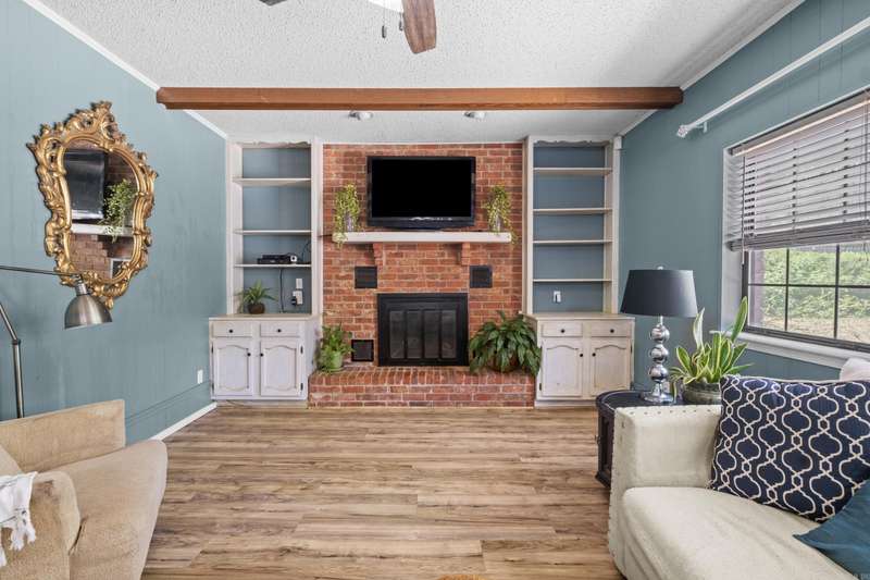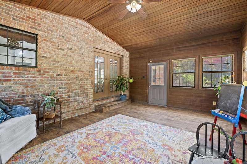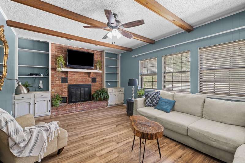 Welcome to this spacious 5-bedroom brick home featuring classic charm and modern updates. Inside, you'll find a warm living room with wood beamed ceilings, a cozy brick fireplace, and built-in shelving that creates a perfect gathering space. The home also includes a closed sunroom, ideal for year-round enjoyment, and a finished basement offering endless possibilities for entertainment or extra living space. Outside, the beautifully maintained yard and striking blue front door add curb appeal, while mature trees provide shade and privacy. This home combines comfort, character, and plenty of room to grow - ready for its next chapter.