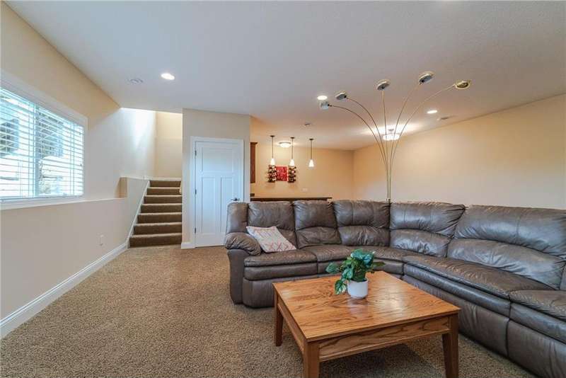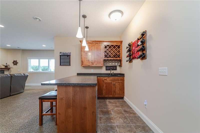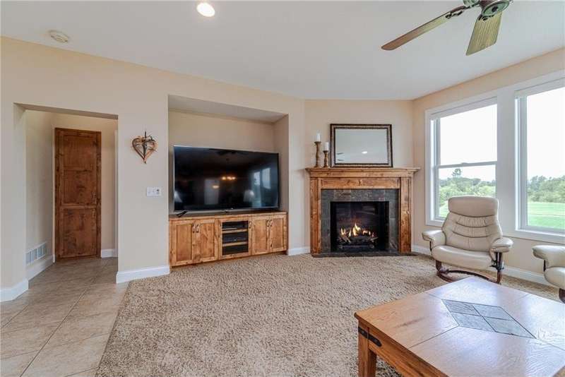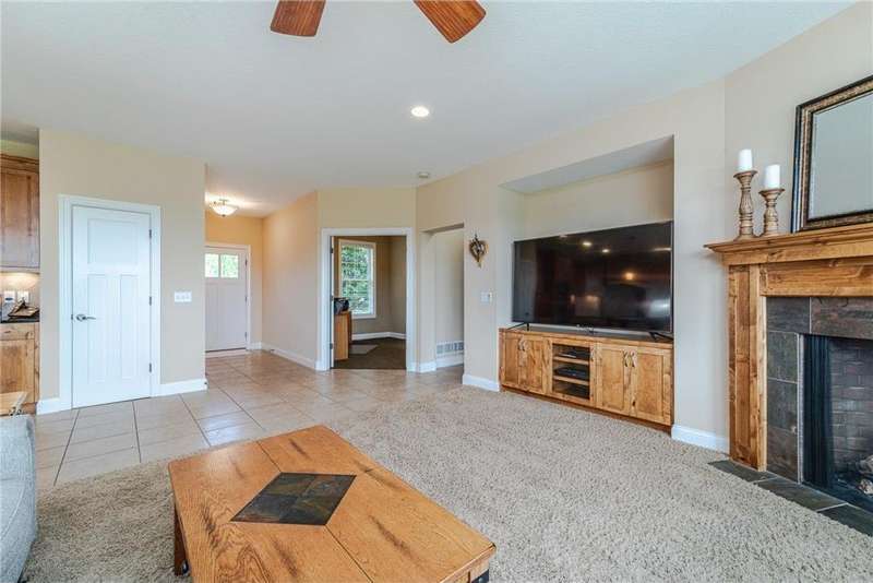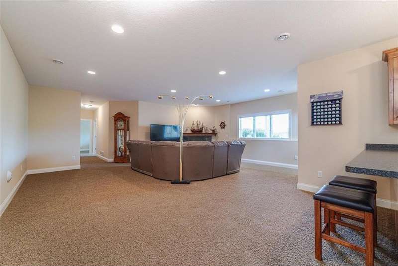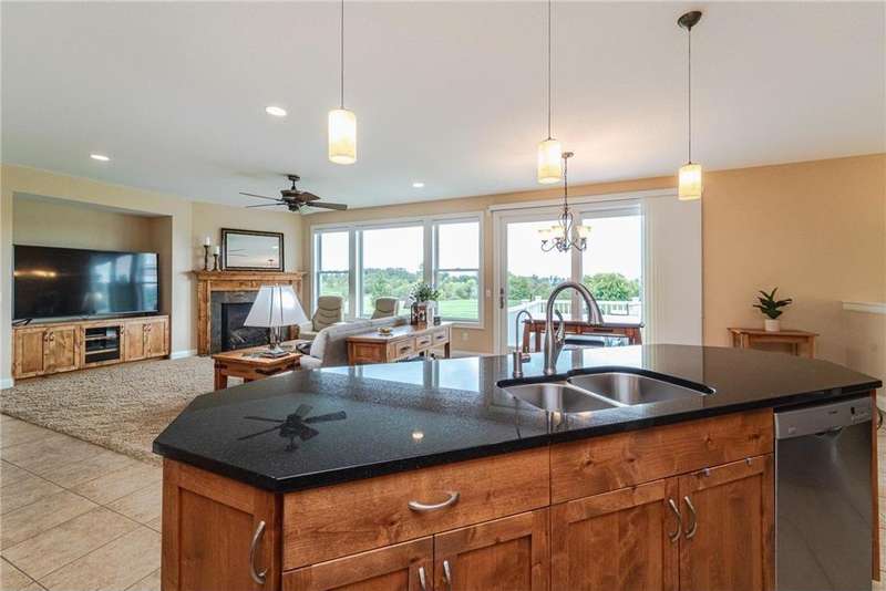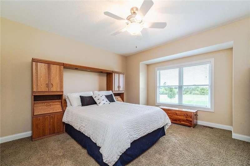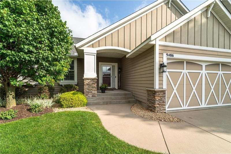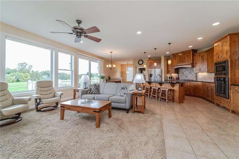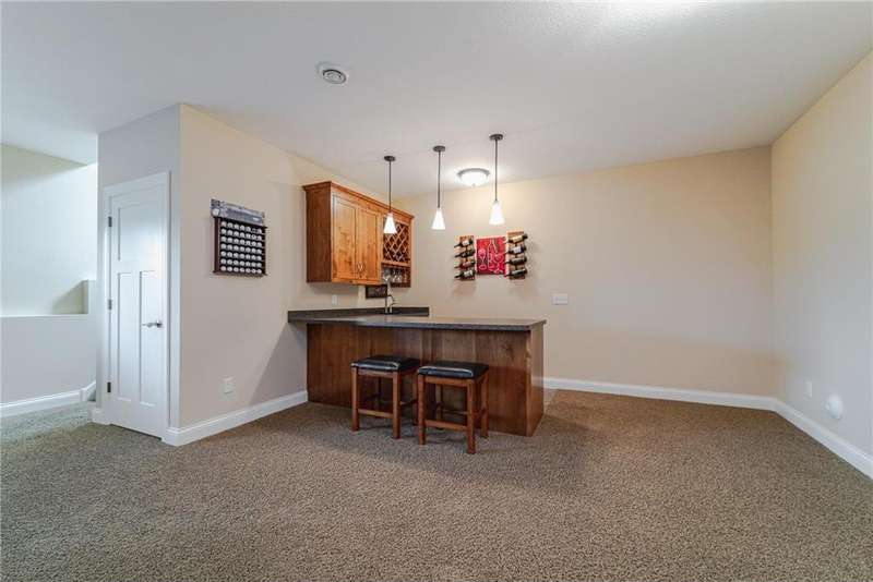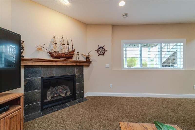 WALLS OF WINDOWS frame the view of the 12th fairway at BOULDER POINTE GOLF COURSE in this bright and spacious rambler custom-built by McDonald Construction. The expansive floor plan is bright and open, and oriented towards golf course views. The kitchen features custom, shaker style alder cabinetry with granite countertops and a suite of BOSCH stainless appliances including a wall oven, and a walk-in pantry. It opens to a spacious dining space and the family room with a gas fireplace and golf course views. The primary suite also overlooks the course and has a private adjoined bath with dual sinks and a walk-in closet. Downstairs you’ll find a spacious family room with a wet bar, two BRs and a 3/4 bath. Additional features include a main floor den with French doors, practical mudroom/laundry spaces, white 3-panel doors and trim, remote controlled living room blinds, and a composite deck. The beautiful exterior features board and batten details and stone-wrapped columns!