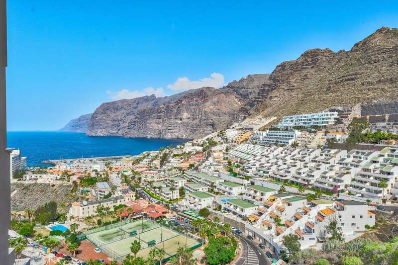 The resort has 4 entrances with the main one being on the 8th floor. There are 5 elevators in the resort one of which has panoramic views over the large, heated communal swimming pool and a separate children’s pool, surrounded by a large solarium area and gardens. The central area of the building has a waterfall feature which adds to the relaxing atmosphere within the resort. Security cameras in corridors and garage ensure the safety of owners. The resort is close to all amenities with large supermarkets close by as well as one on site. A dentist and hairdresser are also available on site and the town centres of Playa de La Arena and Los Gigantes are within easy walking distance.